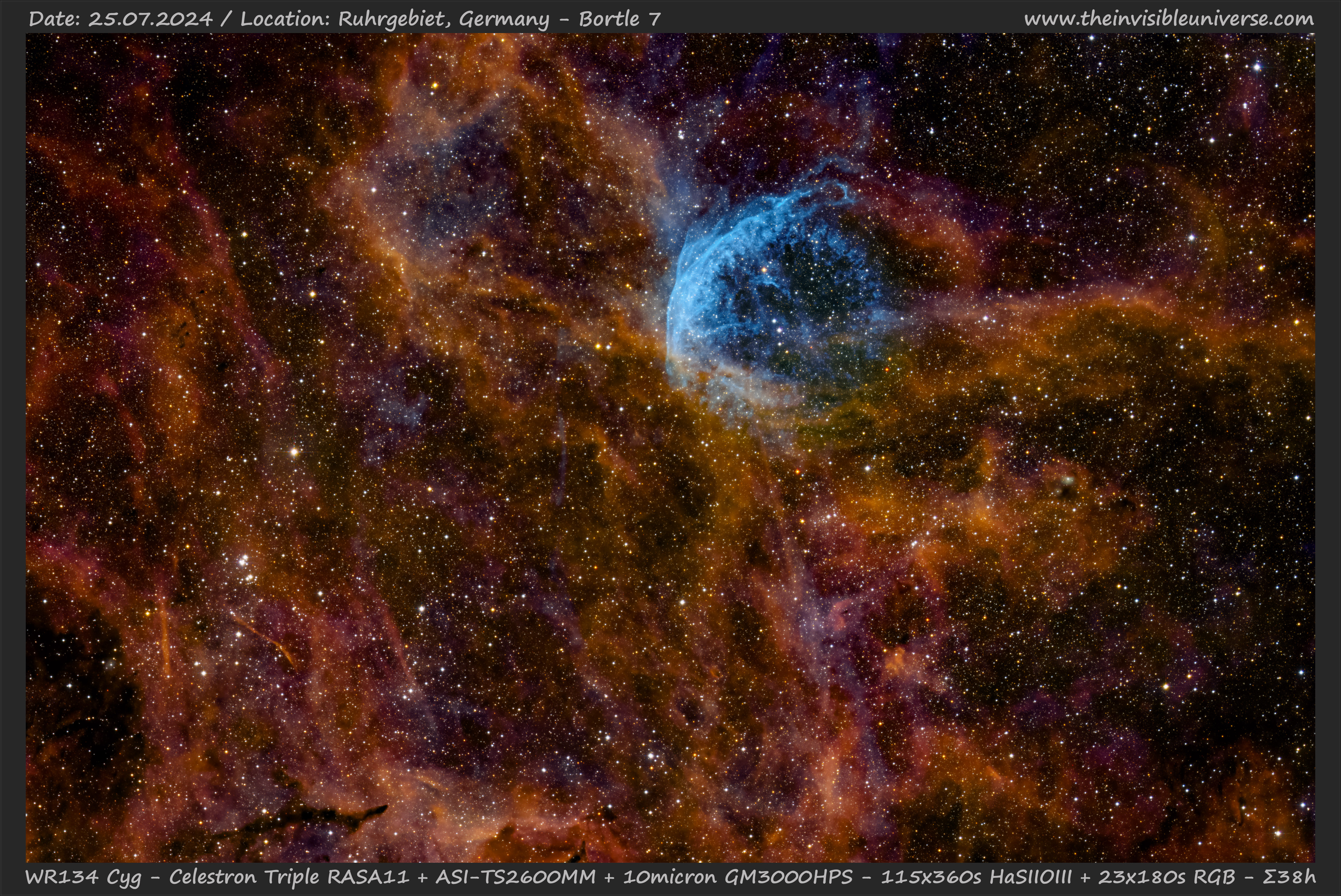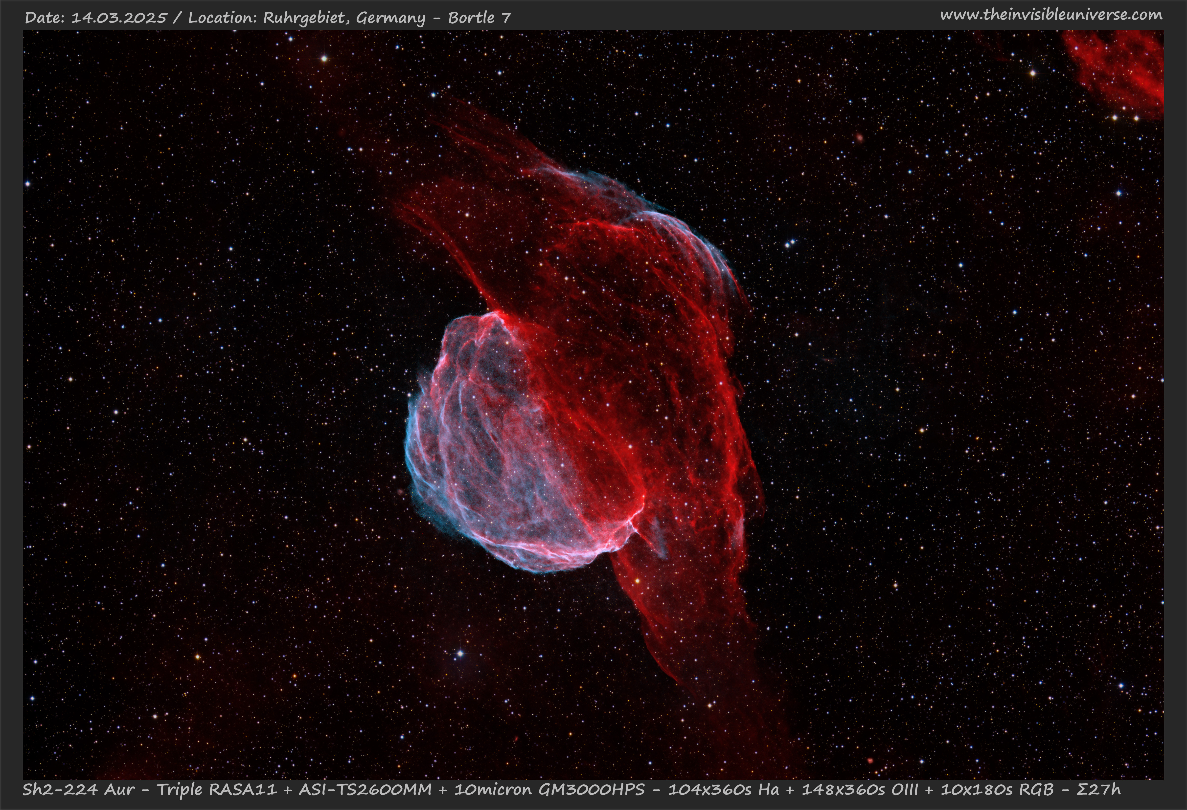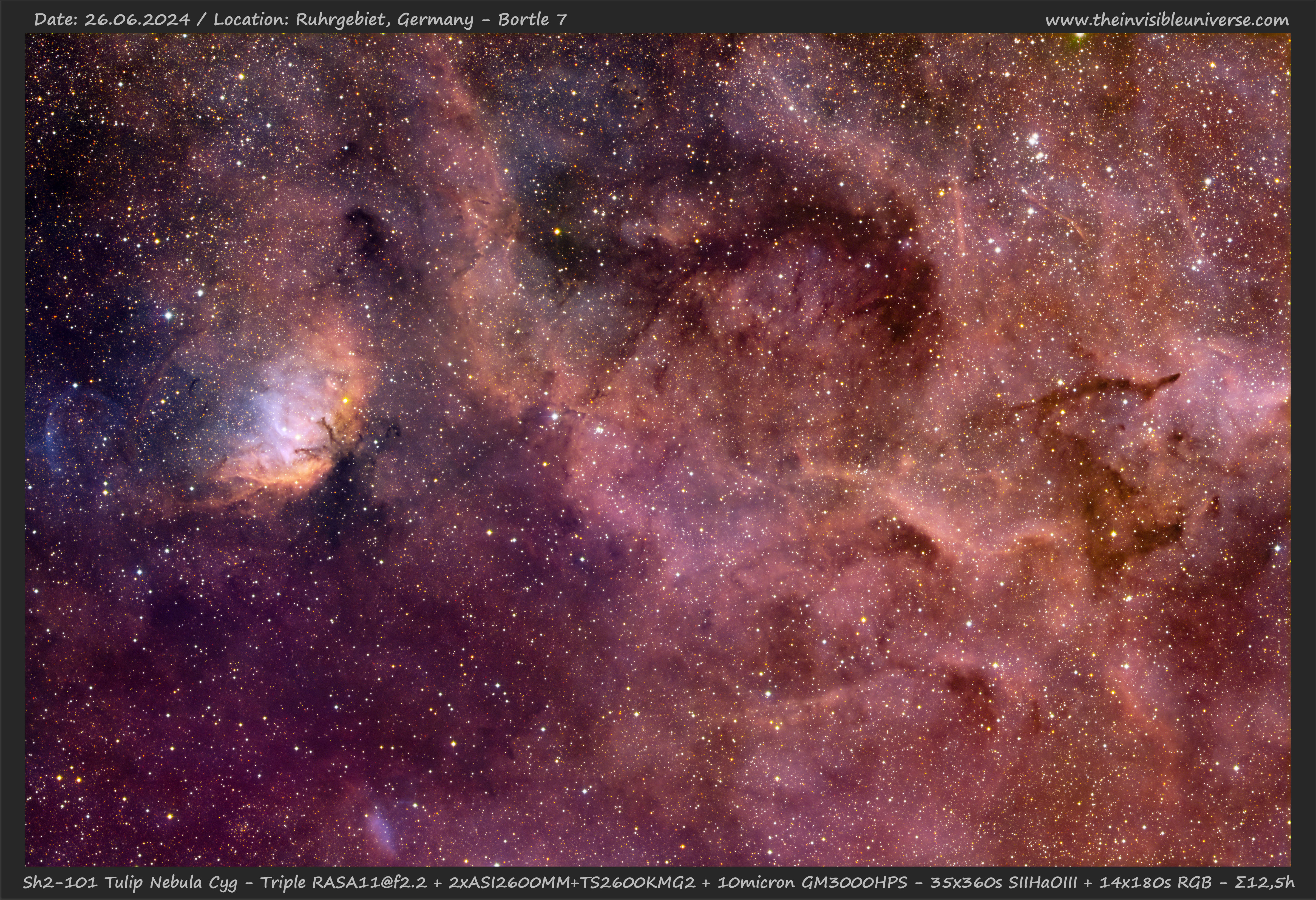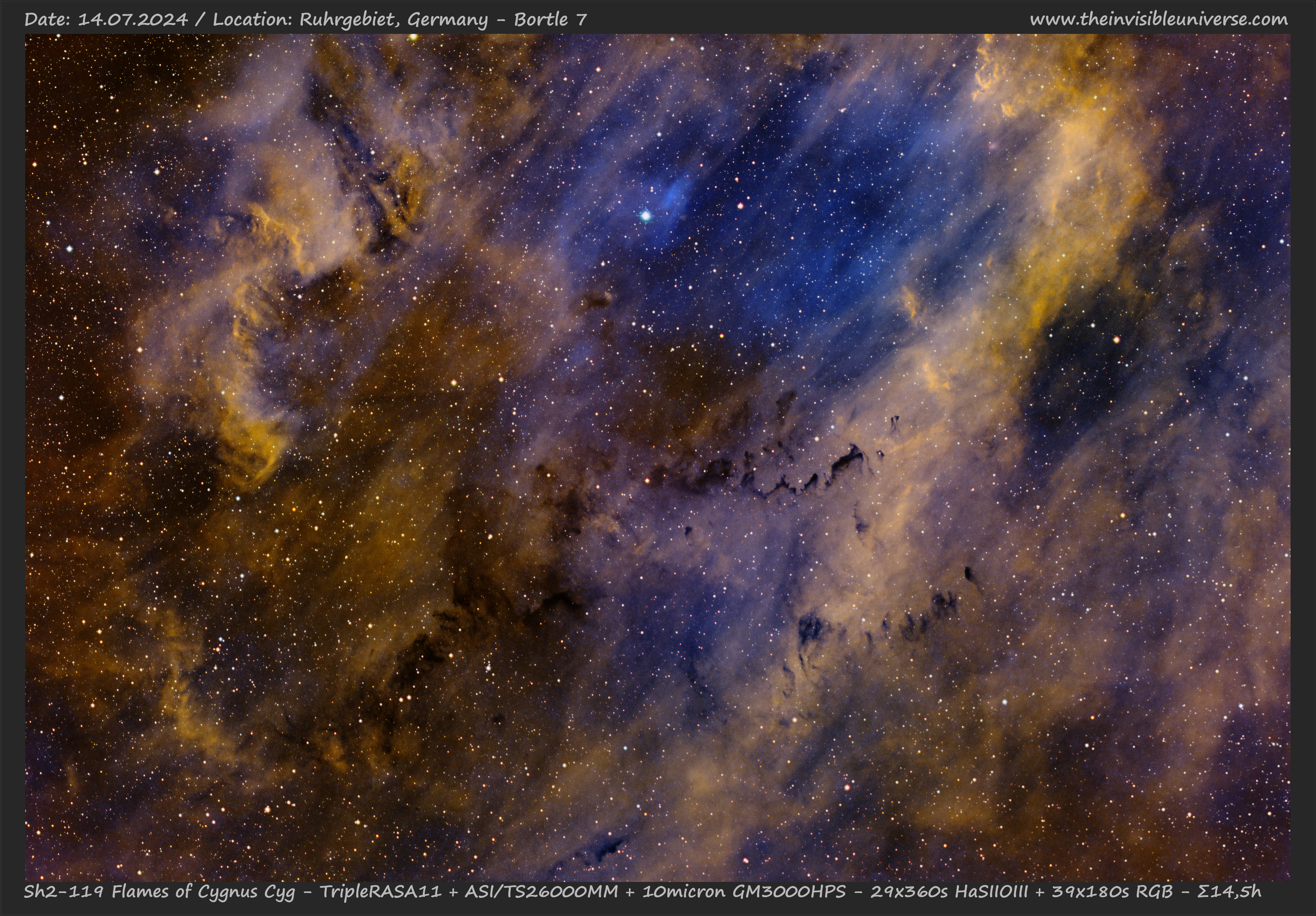 60x360s HaOIIISII + 60x180s RGB per channel. Total integration time of 27h. Triple Celestron RASA11 Astrograph + Baader 2" Highspeed Filters + 2x ASI2600MM + TS2600KMG2. Self Guided by 50 Star predictive guding model with the 10micron GM3000HPS. N.I.N.A. Astro Imaging Suite in my backyard observatory. Location: Ruhrgebiet, Germany, Bortle Class 7.