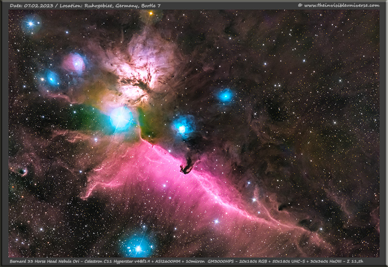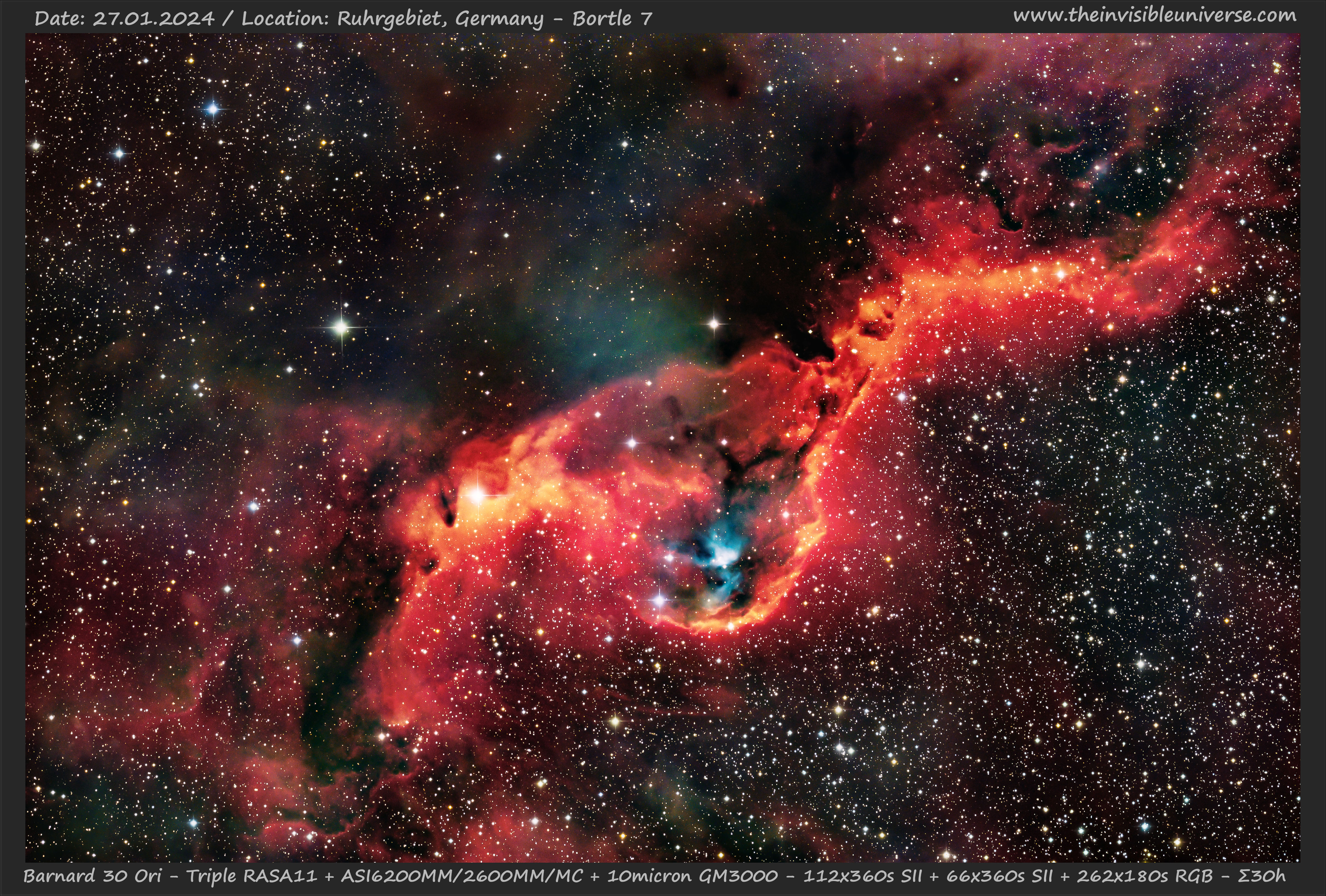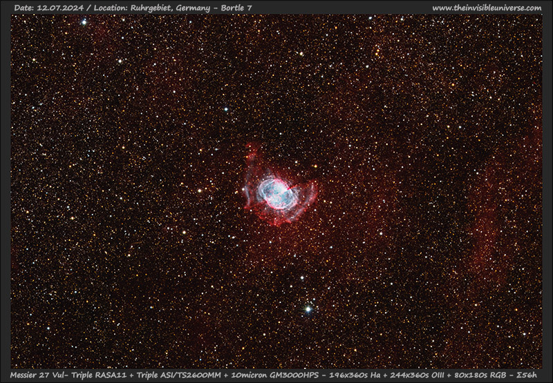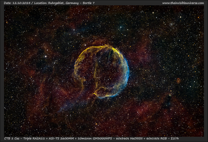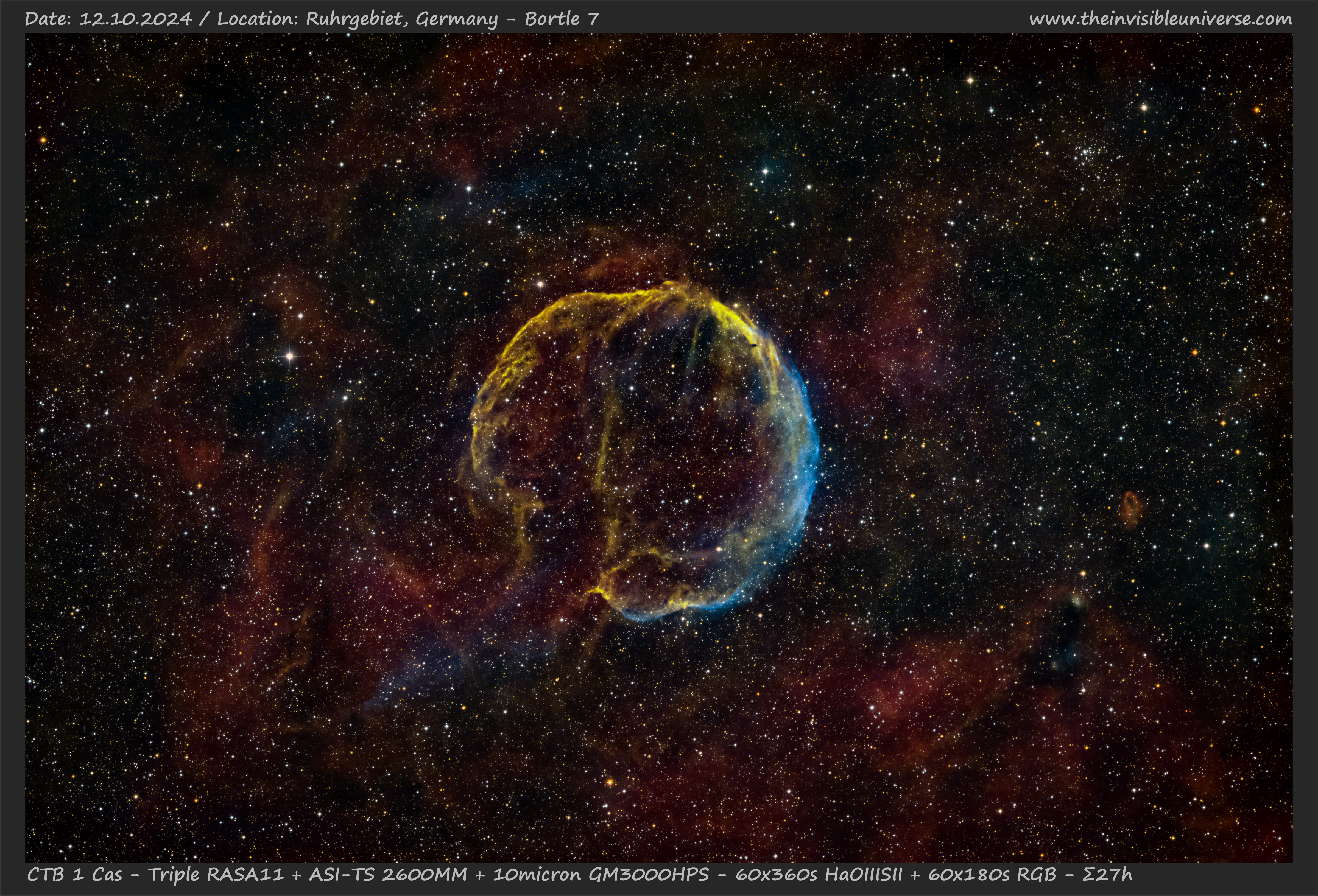 60x360s HaOIIISII + 60x180s RGB per channel. Total integration time of 27h. Triple Celestron RASA11 Astrograph + Baader 2" Highspeed Filters + 2x ASI2600MM + TS2600KMG2. Self Guided by 50 Star predictive guding model with the 10micron GM3000HPS. N.I.N.A. Astro Imaging Suite in my backyard observatory. Location: Ruhrgebiet, Germany, Bortle Class 7.