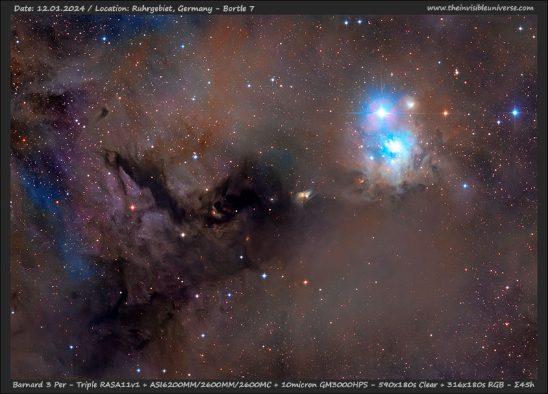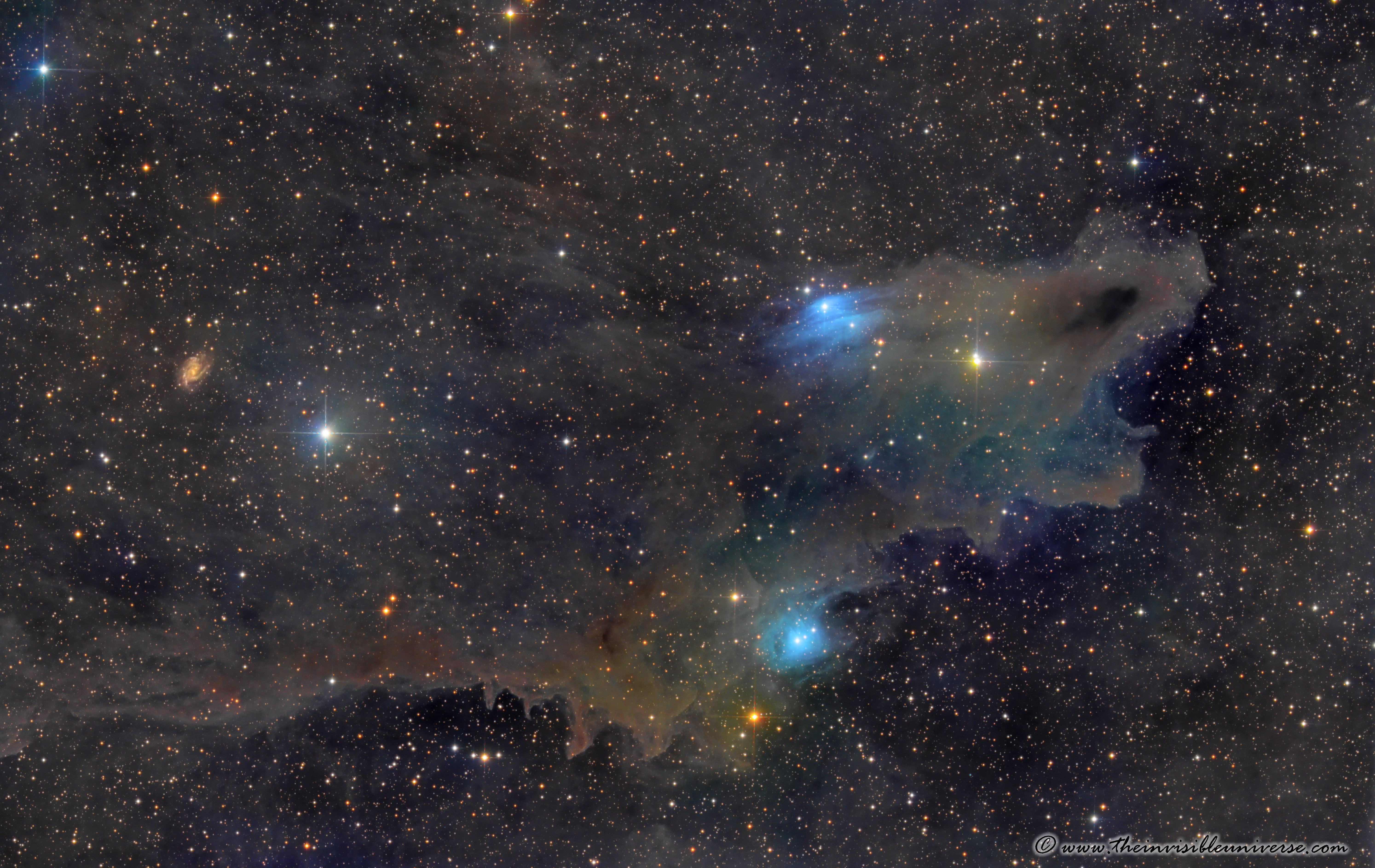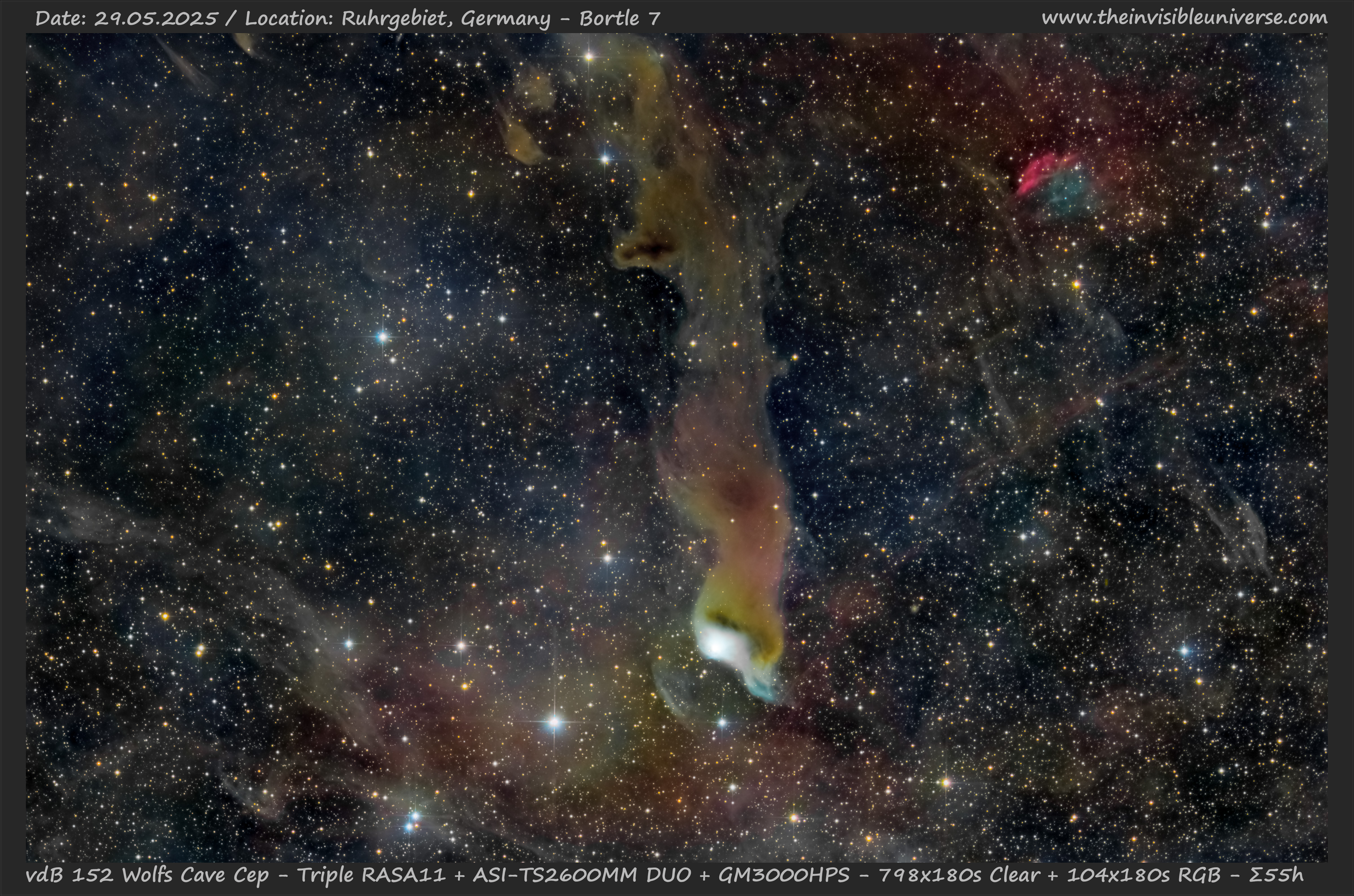 Wolf's Cave Nebula, vbdB152, in the constellation Cepheus with a total exposure time of 55 hours. I photographed this subject a second time after I had already photographed it under the dark skies of La Palma with my 4.5-inch f5.2 APO. I have to say that this version with my Triple RASA11 is better despite the significantly worse sky conditions. The image has less noise as I was able to invest much more integration time and use very fast optics.