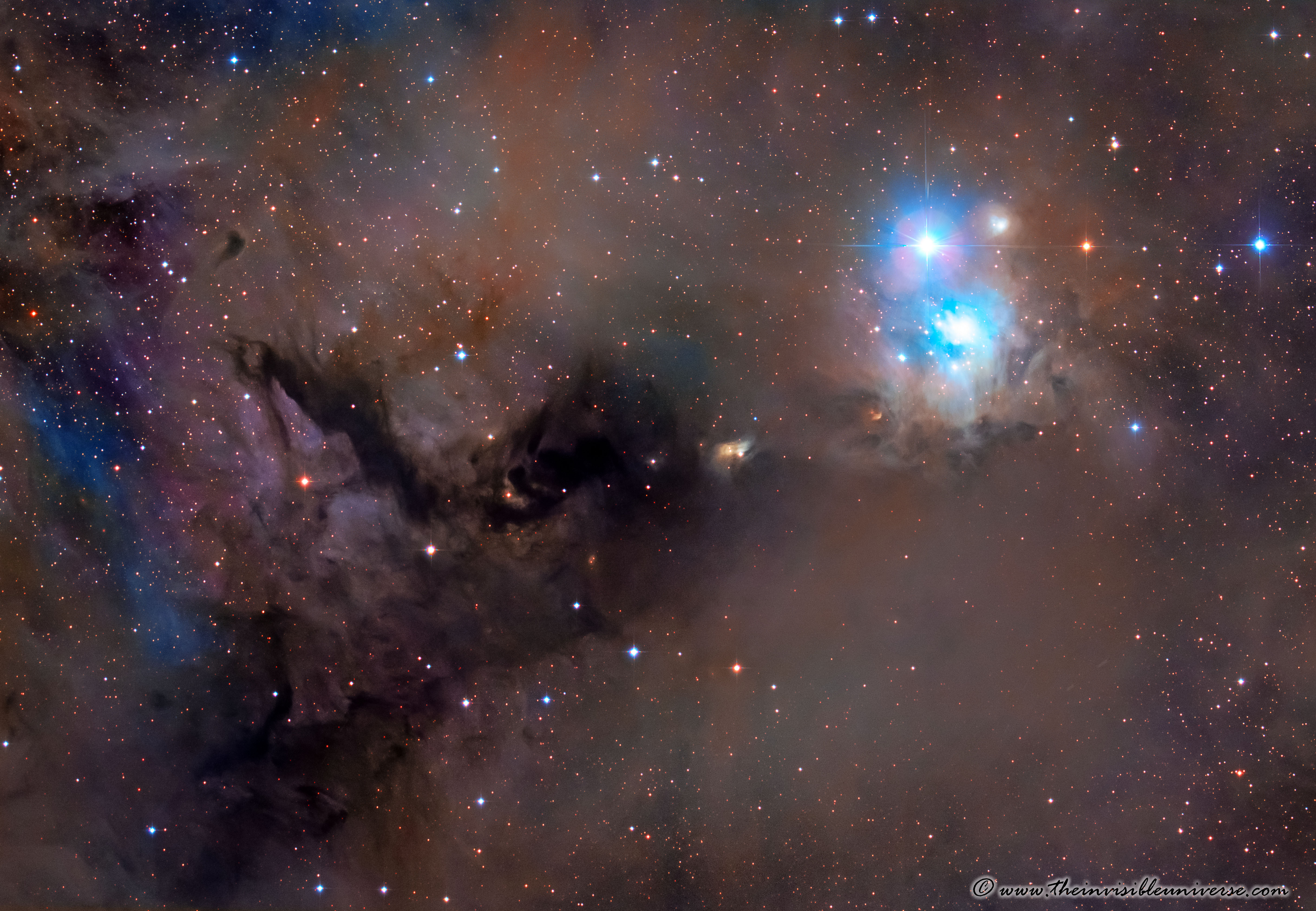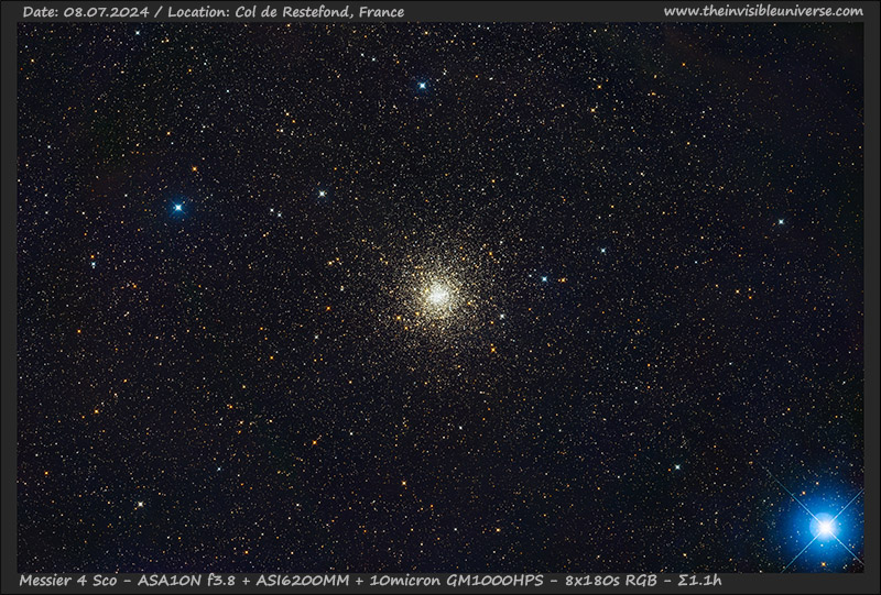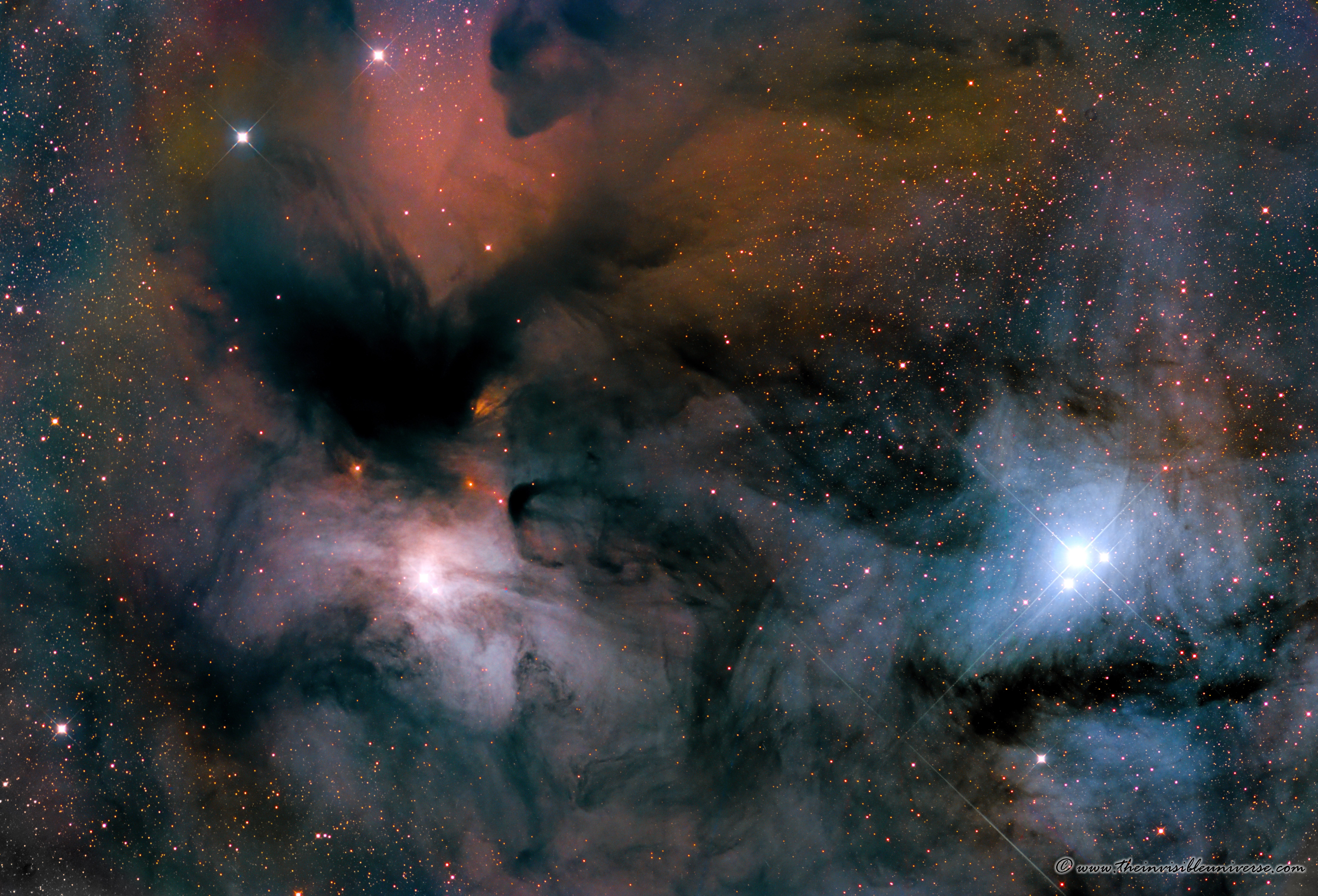 This is a 100MPix 2-tile mosaic of the Antares Region in Scorpius and Rho Ophiuci. Each tiles has a resolution of 60 Mpix taken with the ASI6200MM Pro monochrome cooled CMOS camera with RGB Filters of Baader. The scope is my TMB 115/805 with the large M82 Riccardi 0,75x Reducer at 600mm focal length with 1.3"/arc-second resolution. Stitching the two tiles of the mosaic in Pixinsight and Photoshop was a pain due to colour and light gradients caused by the inevitable glow of the light pollution of the French Riviera close to the horizon, which is even visible at the Col du Restefond in the French Alps 150km away. I imaged the region until it vanished behind the horizon. The horizon line formed by of the surrounding mountains at my observing location in an old quarry at an altitude of 2600m is quite low and you have a much better horizon view to the south than in any other easily accessible hight altitude location in the Alps that I have been to. I wish I had more time to collect further subframes to improve S/N, but the short nights in July and the low altitude of Scorpius only allowed about 3h imaging per night.