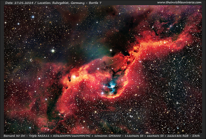 Narrowband: 16x600s Ha for red, 16x600s OIII for green and 16x600s SII for blue. 5x180s RGB for star colours. ASA 10N f3.6 astrograph with 3" Wynne corrector. 10micron GM2000QCI mount. Guiding with the ASI120mini and a 50mm Guidescope. ZWO ASI 6200MM Pro + Baader 2" CCD-Filter. N.I.N.A. Astro Imaging Suite and PHD Guiding on a Windows PC. Location: Ruhrgebiet, Germany.