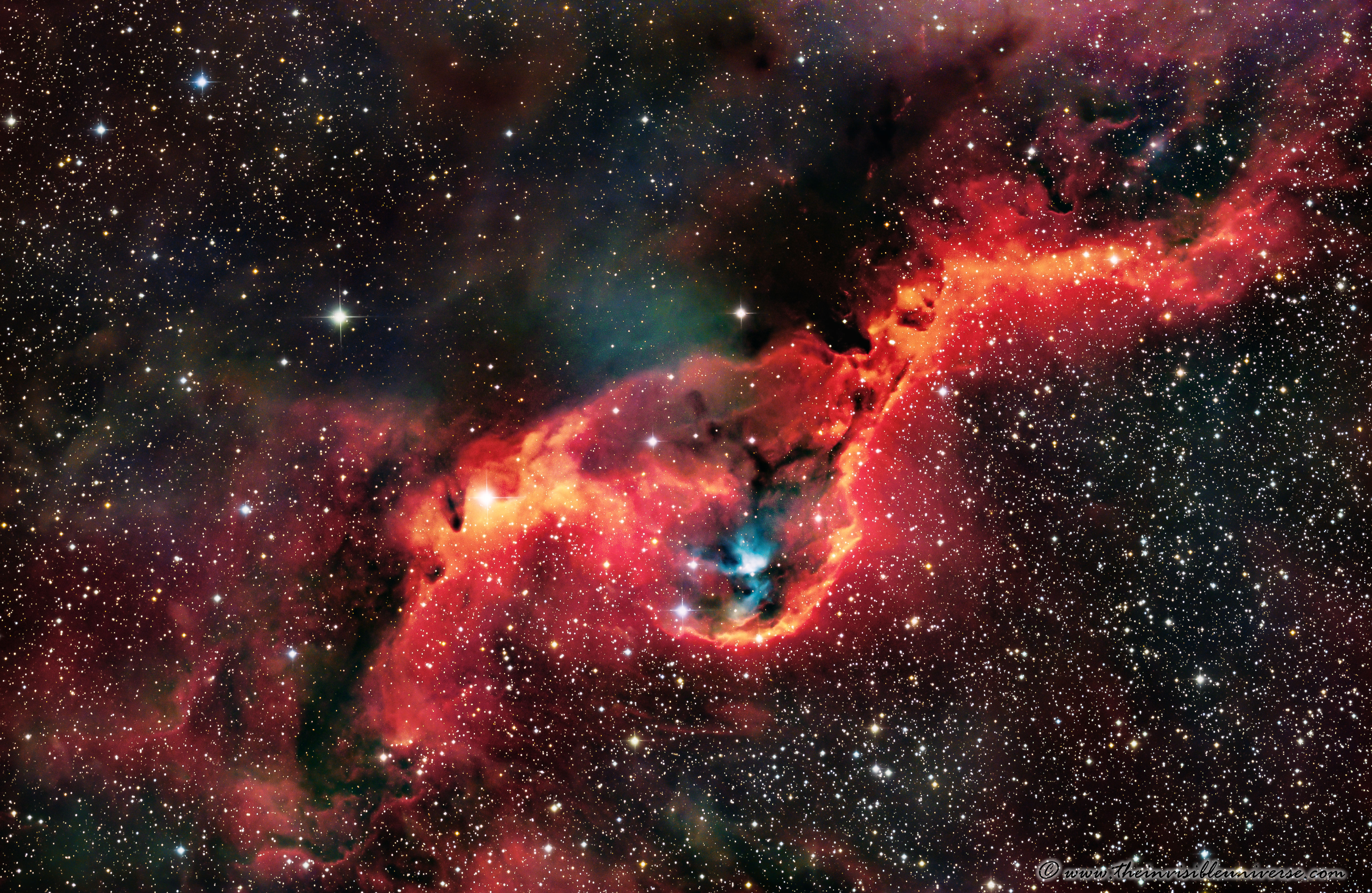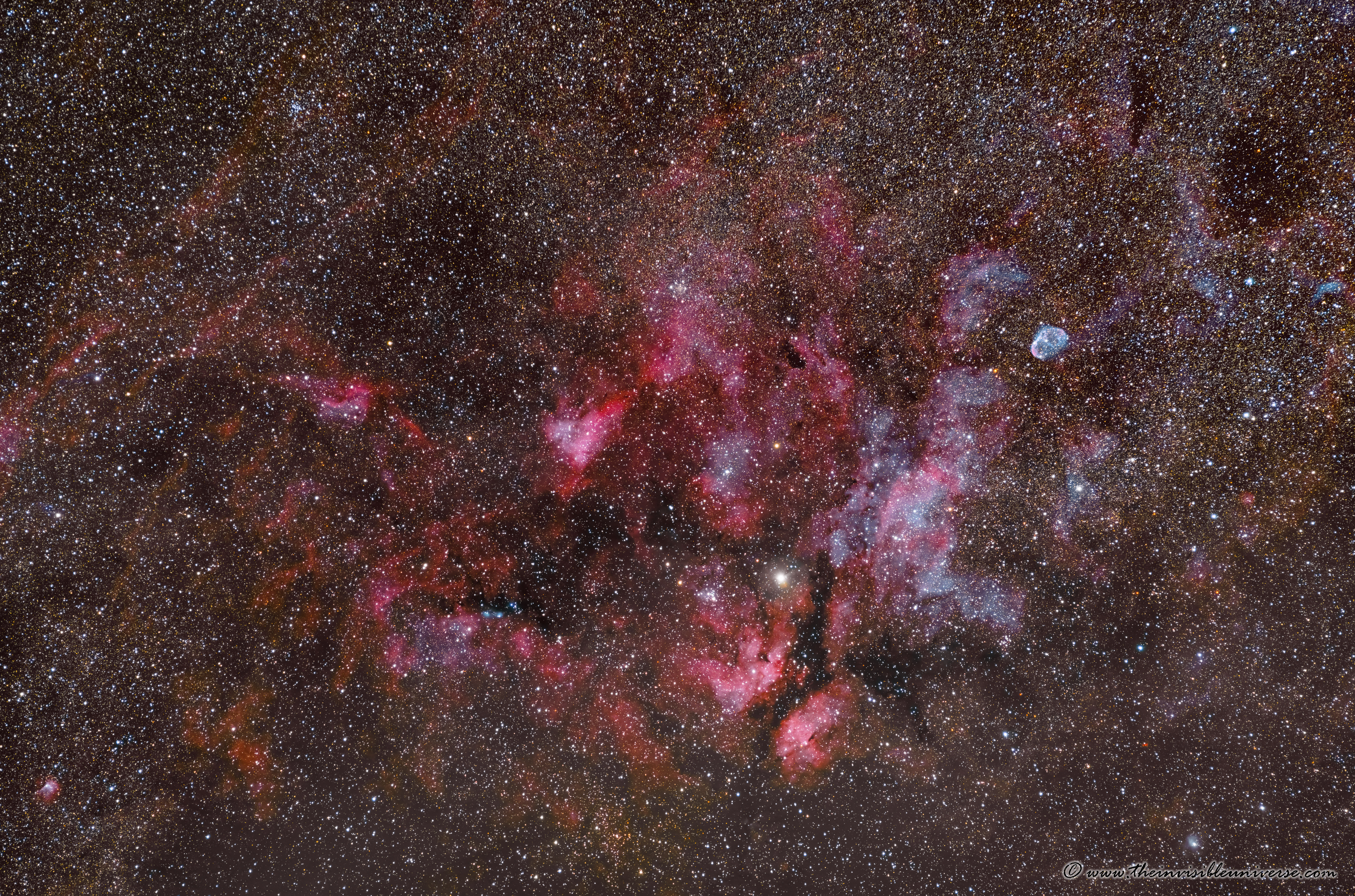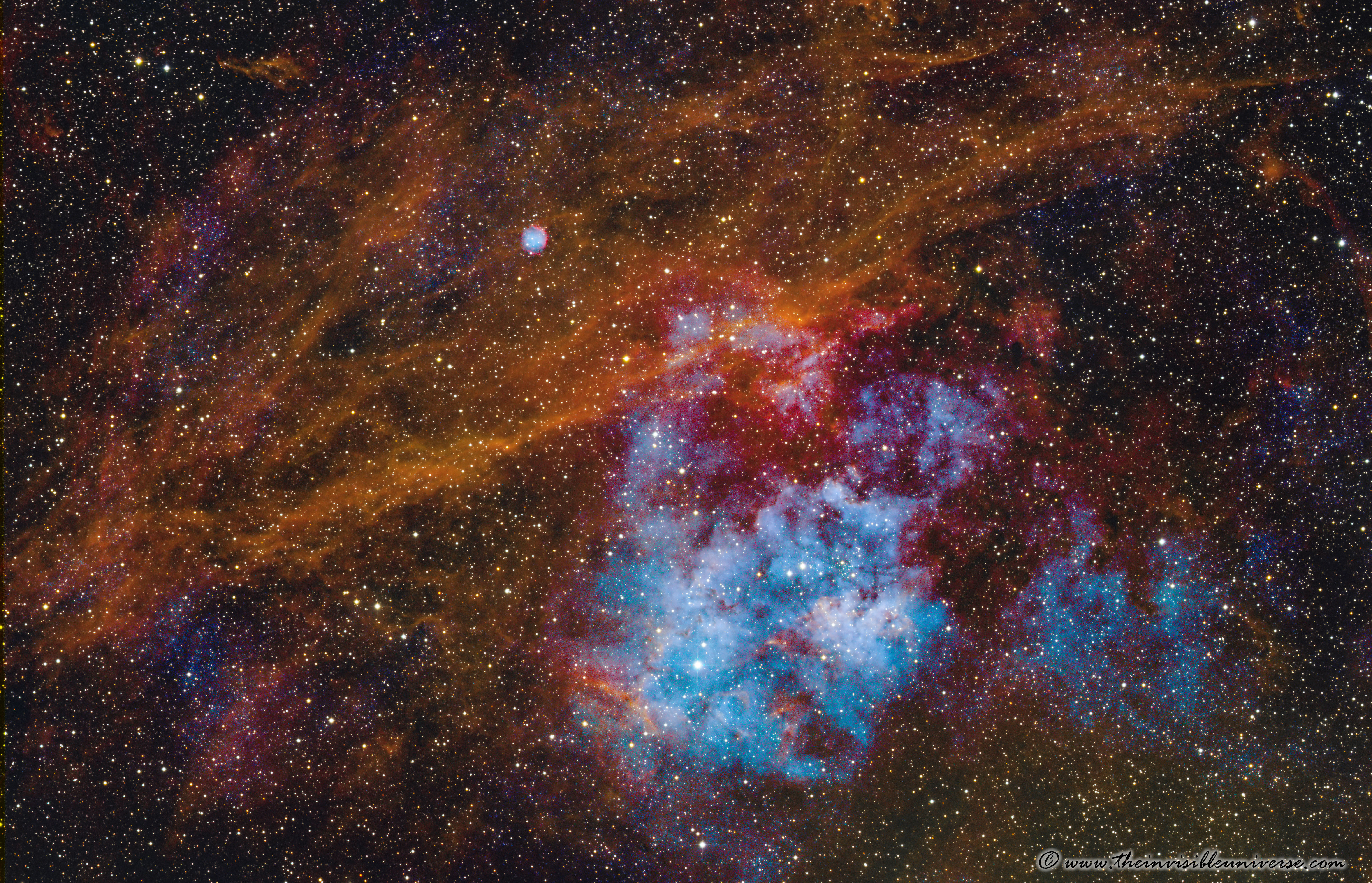 The region around the Lobster Claw Nebula, the Bubble Nebula, the Cave Nebula and the Northern Lagoon Nebula in the constellation of Cepheus is scattered with countless other interesting deep sky objects. Image taken with the TS 76EDPH f4.5 in two different Narrowband-RGB versions with a total of 12h integration time in NB and RGB.