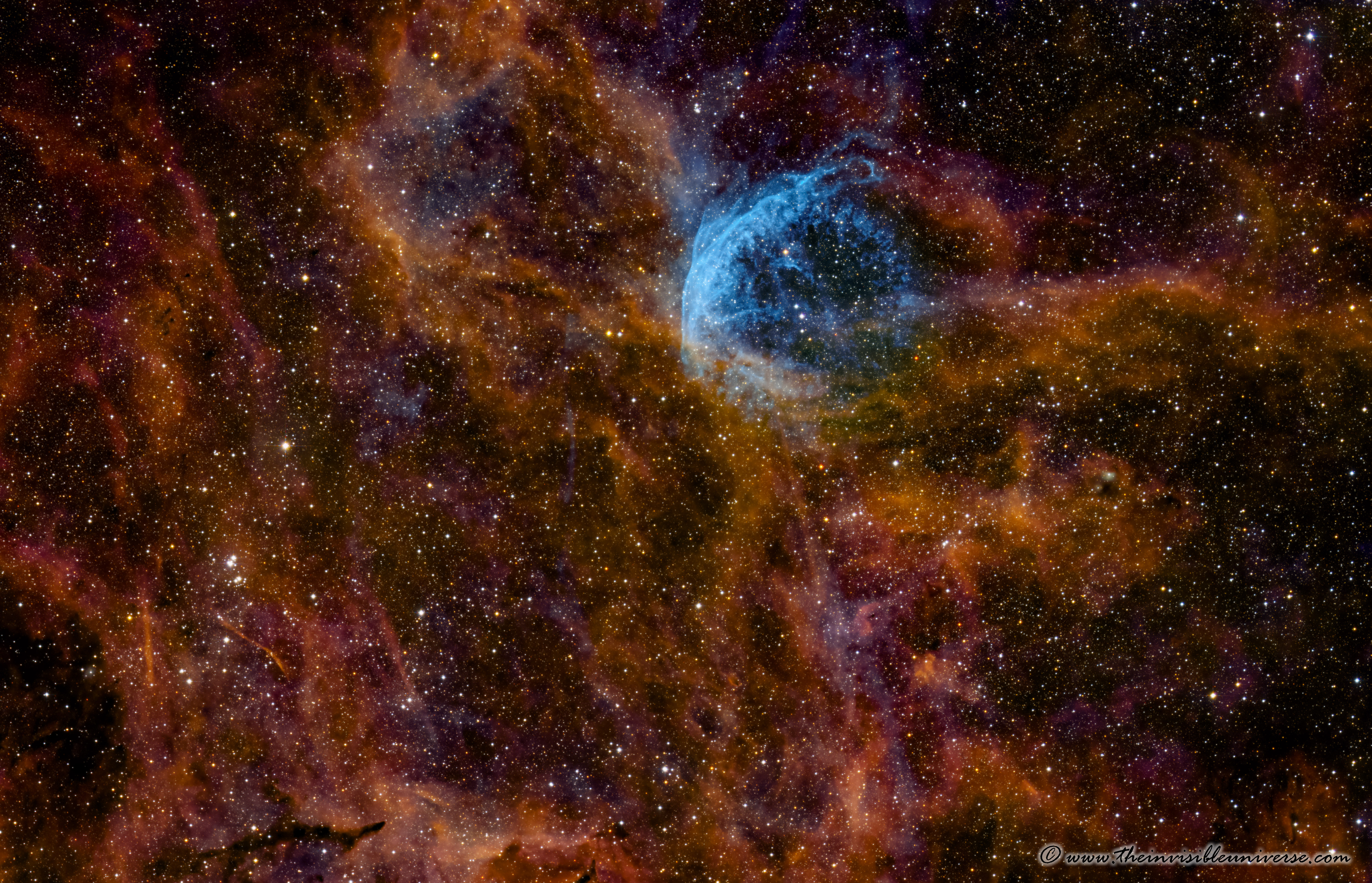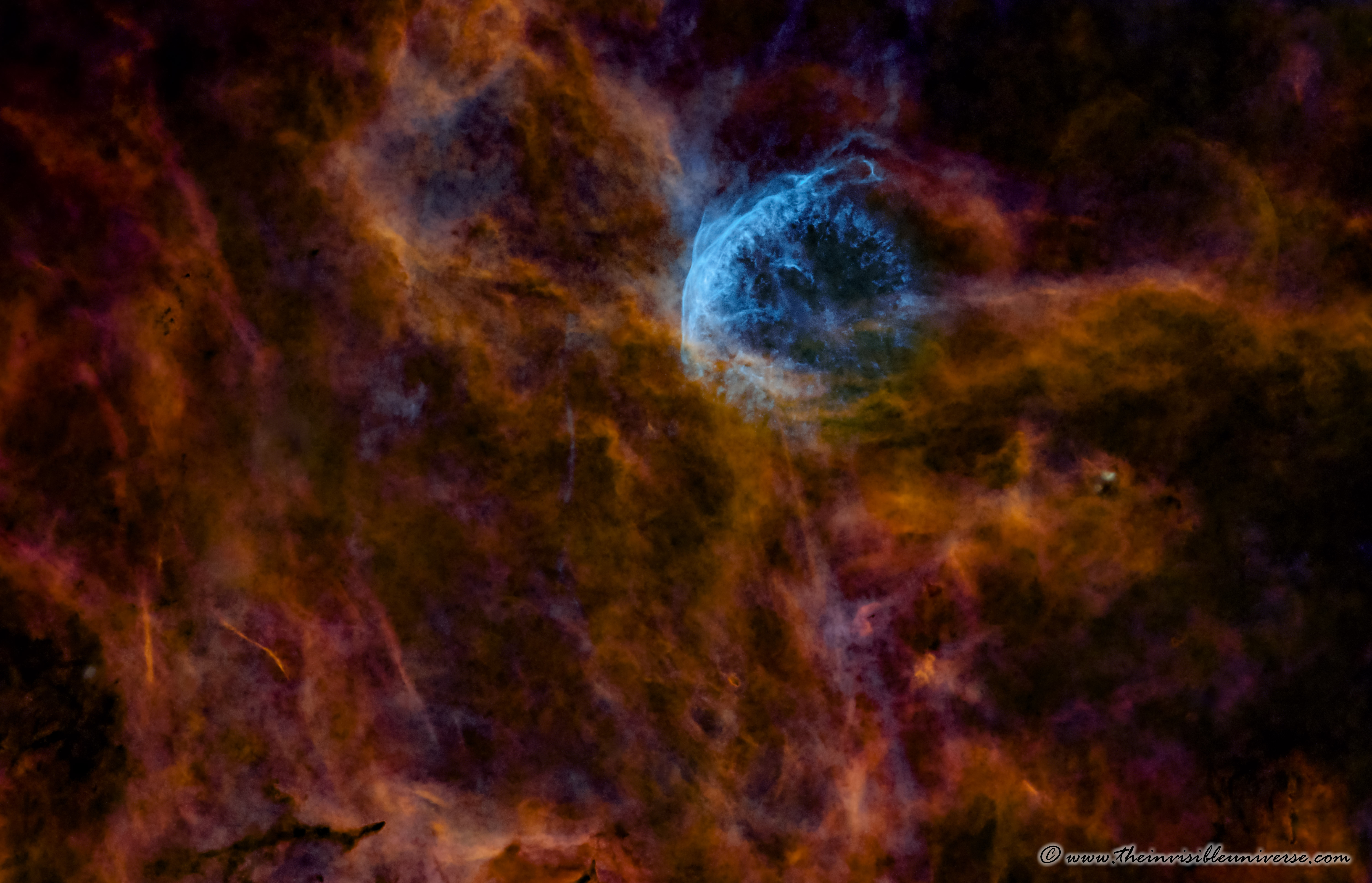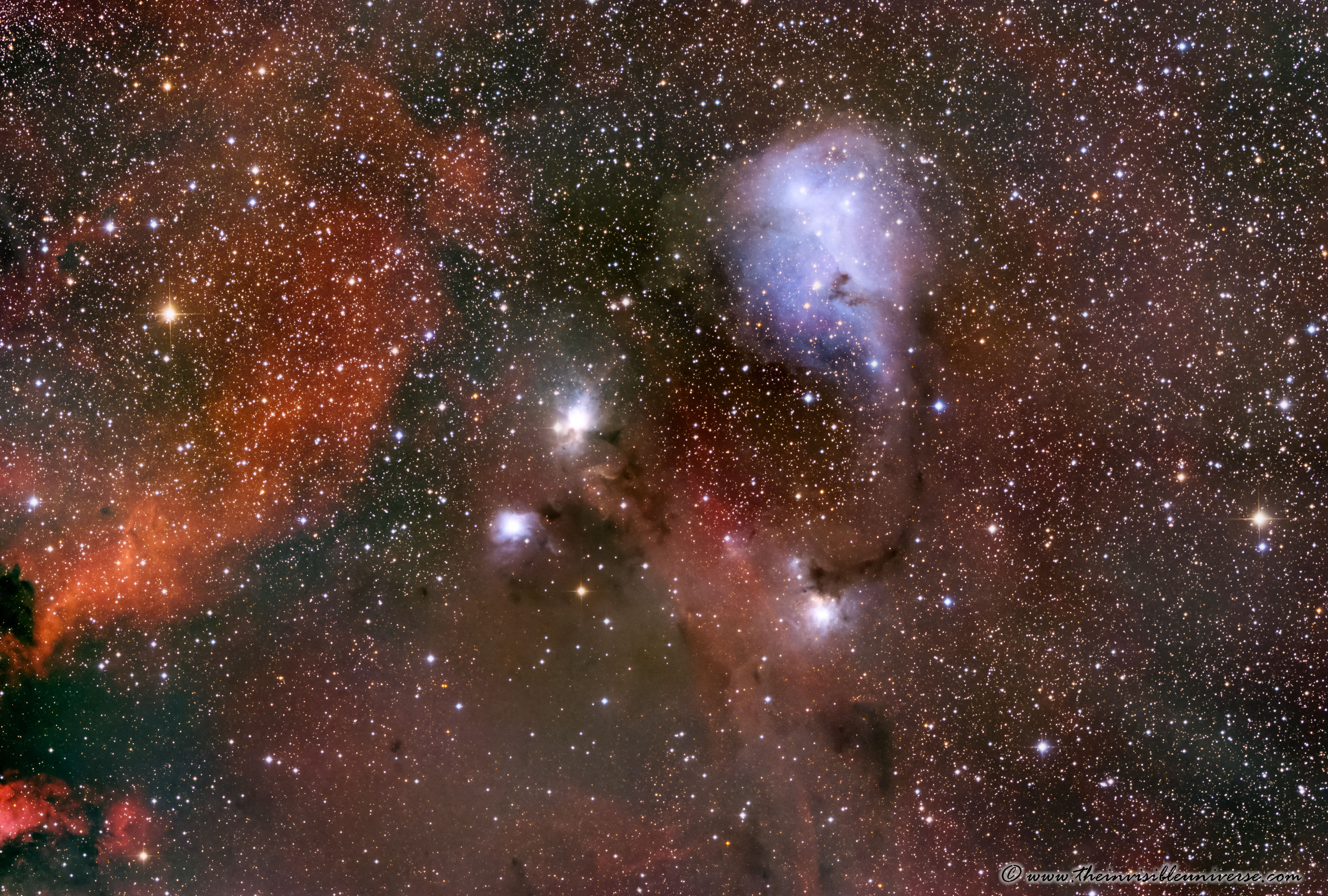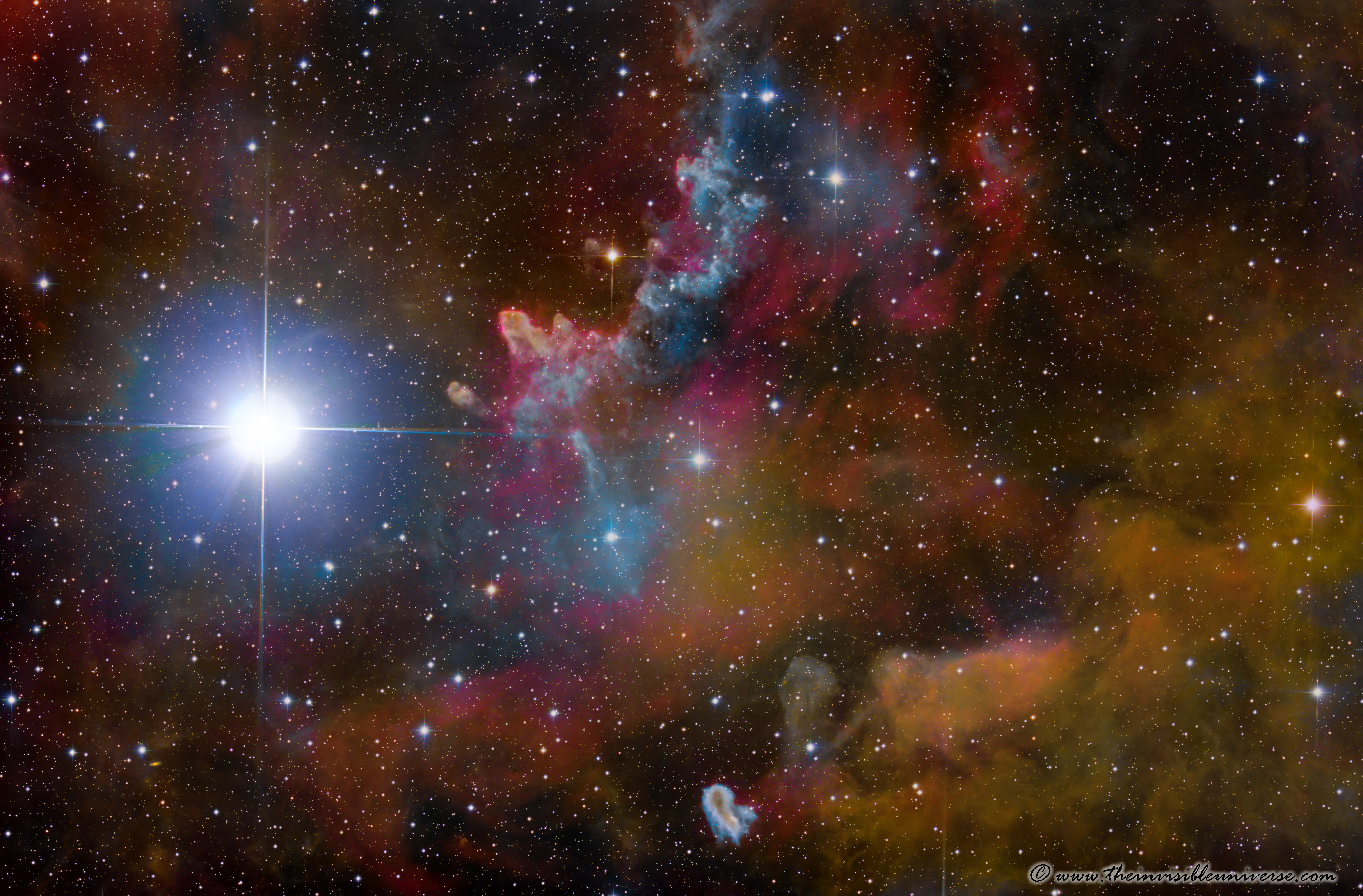 The region around the Lobster Claw Nebula, the Bubble Nebula, the Cave Nebula and the Northern Lagoon Nebula in the constellation of Cepheus is scattered with countless other interesting deep sky objects. Image taken with the TS 76EDPH f4.5 in two different Narrowband-RGB versions with a total of 12h integration time in NB and RGB.