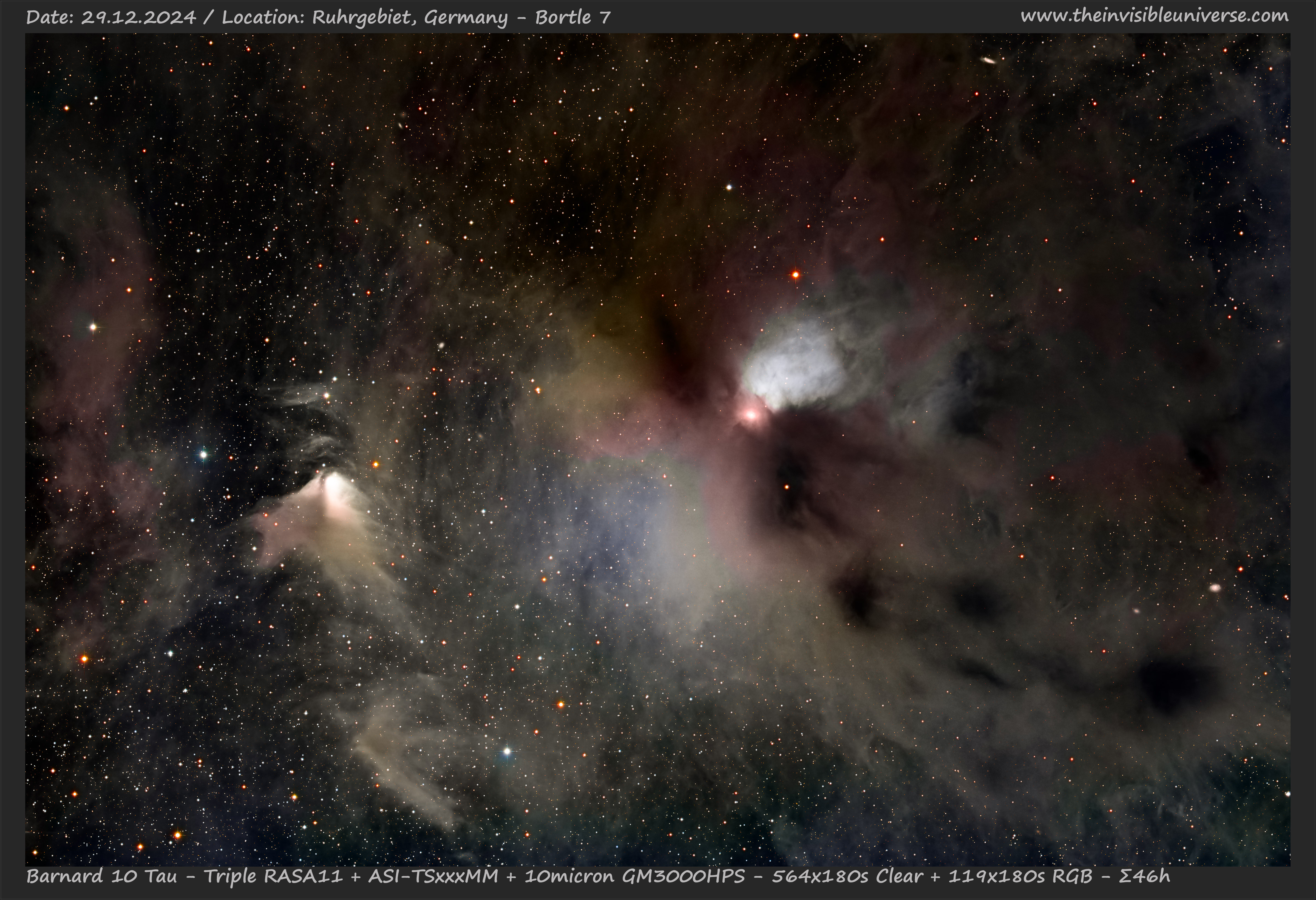 Barnard 10 in Taurus, part of the Taurus Molecular Cloud. Not the easiest object for post processing, as gradients and a greenish tint from light pollution makes the color correction a challenge.