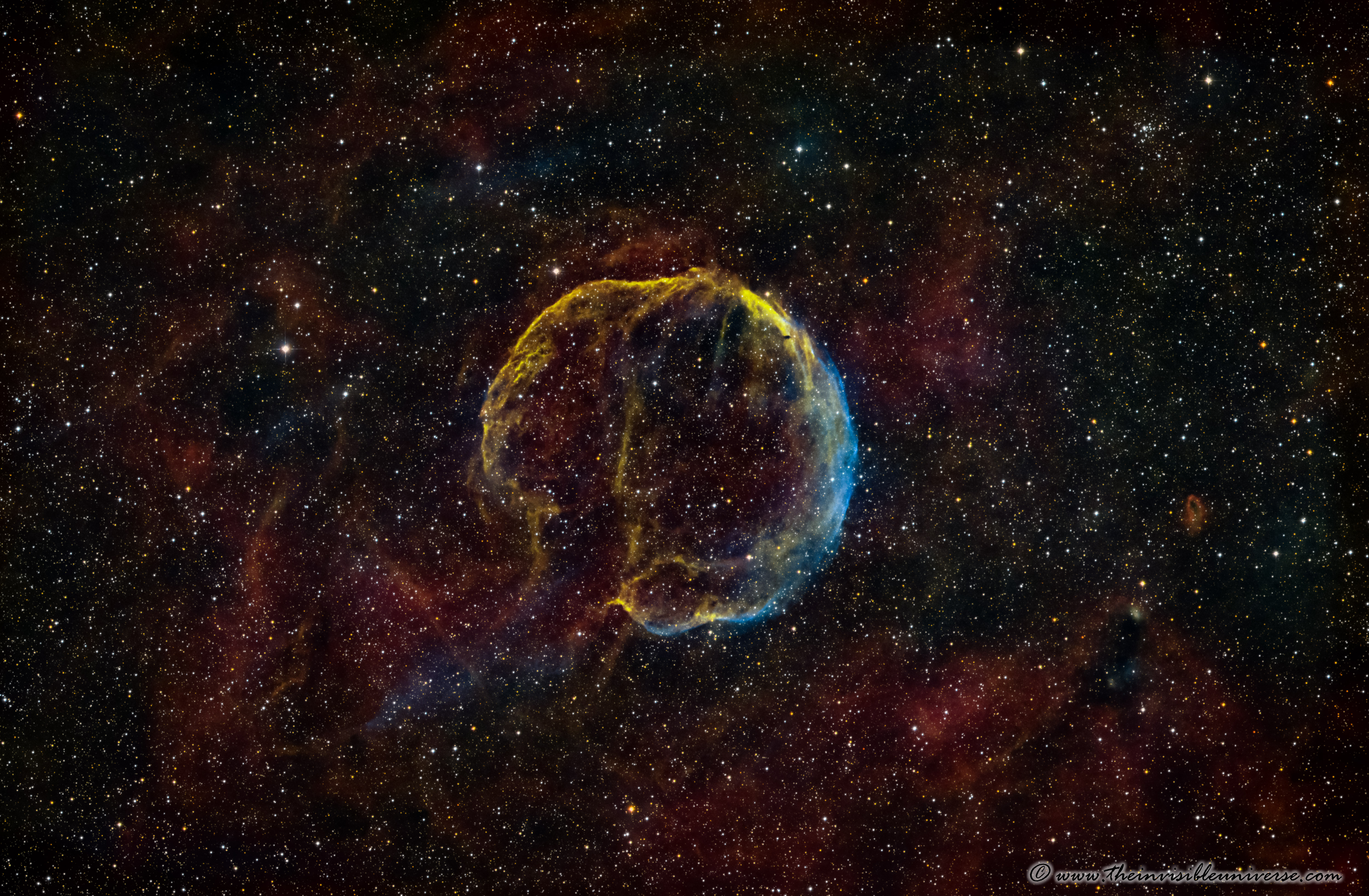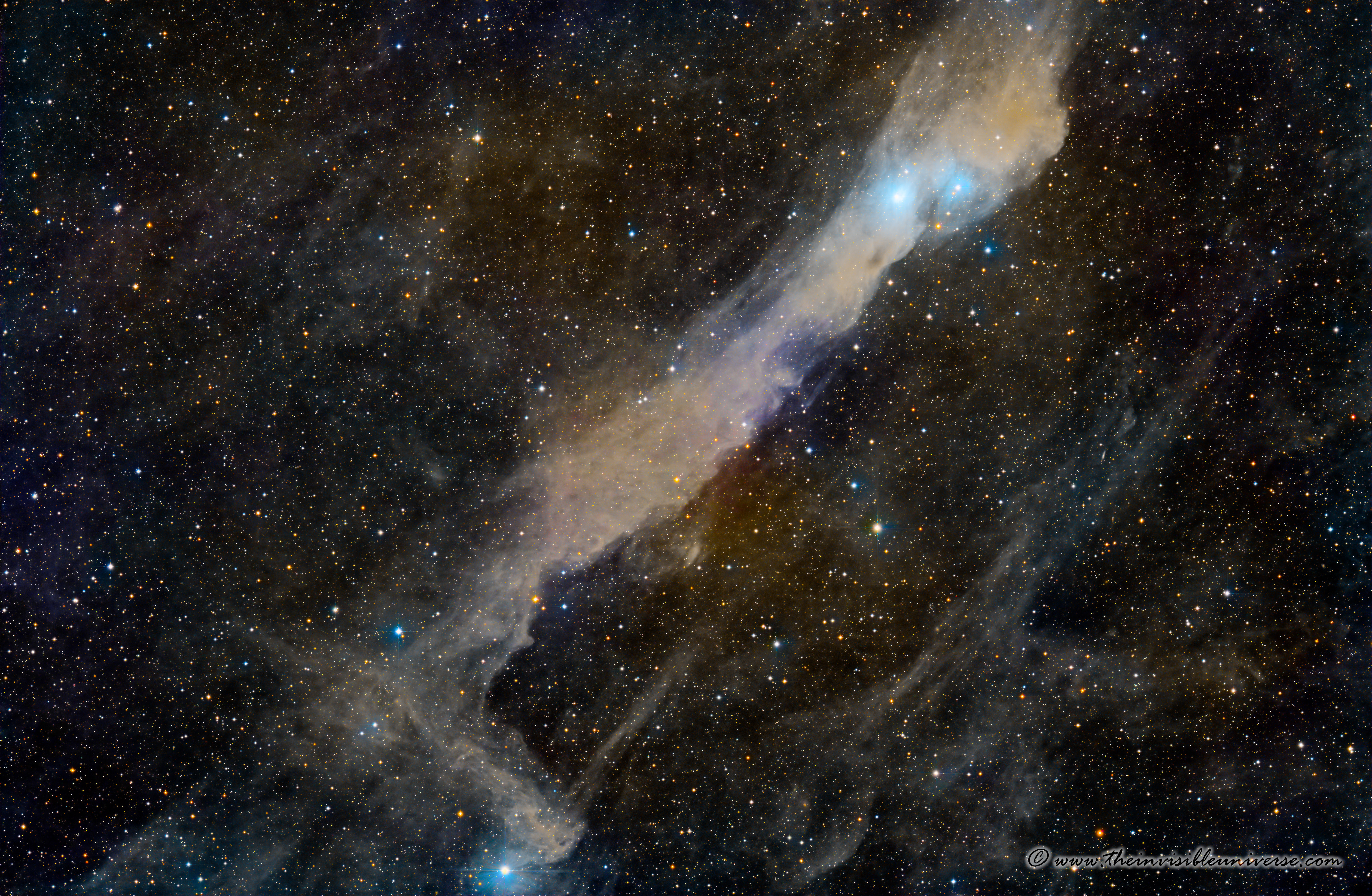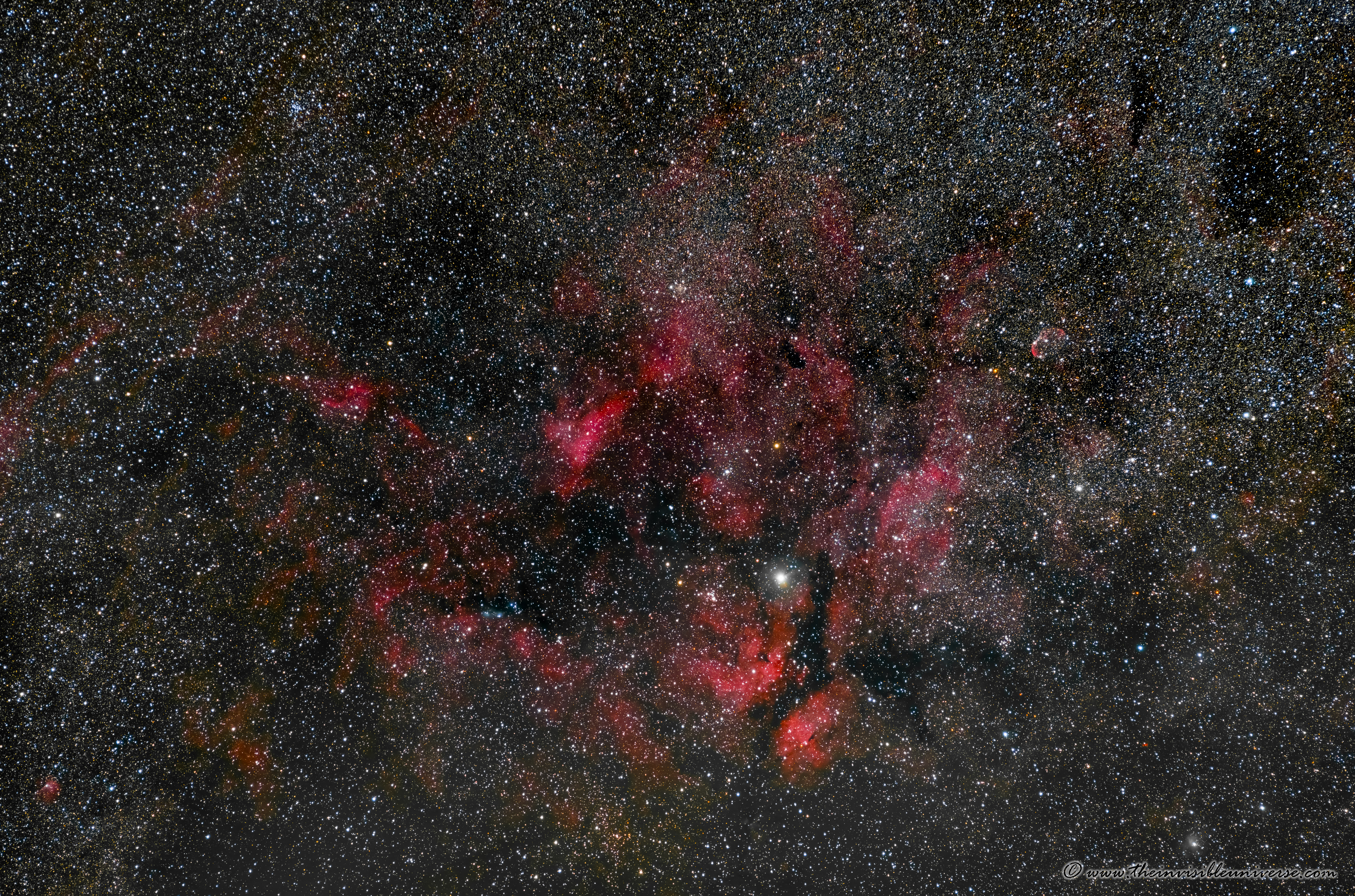 Full Frame image of the entire Cirrus Loop or Veil Nebula region, also called Cirrus Nebula. The picture includes: NGC6960, the Eastern Veil Nebula with the bright star 52 Cygni, sometimes called Witch's Broom. NGC6992 and NGC6995, the western part of the Cygnus Loop. Pickering Triangle towards the central of the Cygnus Loop.