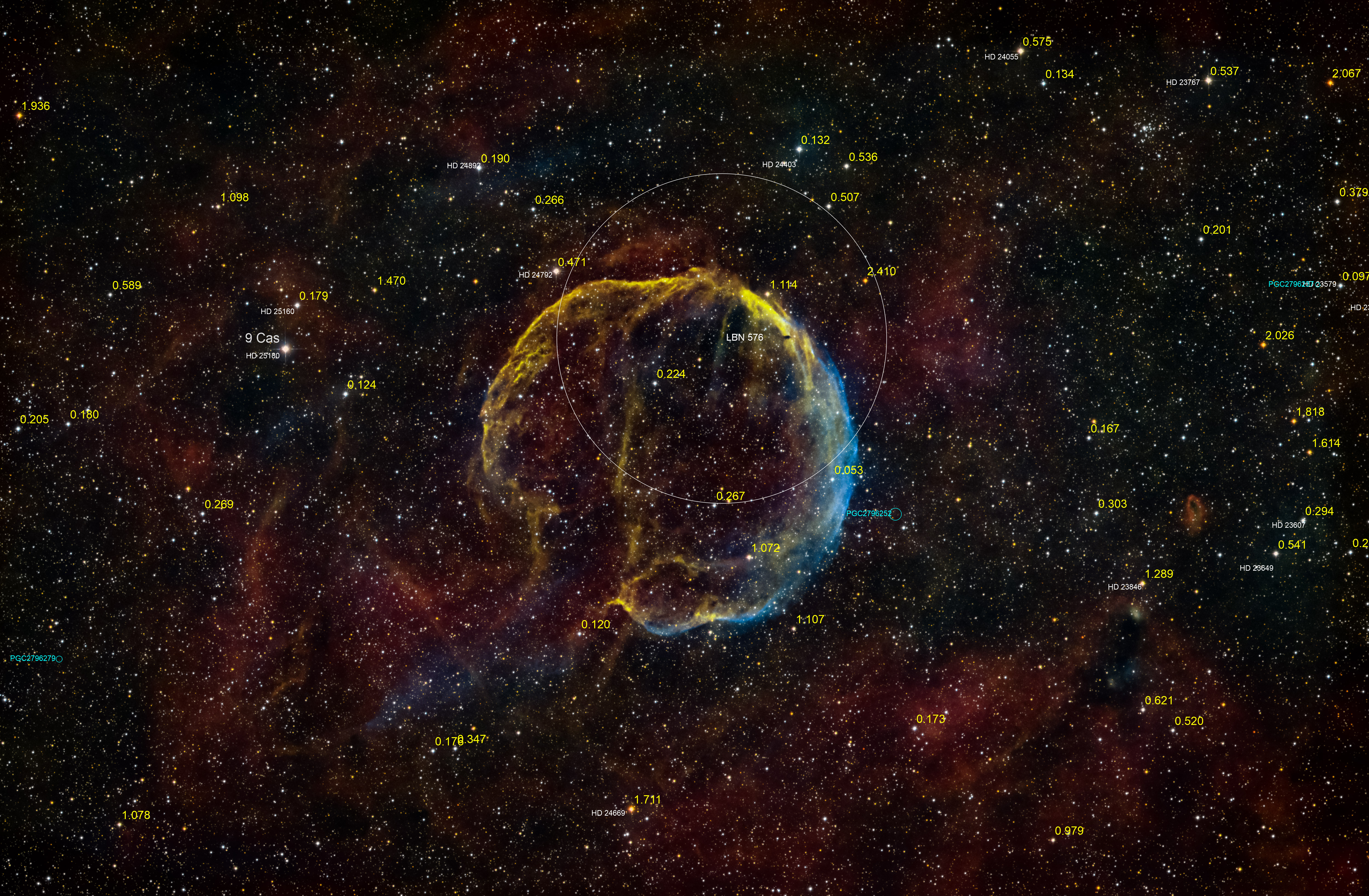 CTB1 in Cassiopeia, another faint object in the sky. This object, also known as Abell 85, is not a planetary nebula, but a supernova remnant with a diameter of 36'. The distance is about 10000 LJ and the envelope has a diameter of 100 LJ. According to Binnewies' "Bildatlas der Sternhaufen und Nebel" the progenitor star exploded about 13000 years ago and must have been quite asymmetric to produce this irregularly shaped envelope.