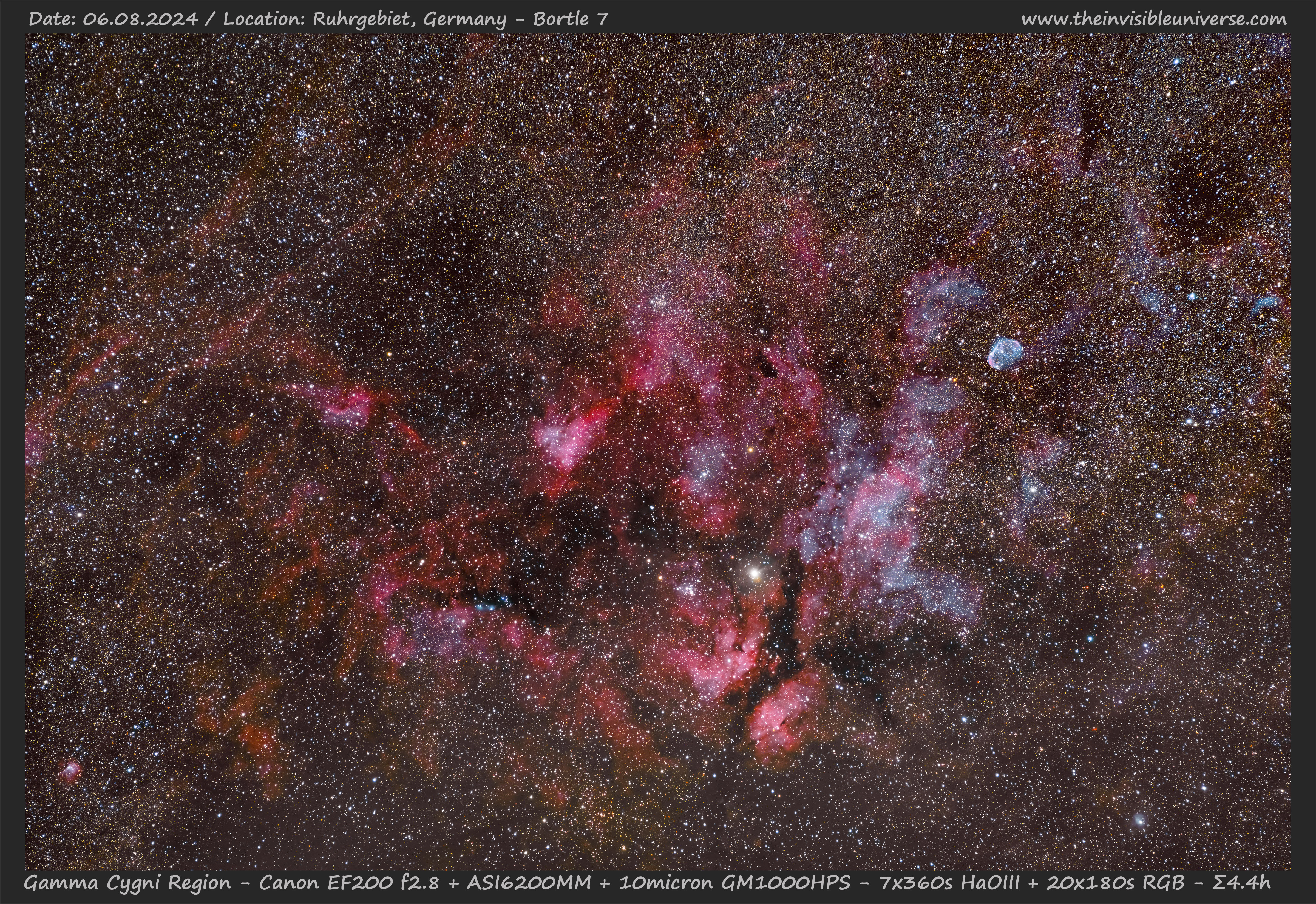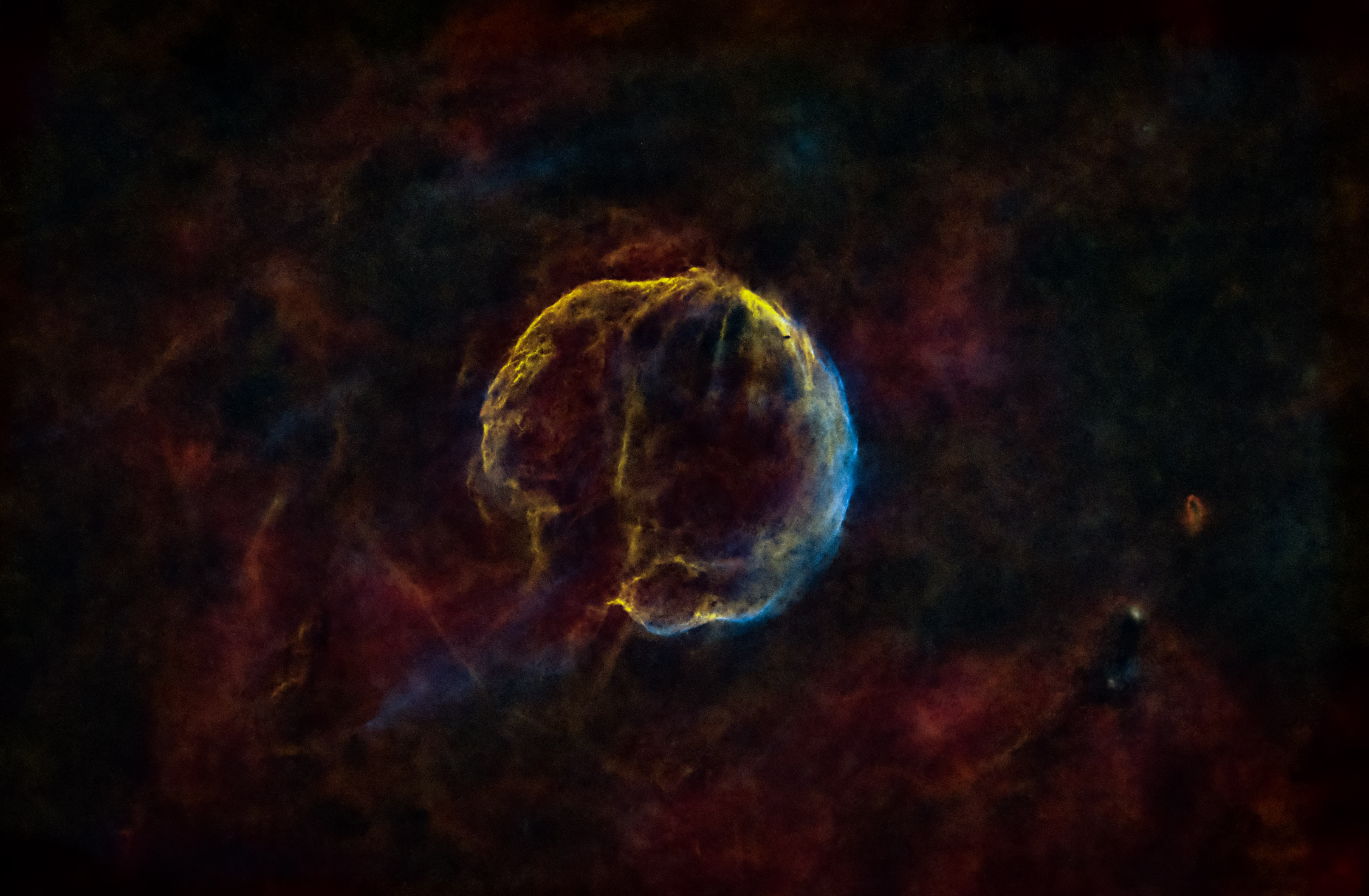 This is the Sadre Region in Cygnus, captured with the TS 76EDPH f4.5 + ASI6200 full format CMOS camera and the 10micron GM1000HPS mount. Combination of Ha and OIII signal as a bicolor image with a synthetic green channel. Star removal by Starnet++ and RGB stars added in PS. The Crescent Nebula in Cygnus stands out by its greenish blue colour due to the strong OIII emission compared to the abundant Hydrogen Gas and its reddish Ha emission.