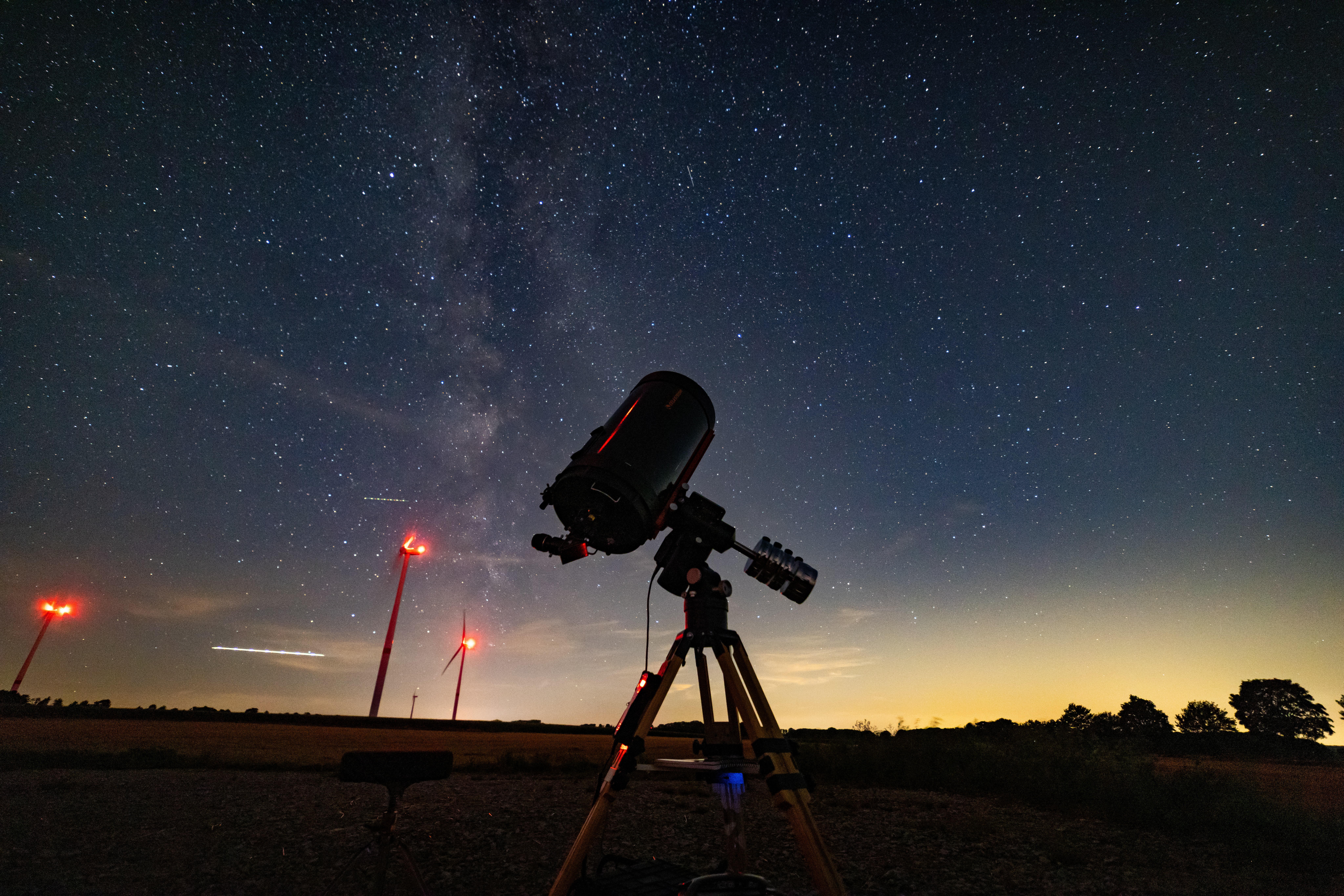 Image below: a 360 Degree Night Panorama of my observation location at the wind park near the city Lichtenau. The view is amazing, although the wind mills obstruct parts of the sky, make quite some noise and add light pollution with its red position lights.