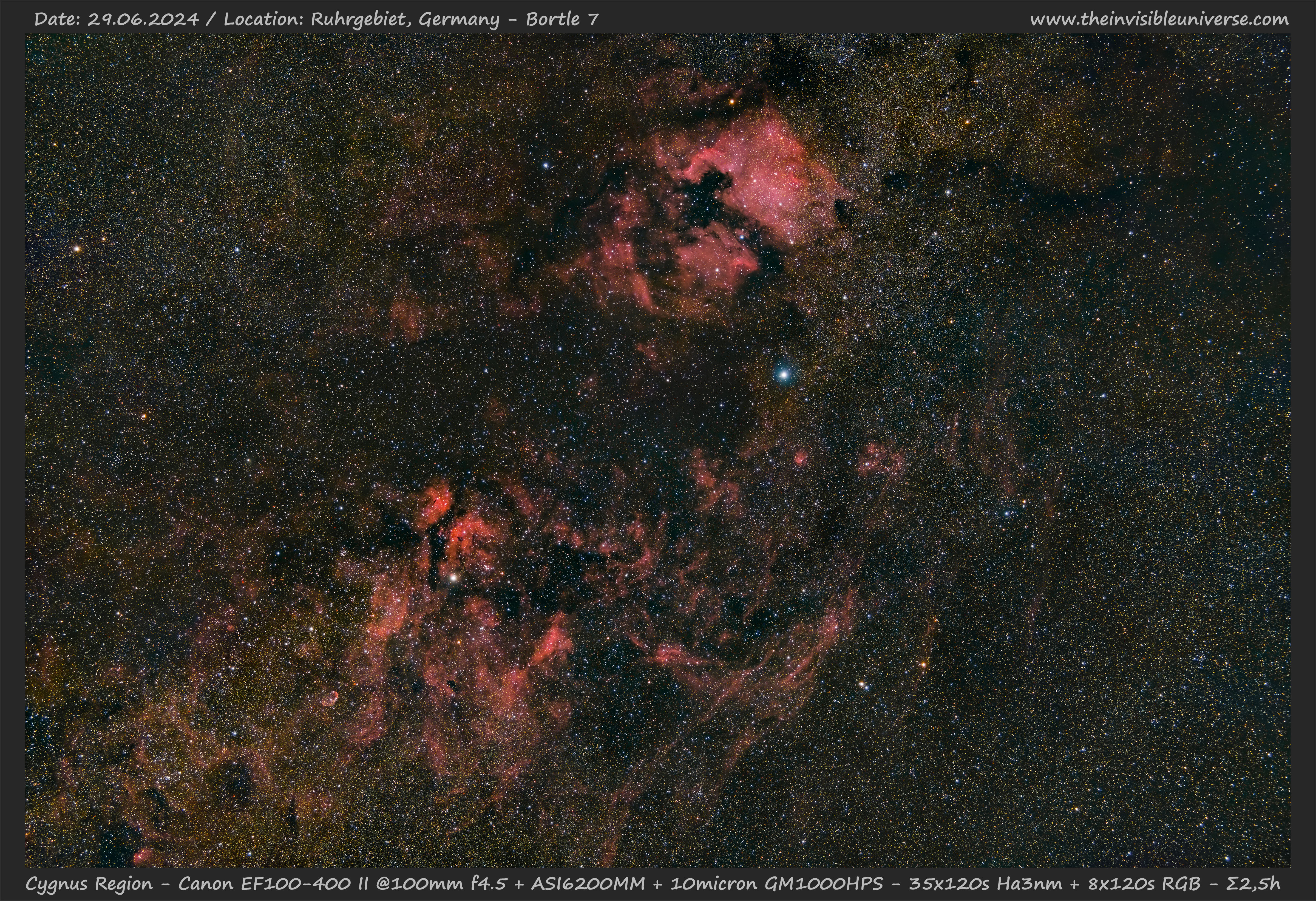 Narrowband: 28x600s Ha for red and green, 28x600s OIII for green and blue. 14x180s RGB for star colours. ASA 10N f3.6 plus Canon EF1,4x II @f5. 10micron GM2000QCI mount. Guiding with the ASI120mini and a 50mm Guidescope. ZWO ASI 6200MM Pro + Baader 2" CCD-Filter. N.I.N.A. Astro Imaging Suite and PHD Guiding on a Windows PC. Location: Ruhrgebiet, Germany.
