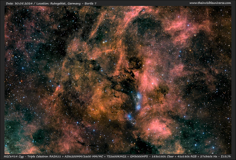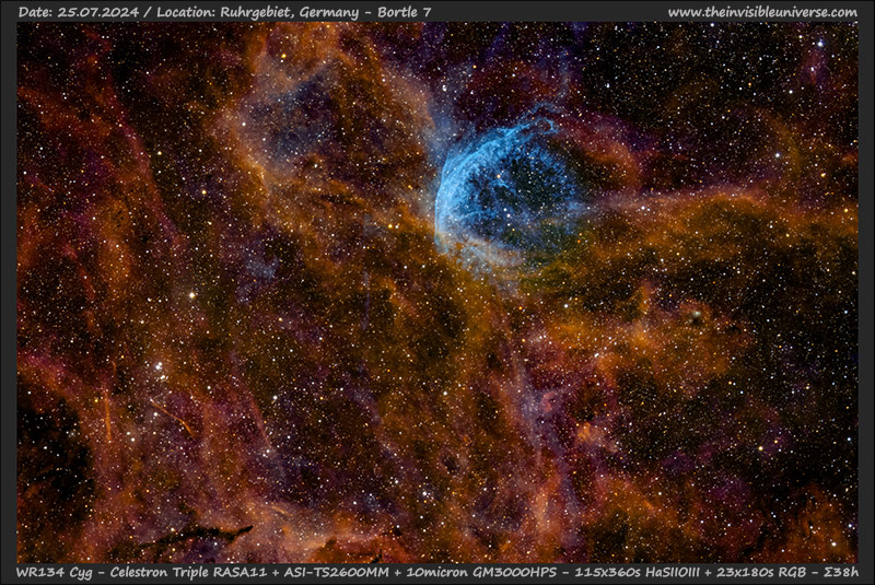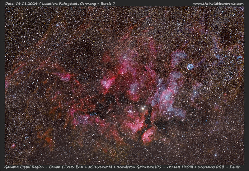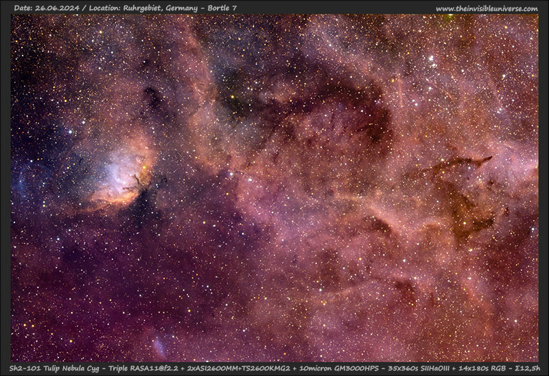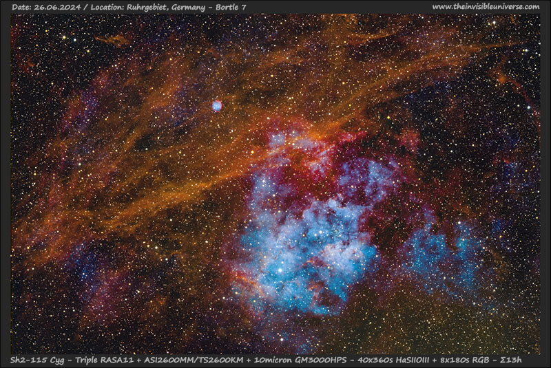 14x600s HA and OIII plus 8x360s RGB. TMB 115/805 Triplet APO with M82 Riccardi Reducer @ 600mm f5.25. ASI6200MM Pro Full Frame 60Mpix camera and Baader 2" Filter. Celestron CGX mount. Guiding with the ASI120mini and a 50mm Guidescope. N.I.N.A. Astro Imaging Suite and PHD Guiding on the hp Elite X2 Tablet. Location: Haarstrang, Germany.