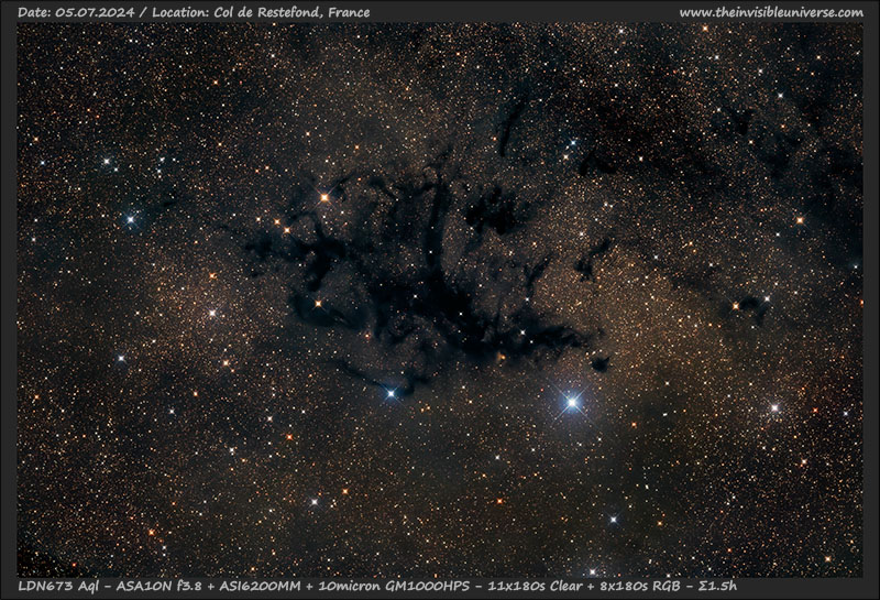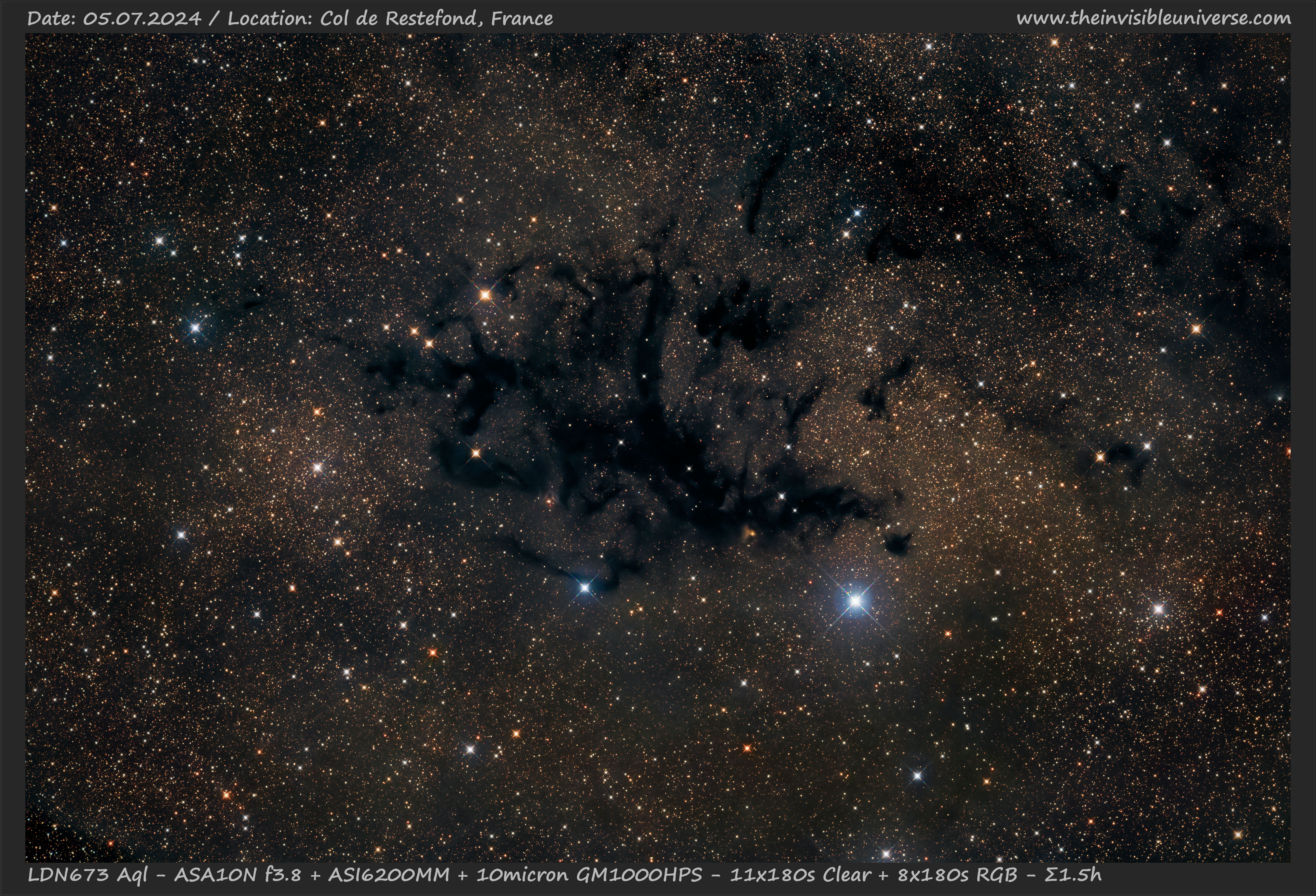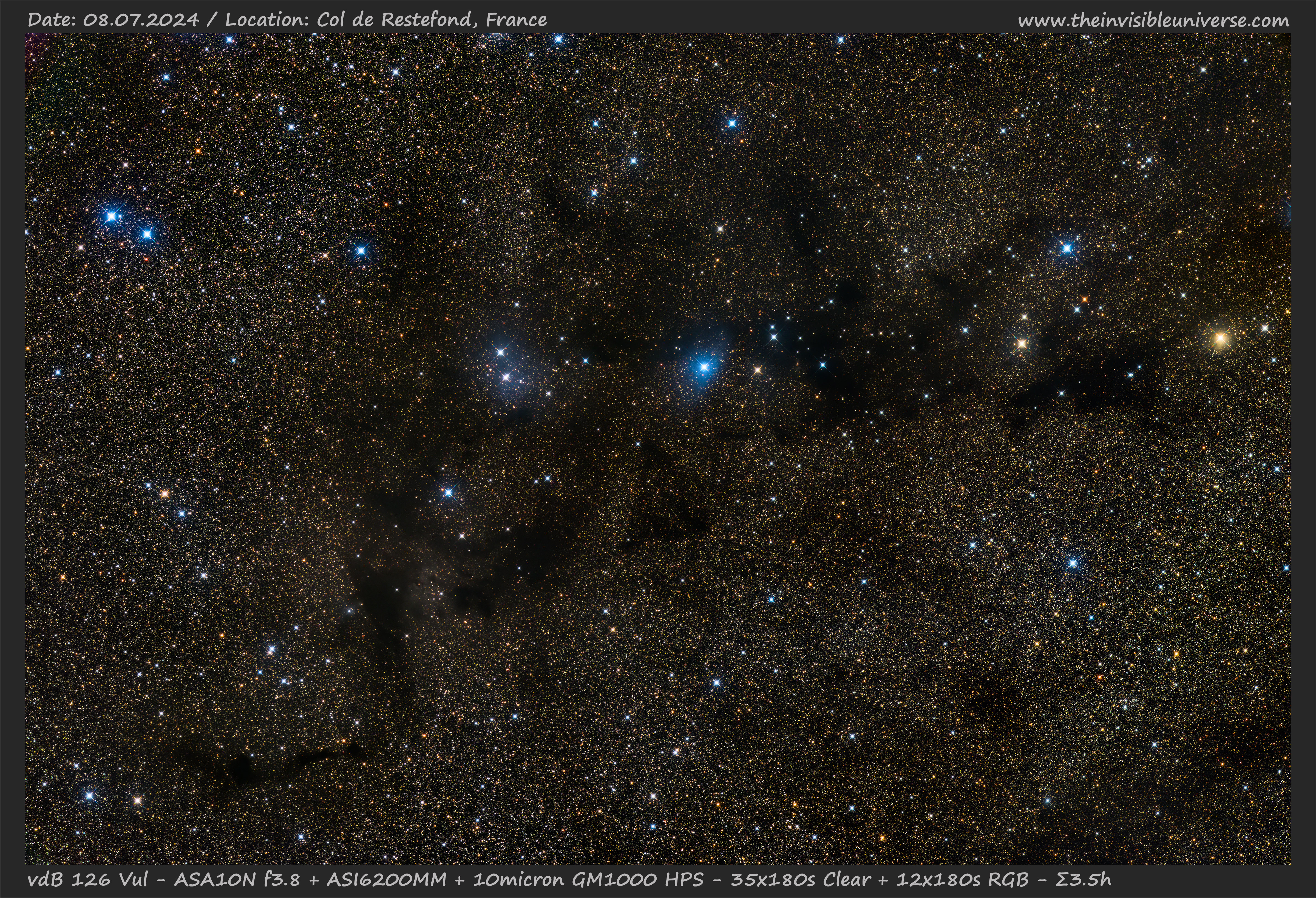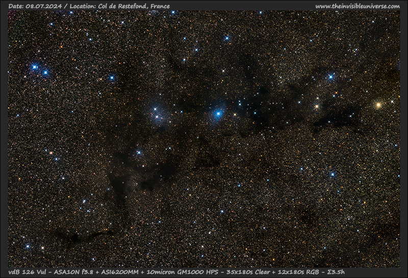 13x180s RGB, TMB 115/805 Triplet APO with M82 Riccardi Reducer @ 600mm f5.25. ASI6200MM Pro Full Frame 60Mpix camera and Baader 2" Filter. Celestron CGX mount. Guiding with the ASI120mini and a 50mm Guidescope. N.I.N.A. Astro Imaging Suite and PHD Guiding on the hp Elite X2 Tablet. Location: Col du Restefond, France.