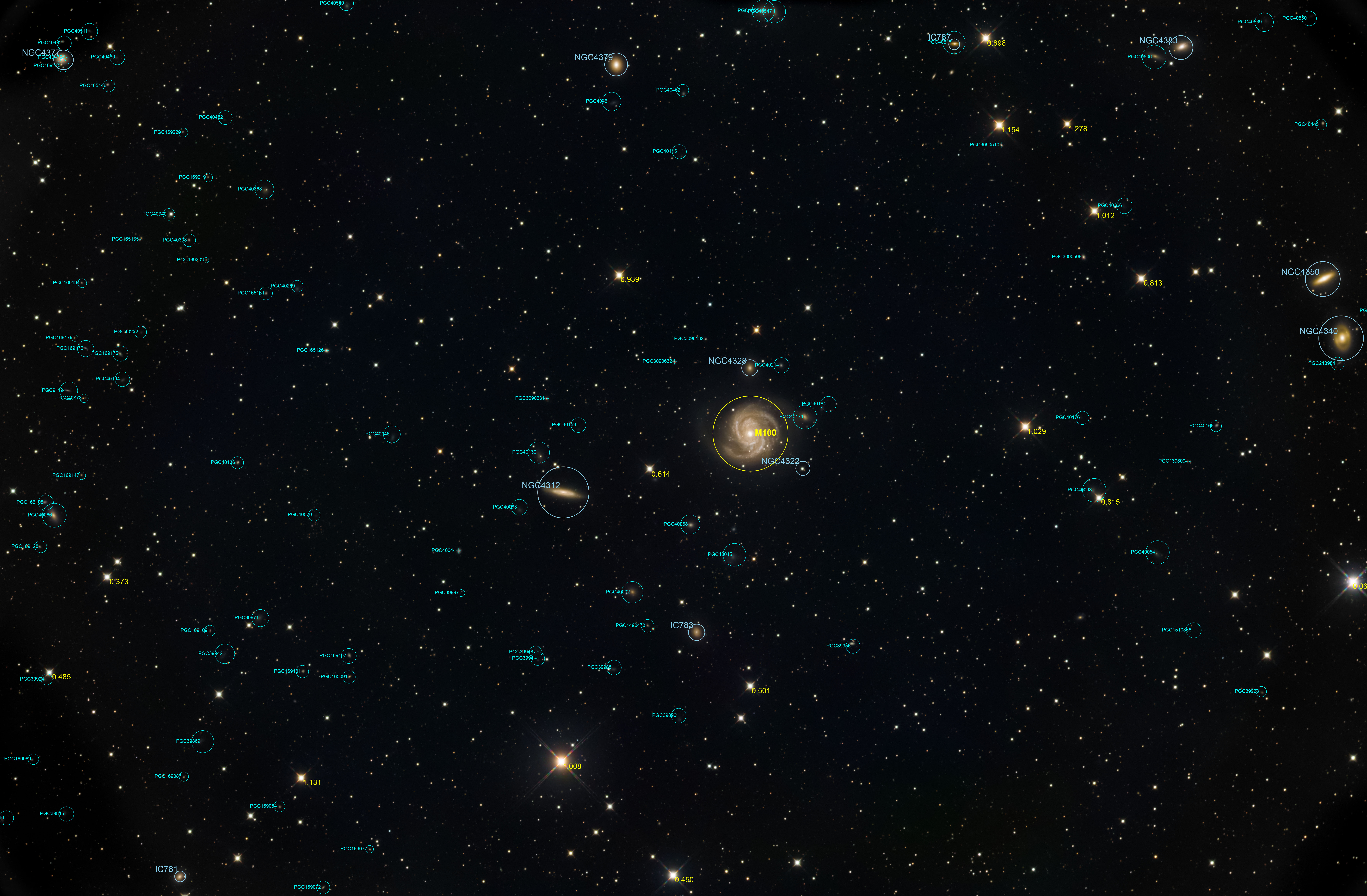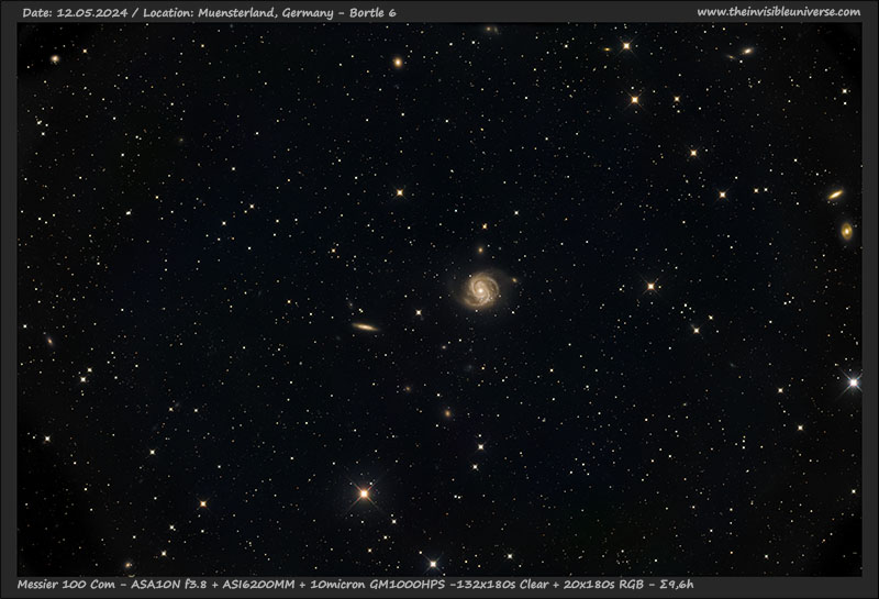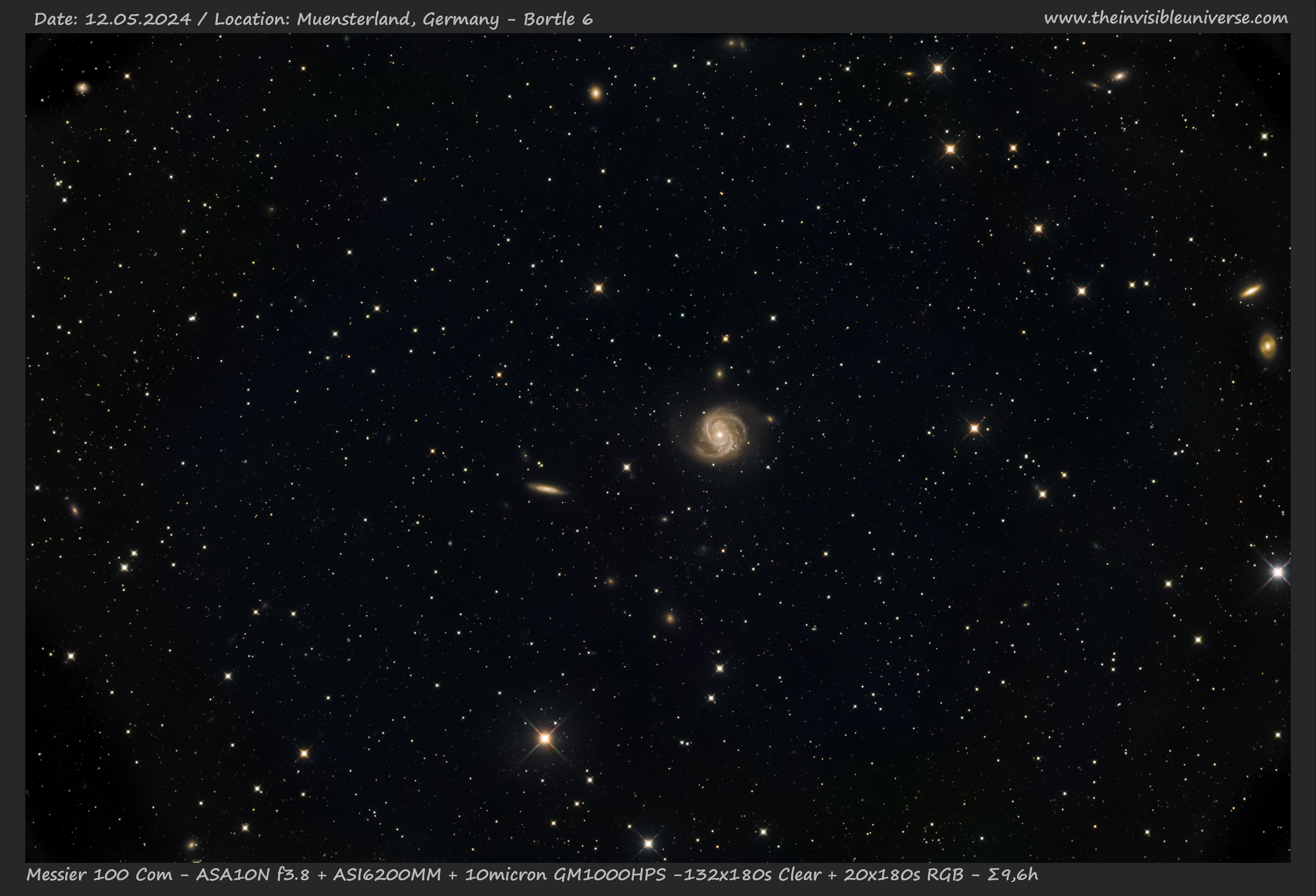 10x360s RGB with the ASA 10N f3.8 and the Riccardi Newton Corrector plus the ASI6200MM Pro and Baader 2" Filters. 10micron GM2000QCI mount. Guiding with the ASI120mini and a 50mm Guidescope. N.I.N.A. Astro Imaging Suite and PHD Guiding on a Windows PC. Location: Ruhrgebiet, Germany.