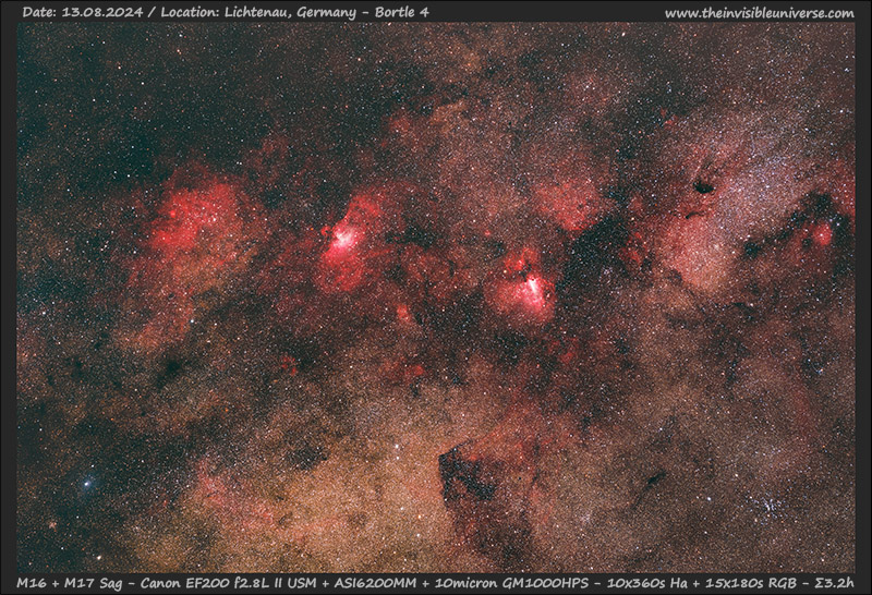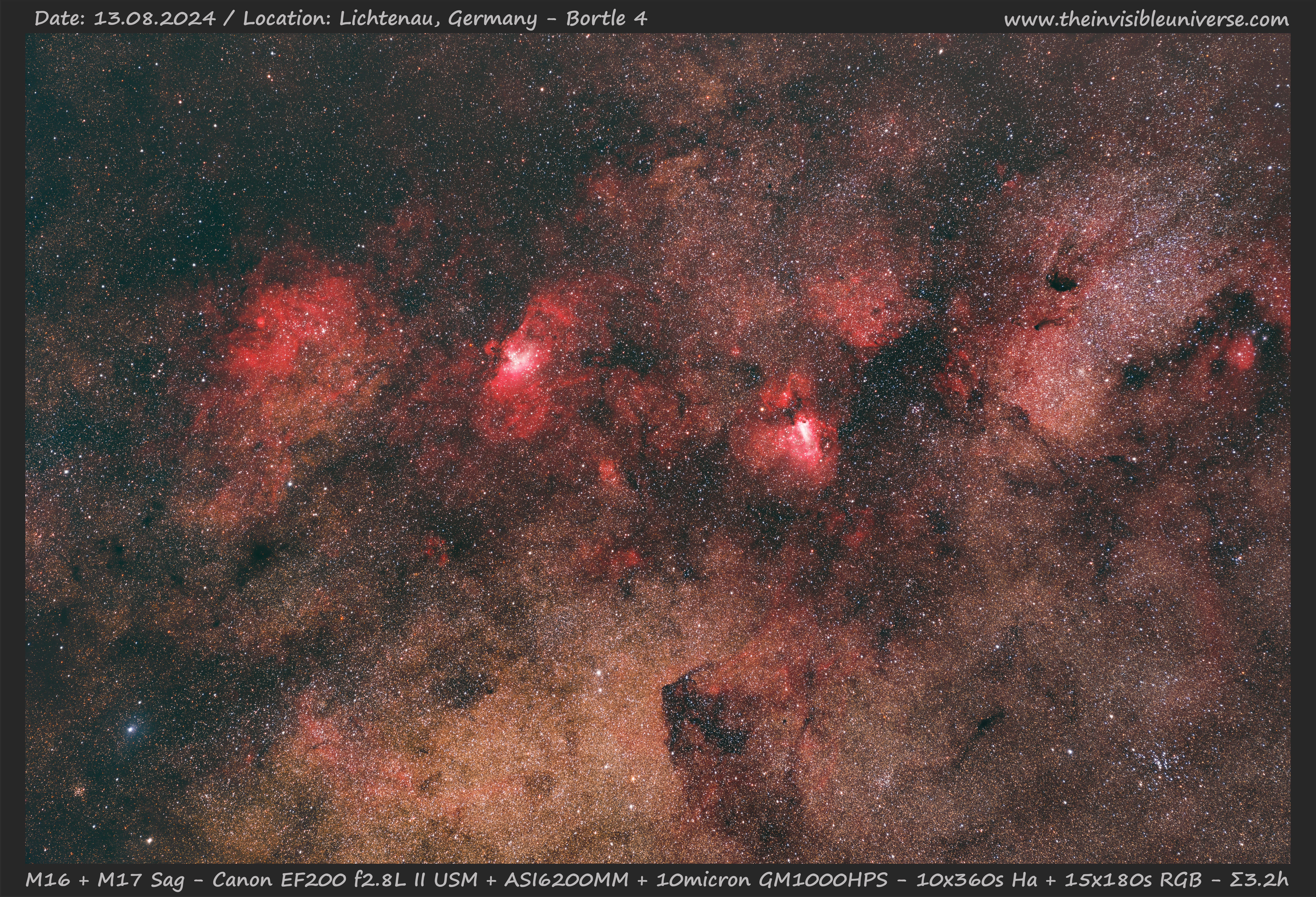 The large Ha regions of Messier 16 and 17, Eagle and Omega nebulae, in Saggittarius. I bought a Canon EF200 f2.8 again, which back then was known for its sharpness in combination with a DSLR. However, in combination with the monochrome, high-resolution full-frame CMOS camera ASI6200MM, it shows a strong coma and chromatic aberration at the edges of the image field. A significant stopping down of the lens would be necessary to improve this.