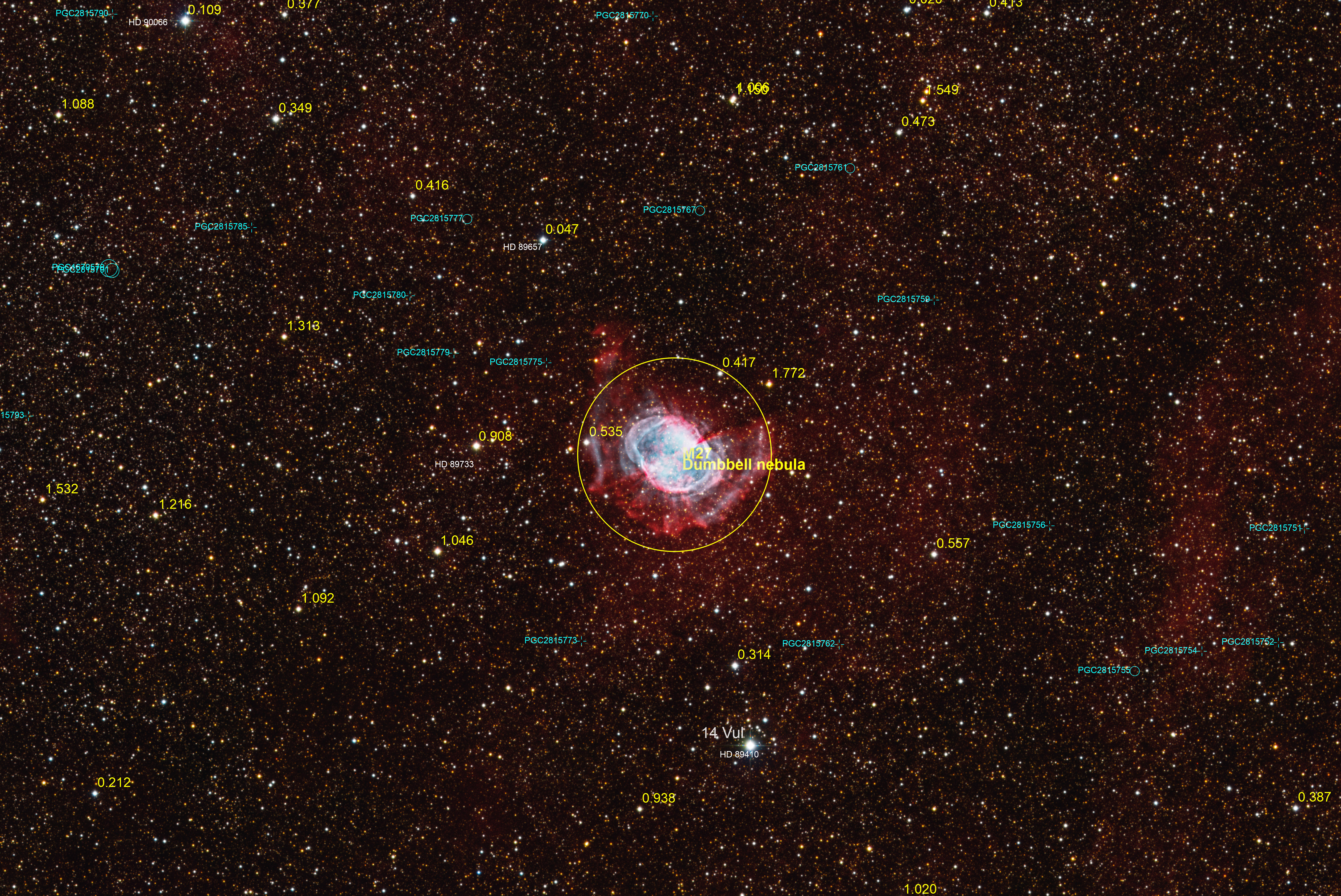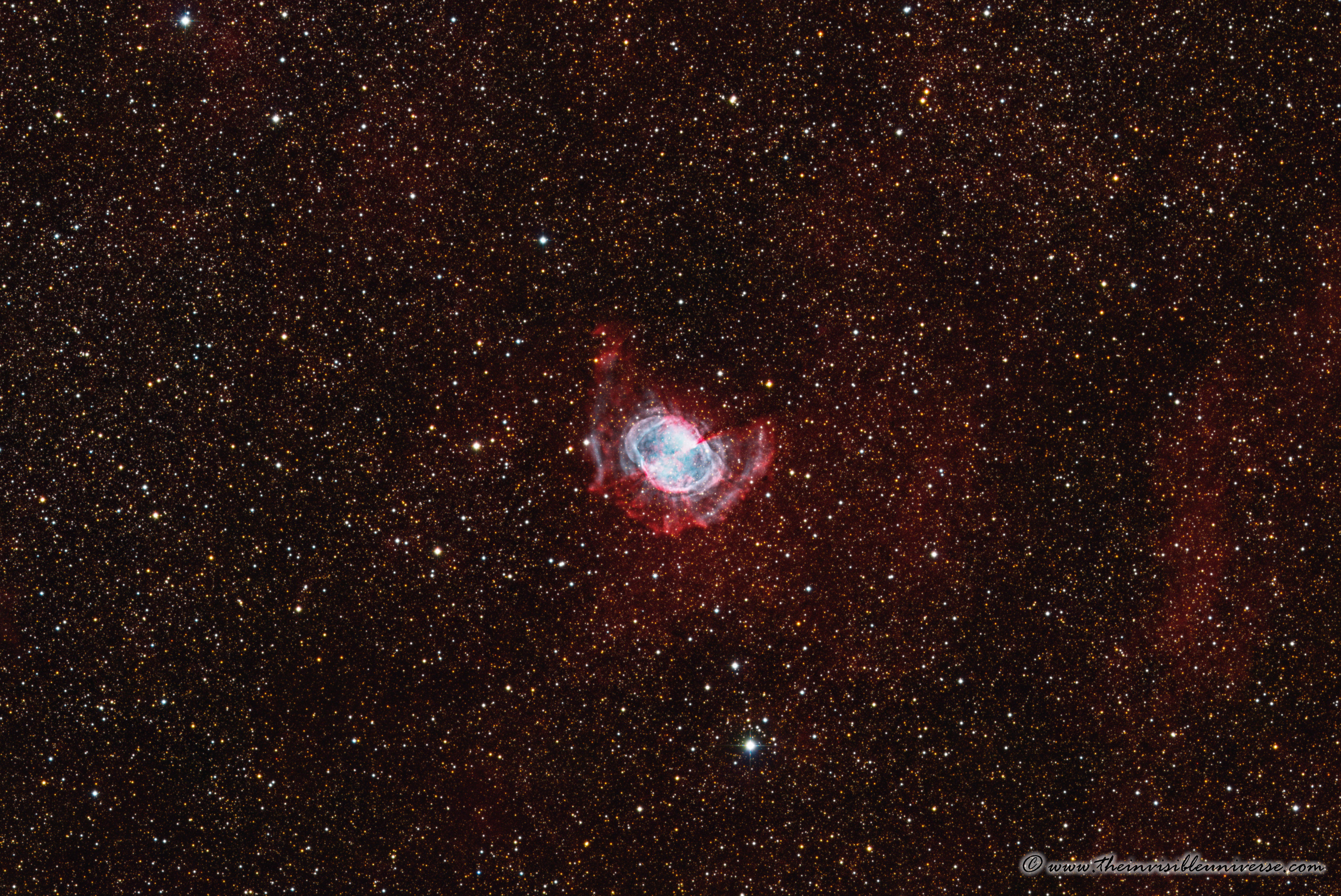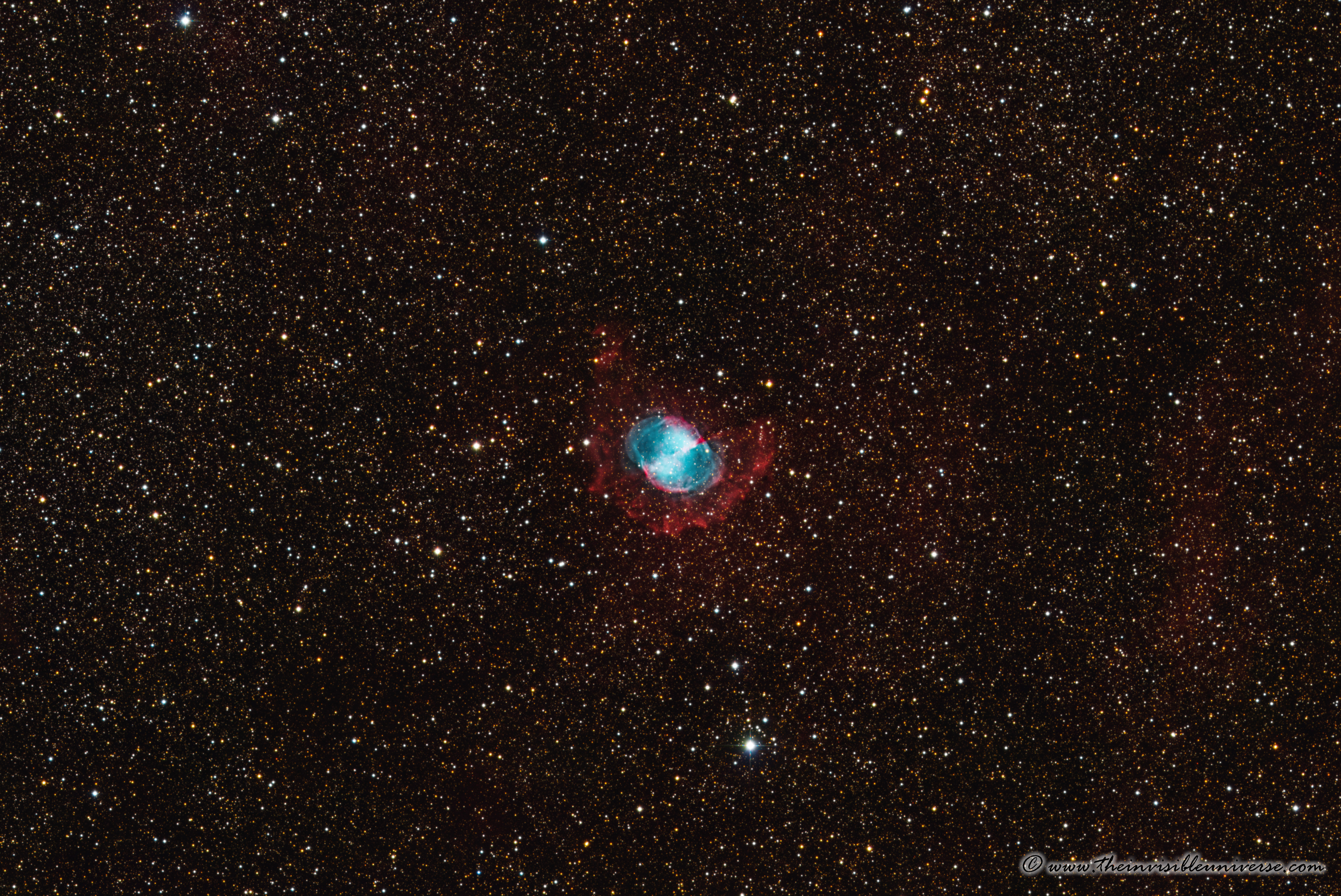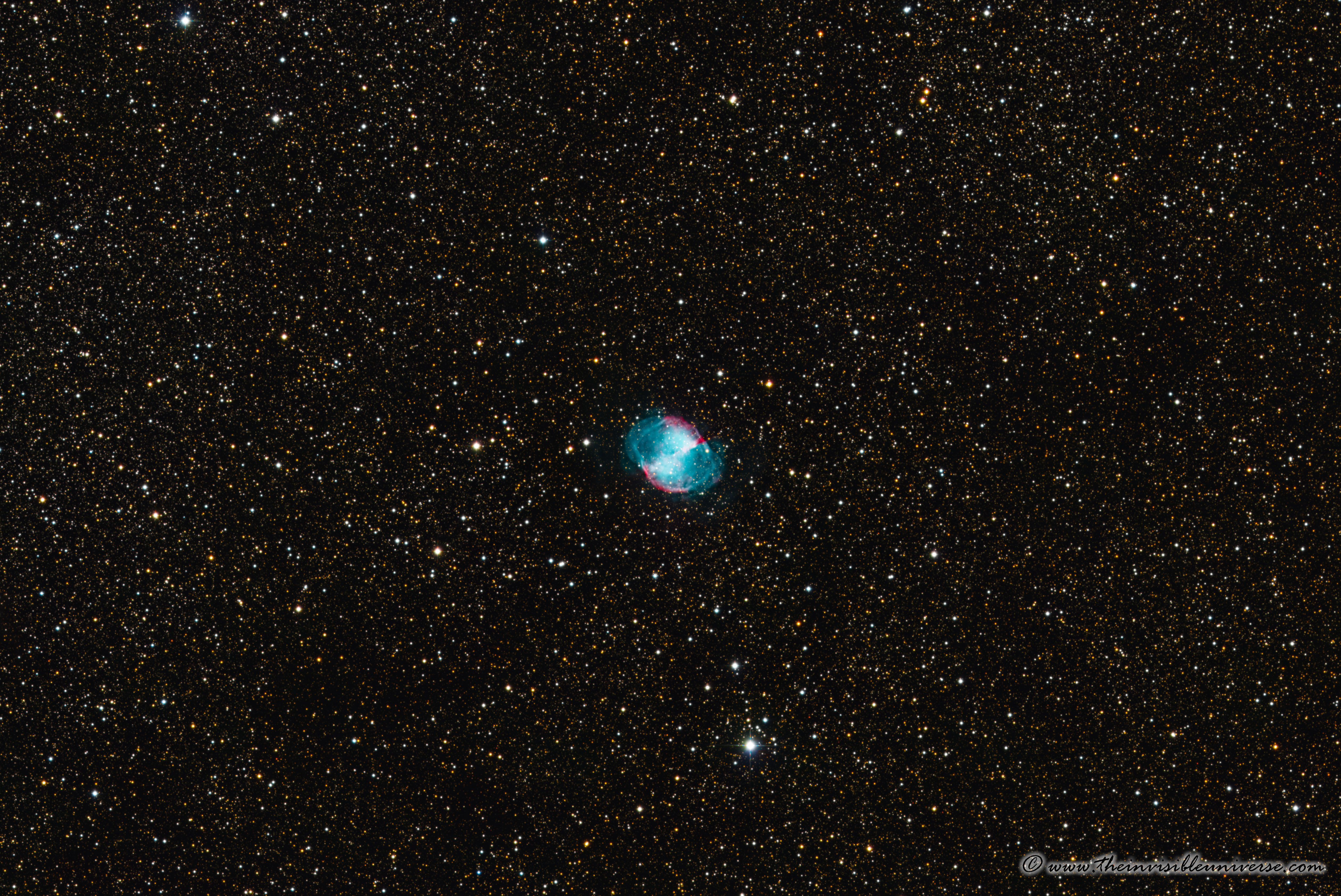 Messier 27 in Vulpeca. >Despite the small focal length of the RASAs I was able to get some details out from the outer shell of M27.