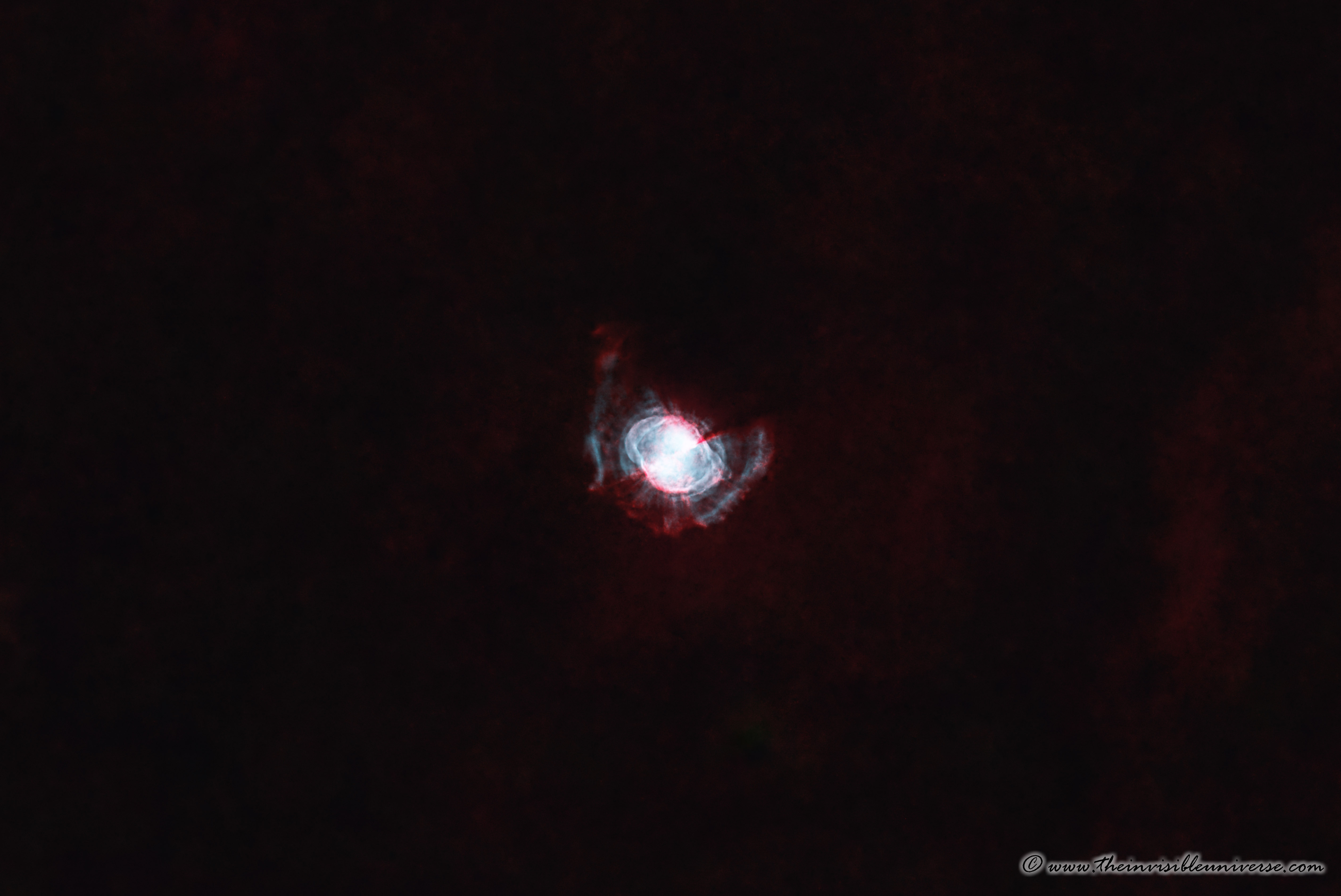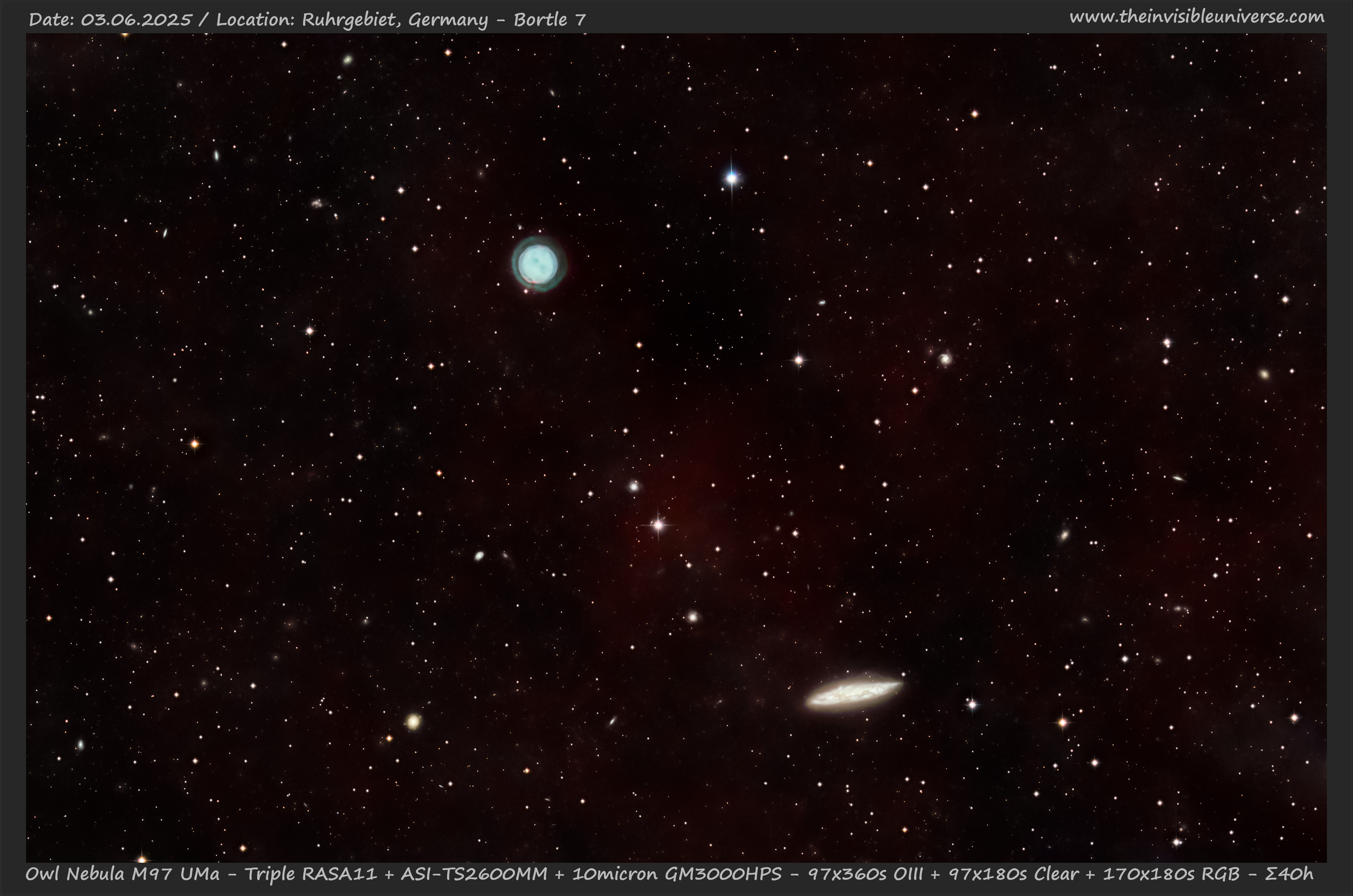 Messier 97, the Owl Nebula, as well as Messier 108 and NGC3594 in the constellation Ursus Major. In the broadband data, I noticed a faint red glow in this part of the sky, possibly a Ha emission. I tried to emphasise the faint outer shell of M97 without overexposing the bright inner part of the planetary nebula.