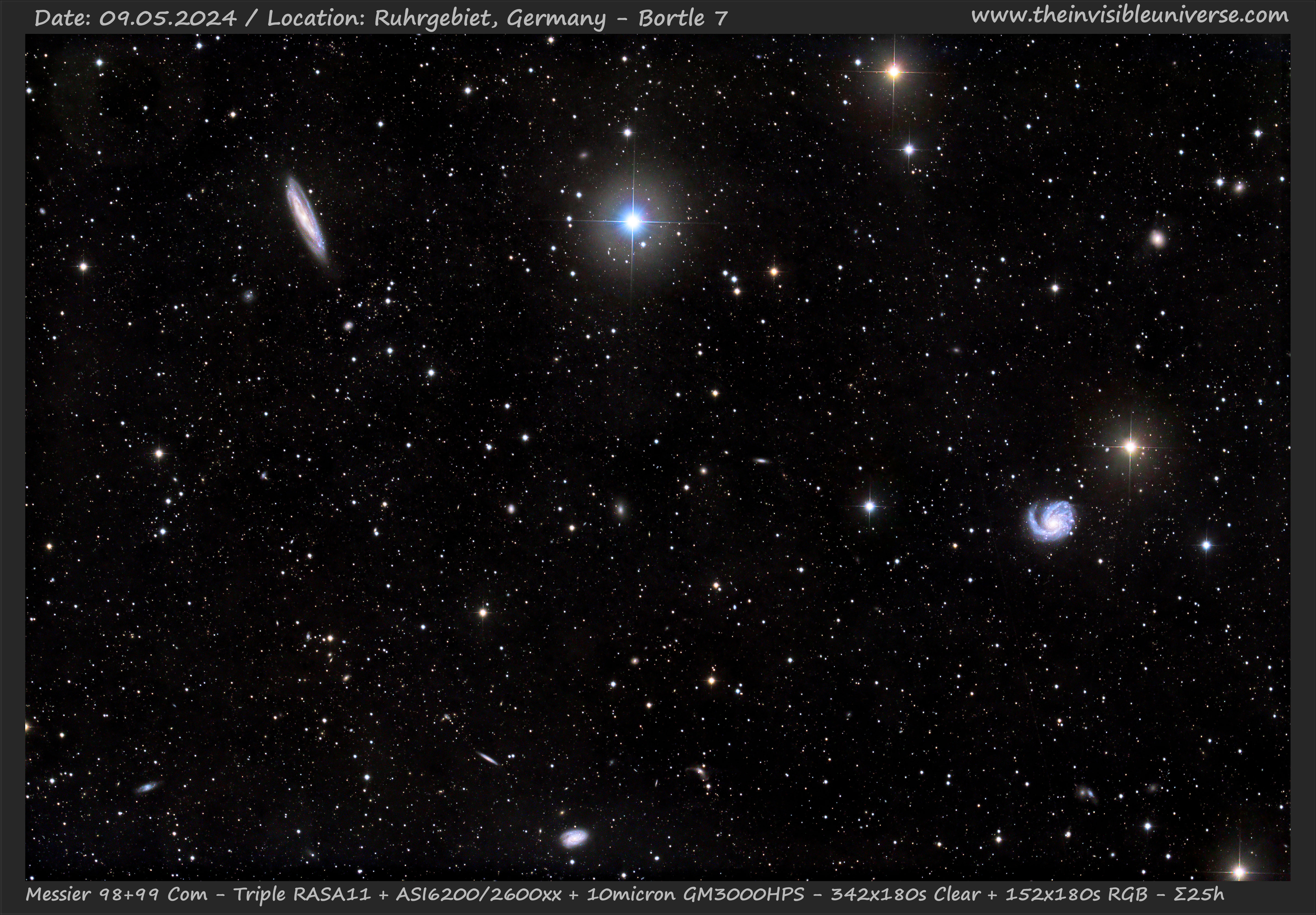 360x180s Clear + 120x180s RGB per channel. Total integration time of 36h. Triple Celestron RASA11 Astrograph + Baader 2" Highspeed Filters + 2x ASI2600MM + TS2600KMG2. Self Guided by 50 Star predictive guding model with the 10micron GM3000HPS. N.I.N.A. Astro Imaging Suite in my backyard observatory. Location: Ruhrgebiet, Germany, Bortle Class 7.