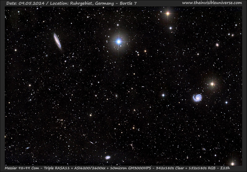 15x600s Clear + 10x180s RGB per channel. TMB 115/805 Triplet APO with M82 Riccardi Reducer @ 600mm f5.25. ASI6200MM Pro Full Frame 60Mpix camera and Baader 2" Filter + Baader M68 Tilter. 10micron GM1000HPS mount. Guiding with the ASI120mini and a 50mm Guidescope. N.I.N.A. Astro Imaging Suite and PHD Guiding with the hp Elite X2 Tablet. Location: Lichtenau, East Westfalia, Germany