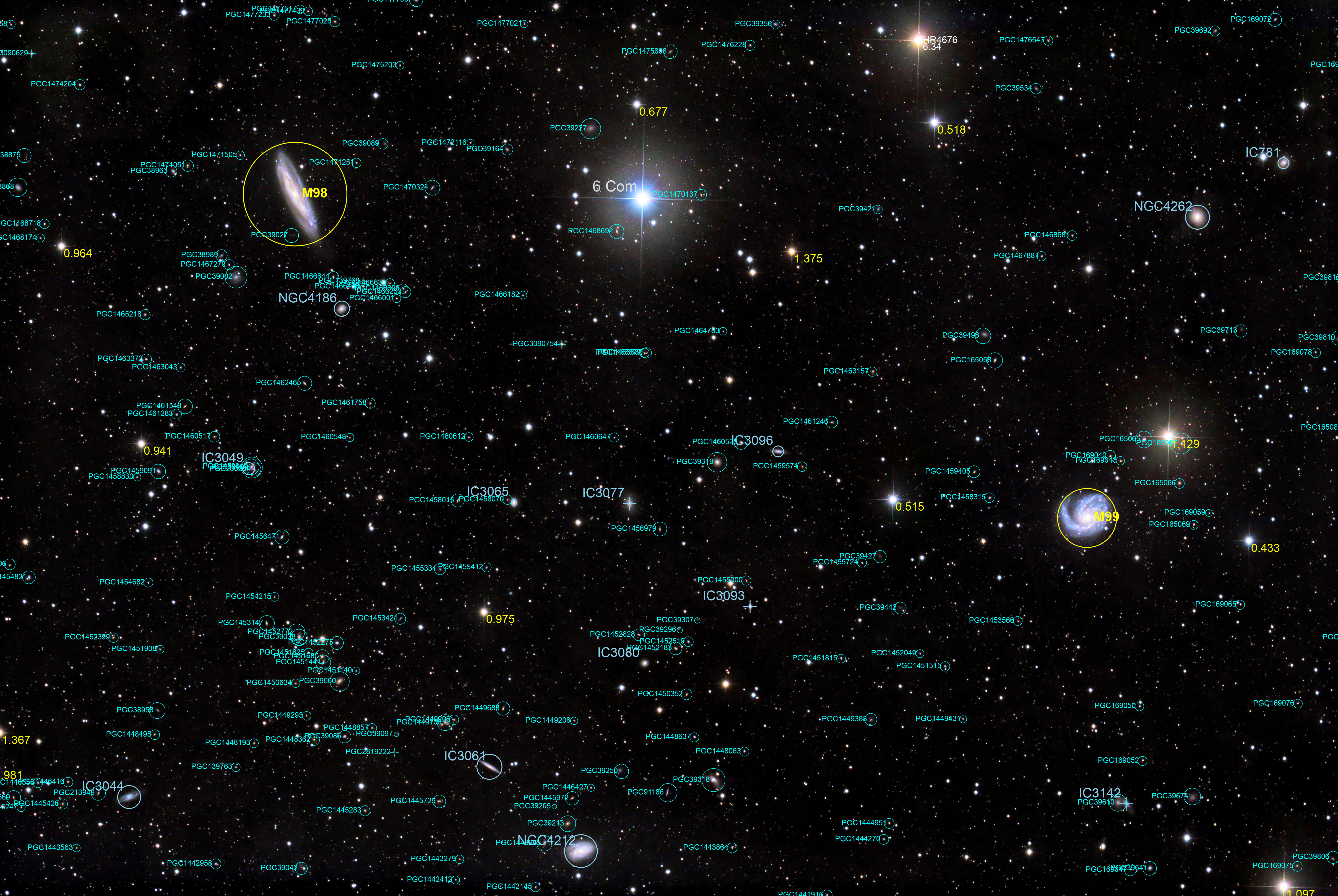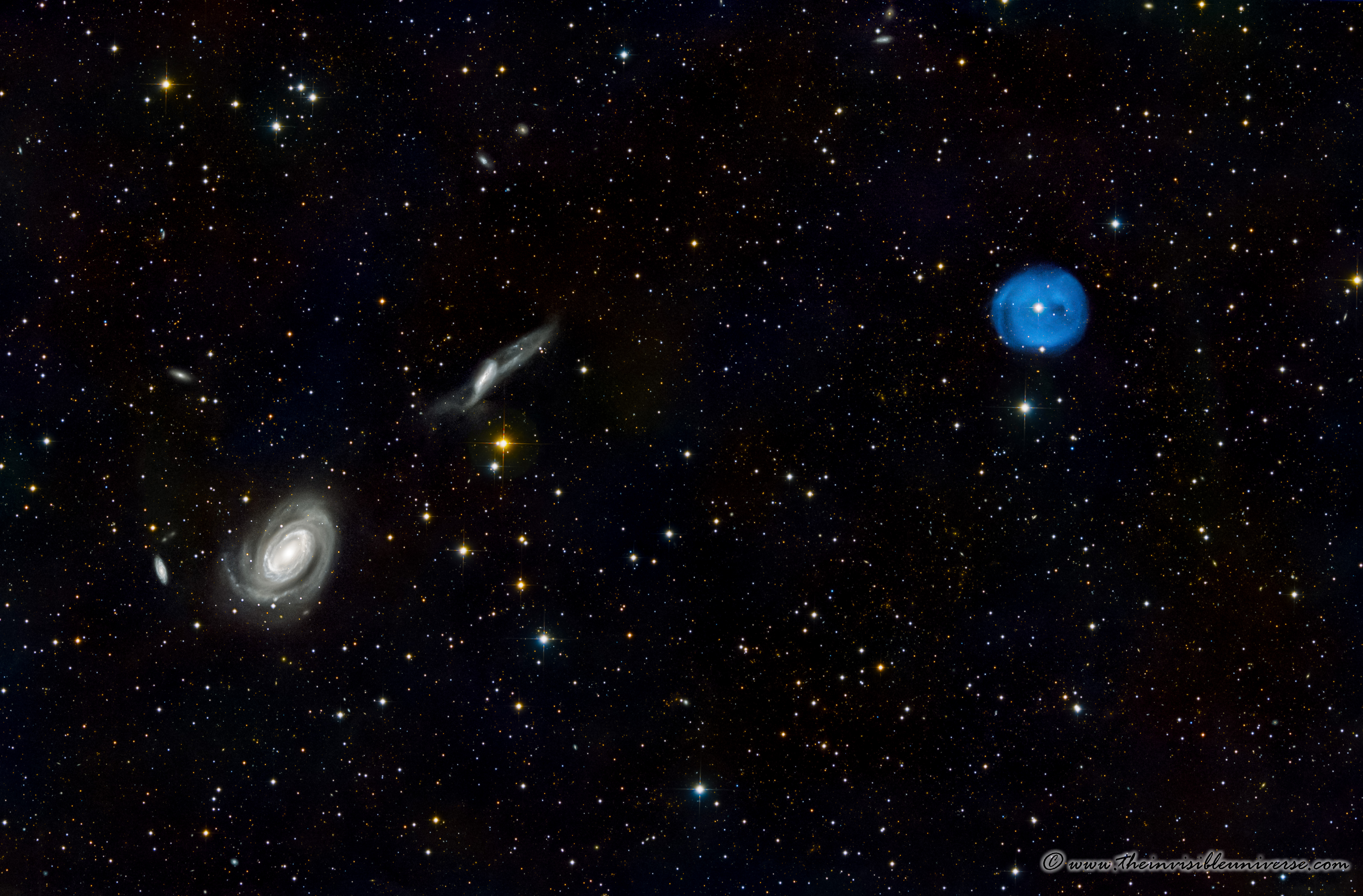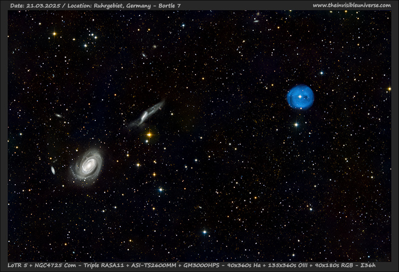 The planetary nebula LoTR 5 and NGC 4725 in Coma Berenices. This is also a re-visit of an object previously photographed with the ASA10N Newtonian astrograph. This time I used the Triple RASA11 to accumulate 36 hours of integration time at f2.2 in Ha, OIII and RGB to capture both the blue-green planetary nebula and the galaxies NGC4712, 4725 and 4747.