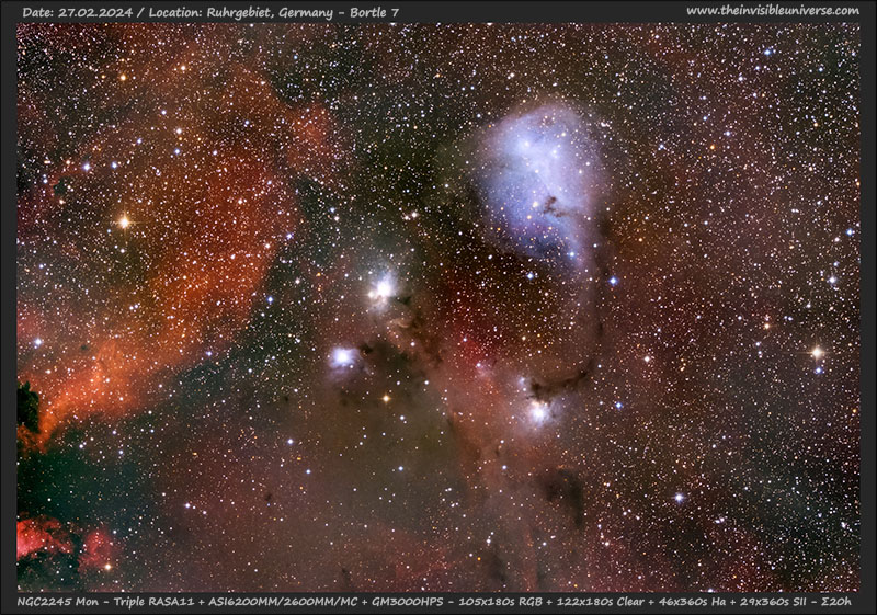 The Rosetta Nebula NGC2239 in the constellation of Monoceros. This image was taken with the new ASI6200MM Pro and 2" Baader Filters with my TMB 115-805 TMB Triplet APO and a BORG Super-reducer @f4.5. Although the image train is able to illuminate the large full format field of the gigantic 60Mpx chip of the ASI 6200, I had to crop the final image due to light reflections inside the tube caused by the bright waxing moon in the vicinity of the nebula. The image was taken near the town Billerbeck in the Muensterland in Germany, a Bortle 4 zone. However, the moon was quite bright this evening. This was also the first time I used my new Celestron CGX Mount and the Celestron StarSense AutoAlign Module outside of my backyard. This module add on is very convenient way to align your mount to the sky and do a polar align. Much easier than with my old EQ6 mount.