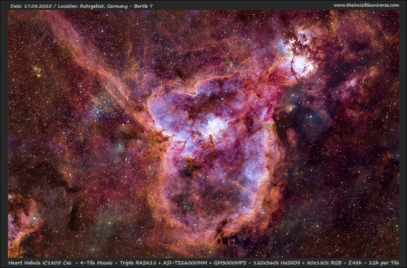 4-tile mosaic of the famous Heart Nebula with a total of 80 megapixels. I spent a total of 48 hours capturing the 6 tiles in Ha, OIII and SII as well as RGB with my triple RASA11 astrograph. Of course, it would have been easier to use a shorter focal length optic and the ASI6200MM full-frame camera with 60 MPix to capture the nebula with less effort. But in this case I have the resolution of an optic with 620 mm focal length and 11 inch aperture. However, this can only be realised if the photo is viewed in full resolution. The image processing of such a large amount of data, 4 tiles with 6 channels each, was a pain. I used Pixinsight with the integrated mosaic procedures to align the individual tiles and stitch them together.