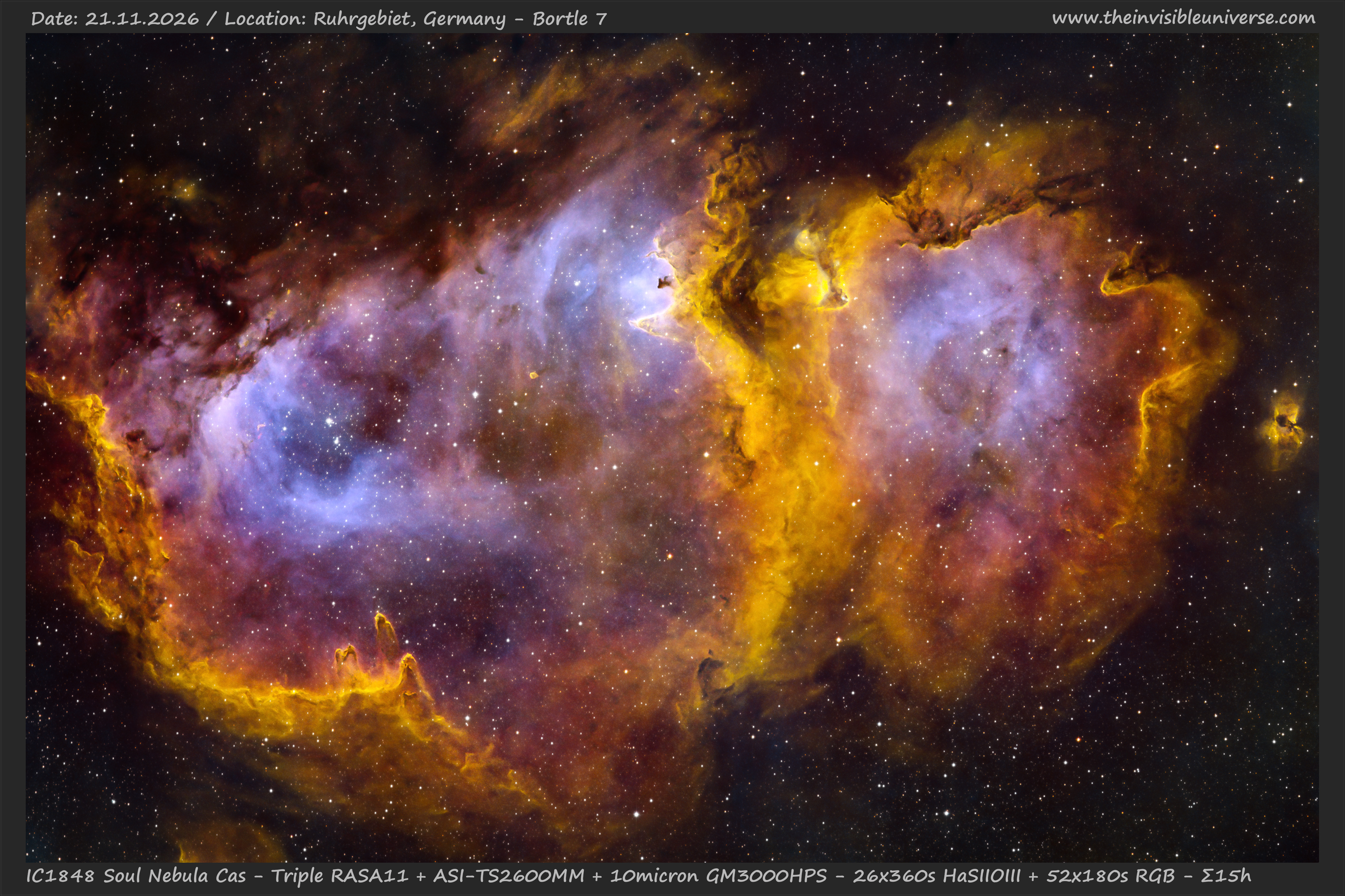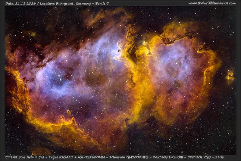 IC 1848 (known as the Soul Nebula) is a massive star-forming region in the constellation Cassiopeia, located approximately 6,500 to 7,500 light-years from Earth. Together with its western neighbour, the Heart Nebula (IC 1805), it forms the famous ‘Heart and Soul’ complex in the Perseus Arm of our Milky Way. Strictly speaking, the name IC 1848 refers to the open star cluster inside, but it is mostly used for the entire nebula region, analogous to Sh2-199. Other objects in the region include the HII regions LBN667, LBN 670 and LDN673.