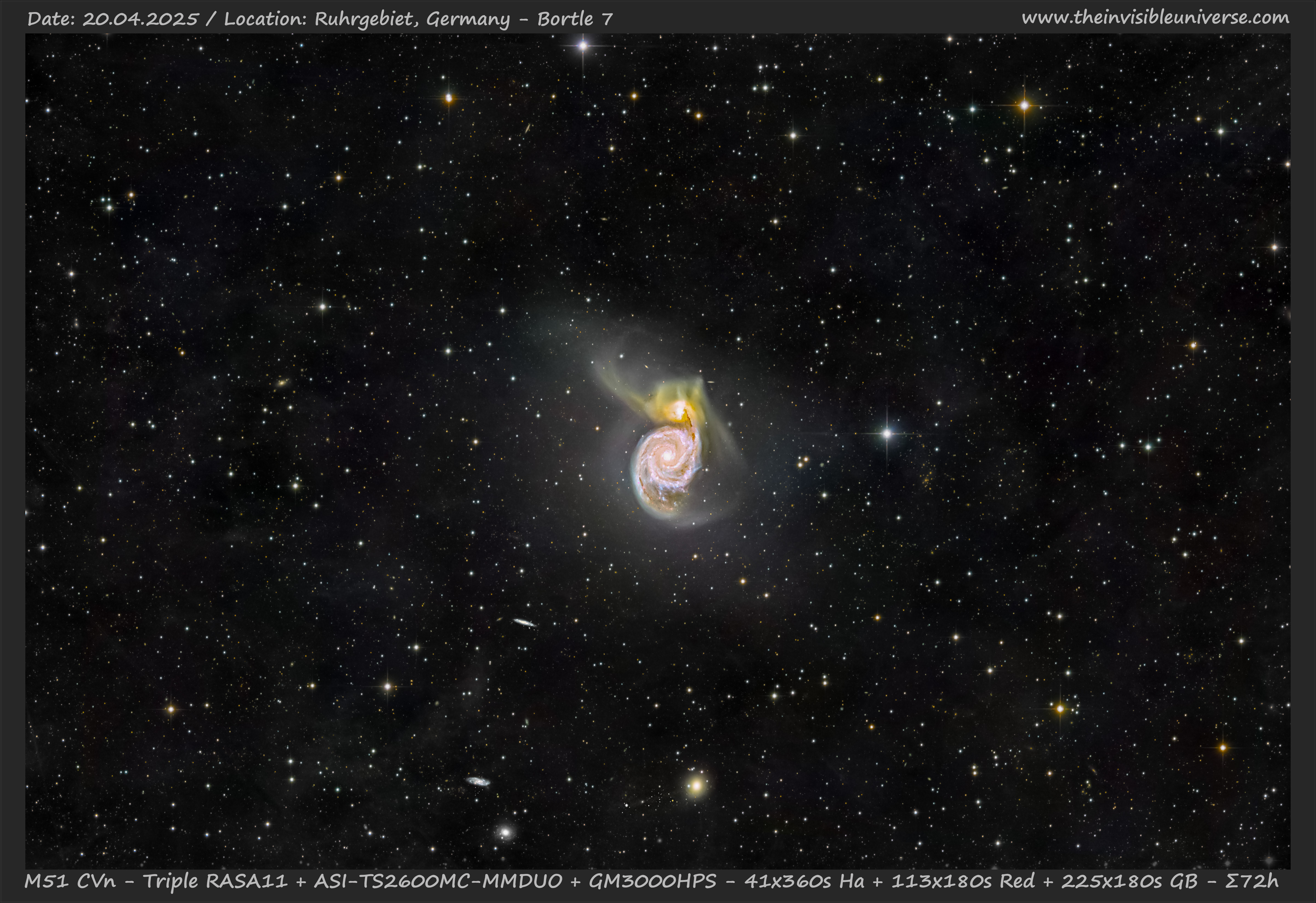 Messier 51 in Canes Venatici with NGC5195 and lots of other galaxies. This is of course not the first image I have taken of this beautiful Galaxy. Long exposure images of M51 taken under dark skies show a lot of interstellar gas and dust. So I wanted to try to capture the intergalactic flux nebula around M51 from a Bortle 7 zone. I needed 32 hours of integration time in RGB and Ha. There are many small and faint background galaxies visible, only a fraction of which have a PGC name! I had to discard many of the images in the red channel due to technicals issues. Finally, I aquired a brand new ASI2600MDUO with an integrated guiding chip.