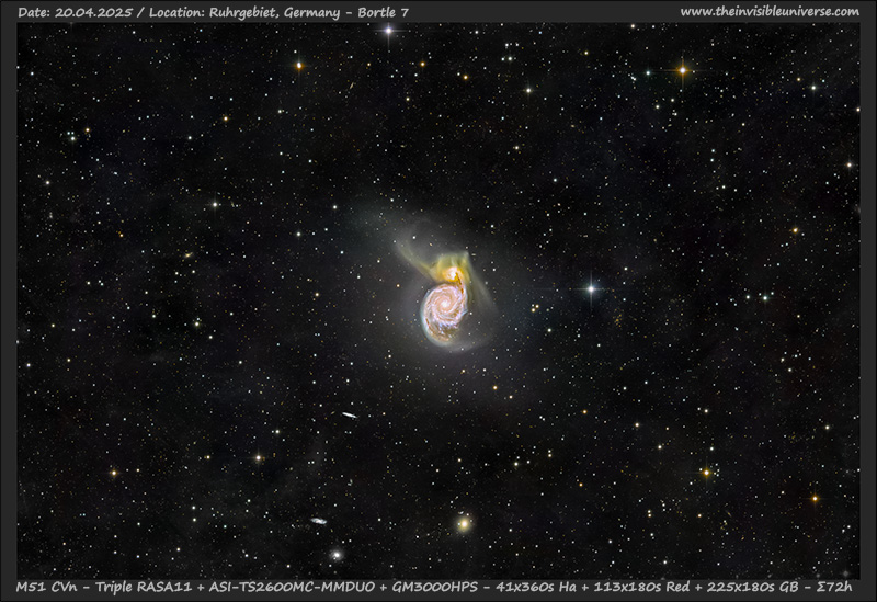 798x180s Clear + 104x180s RGB per channel. Total integration time of 55h. Triple Celestron RASA11 Astrograph + Baader 2" Highspeed Filters + ASI2600MDUO + ASI2600MM + TS2600KMG2. Self Guided by 50 Star predictive guding model with the 10micron GM3000HPS, supported by the ZWO DUO guiding chip. N.I.N.A. Astro Imaging Suite in my backyard observatory. Location: Ruhrgebiet, Germany, Bortle Class 7.