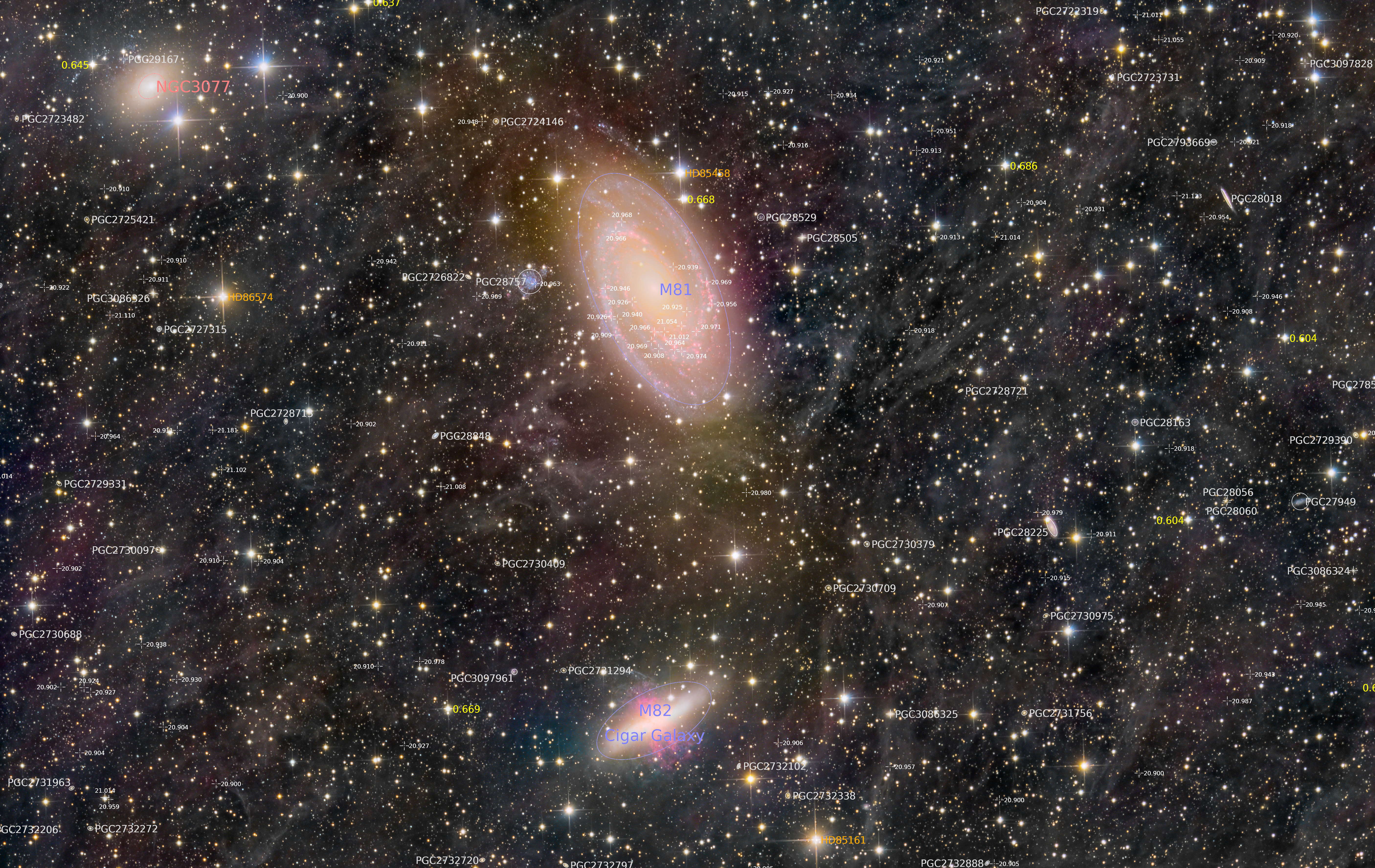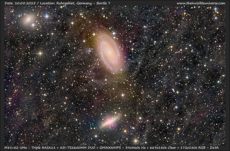 This is a revisit of Bode's Galaxy M81 and M82, the Cigar Galaxy, in the constellation Ursus Major. I had already imaged this target in 2023 with a predecessor version of my current triple RASA11 equipment, but only for 10 hours. The intention was to capture more of the integrated flux nebula around these two galaxies and the faint Ha glow. I put in a total of 63 hours of integration time, over 33 hours of which was with a clear filter alone. Also visible is the satellite galaxy PGC28757, also known as UGC 5336 or Holmberg IX, an irregular dwarf galaxy near M81, as well as NGC3077. As the background with the IFN is emphasised in the image processing, it is difficult to remove satellite and aircraft trails.