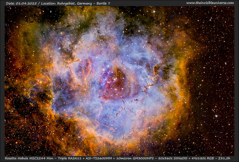104x360s Ha + 148x360s OIII + 50x360s SII + 10x180s RGB per channel. Total integration time of 31h. Triple Celestron RASA11 Astrograph + Baader 2" Highspeed Filters + 2x ASI2600MM + TS2600KMG2. Self Guided by 50 Star predictive guding model with the 10micron GM3000HPS. N.I.N.A. Astro Imaging Suite in my backyard observatory. Location: Ruhrgebiet, Germany, Bortle Class 7.