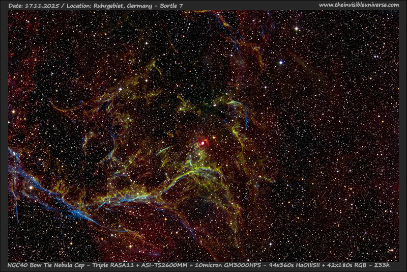NGC 40 (also known as the Bow Tie Nebula or Caldwell 2) is a bright planetary nebula located in the constellation Cepheus. The nebula has a barrel-shaped main structure with two bright arcs on opposite sides, which gave it the name ‘Bow Tie’. The central star is classified as [WC8], indicating a hydrogen-poor, carbon-rich star similar to massive Wolf-Rayet stars. The planetary nebula is actually too small for the RASA11's 620 mm focal length, but the gas clouds surrounding the nebula are also interesting. The structure of the planetary nebula can be seen very clearly in a large amateur telescope. In the summer of 2025, I was able to observe the nebula several times under the dark Alpine sky with my Celestron C14 – a worthwhile object!