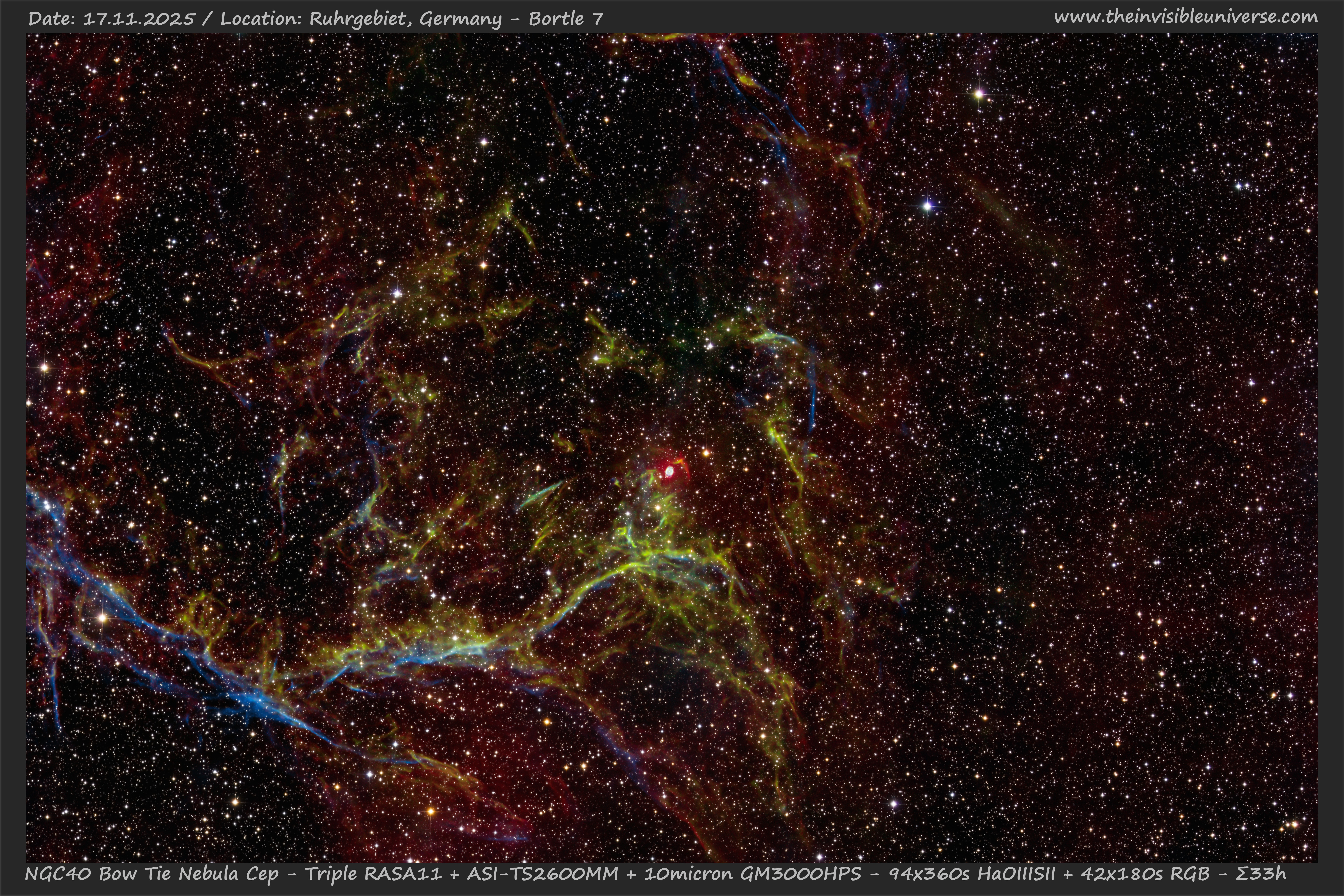 18x360s HaOIIISII + 42x180s RGB per channel. Total integration time of 33h. Triple Celestron RASA11 Astrograph + Baader 2" Highspeed Filters + ASI2600MDUO + ASI2600MM + TS2600KMG2. Self Guided by 50 Star predictive guding model with the 10micron GM3000HPS, supported by the ZWO DUO guiding chip. N.I.N.A. Astro Imaging Suite in my backyard observatory. Location: Ruhrgebiet, Germany, Bortle Class 7.