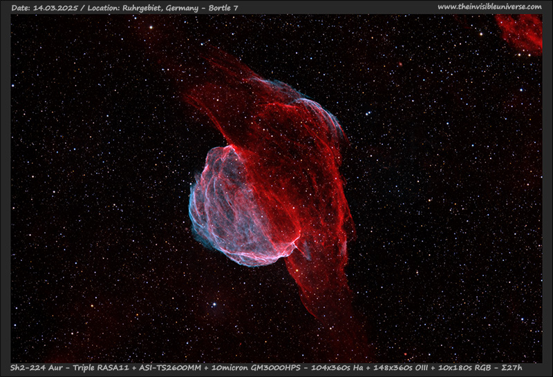 90x360s Ha + 135x360s OIII + 90x180s RGB per channel. Total integration time of 36h. Triple Celestron RASA11 Astrograph + Baader 2" Highspeed Filters + 2x ASI2600MM + TS2600KMG2. Self Guided by 50 Star predictive guding model with the 10micron GM3000HPS. N.I.N.A. Astro Imaging Suite in my backyard observatory. Location: Ruhrgebiet, Germany, Bortle Class 7.