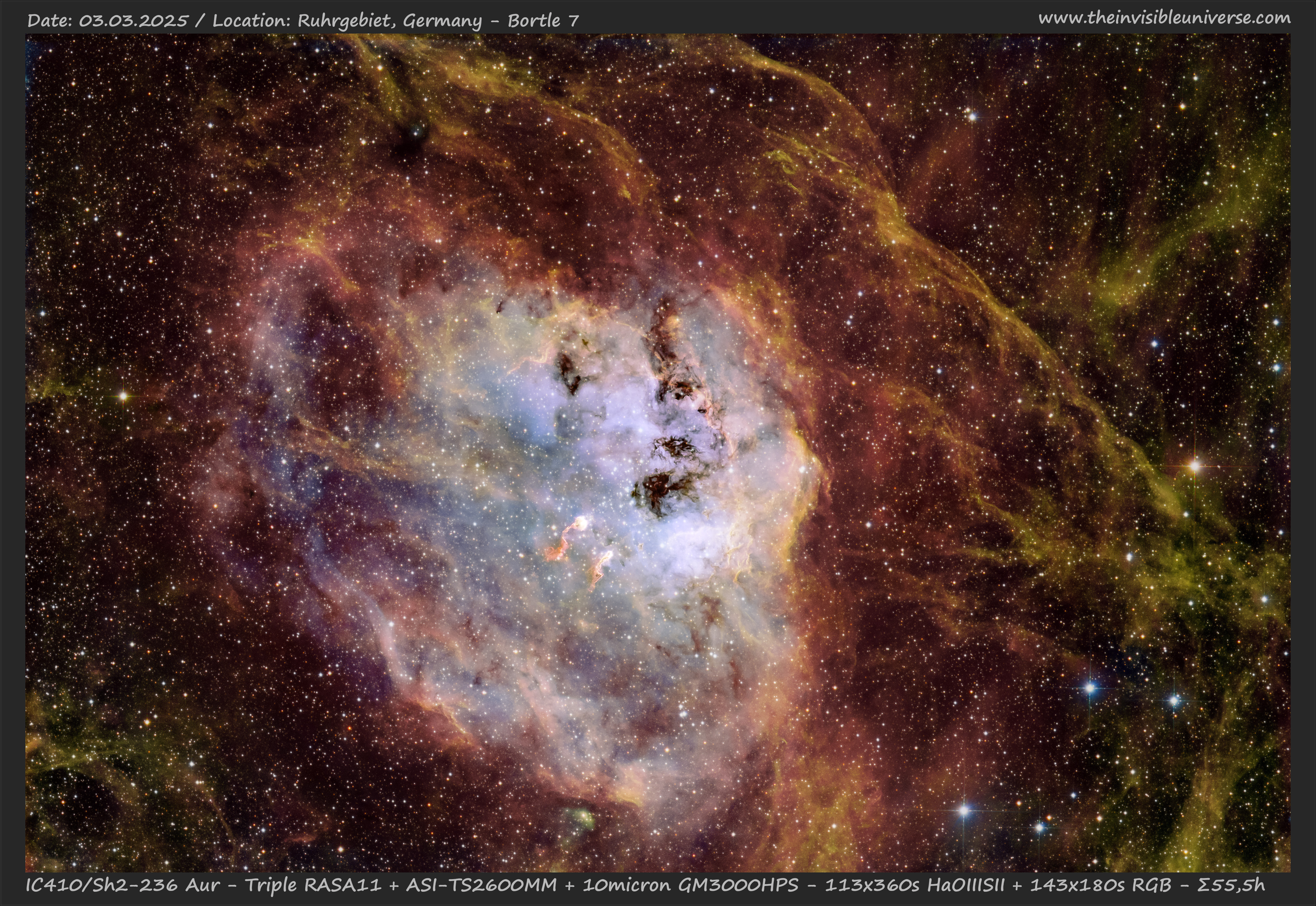 IC410 Tadpole Nebula or Sh2-236 in the constellation Auriga. This region lies very close to the Flaming Star Nebula in the sky, but is much further away. Inside the nebula is the young and hot star cluster NGC1893, which is part of the Auriga OB2 stellar association. The hot and bright O stars of the cluster emit energy that ionises the surrounding gas of IC410. The Tadpoles within the nebula are the dust and gas remnants of NGC1893. The gas tails are blown away by the radiation pressure of the young hot stars.