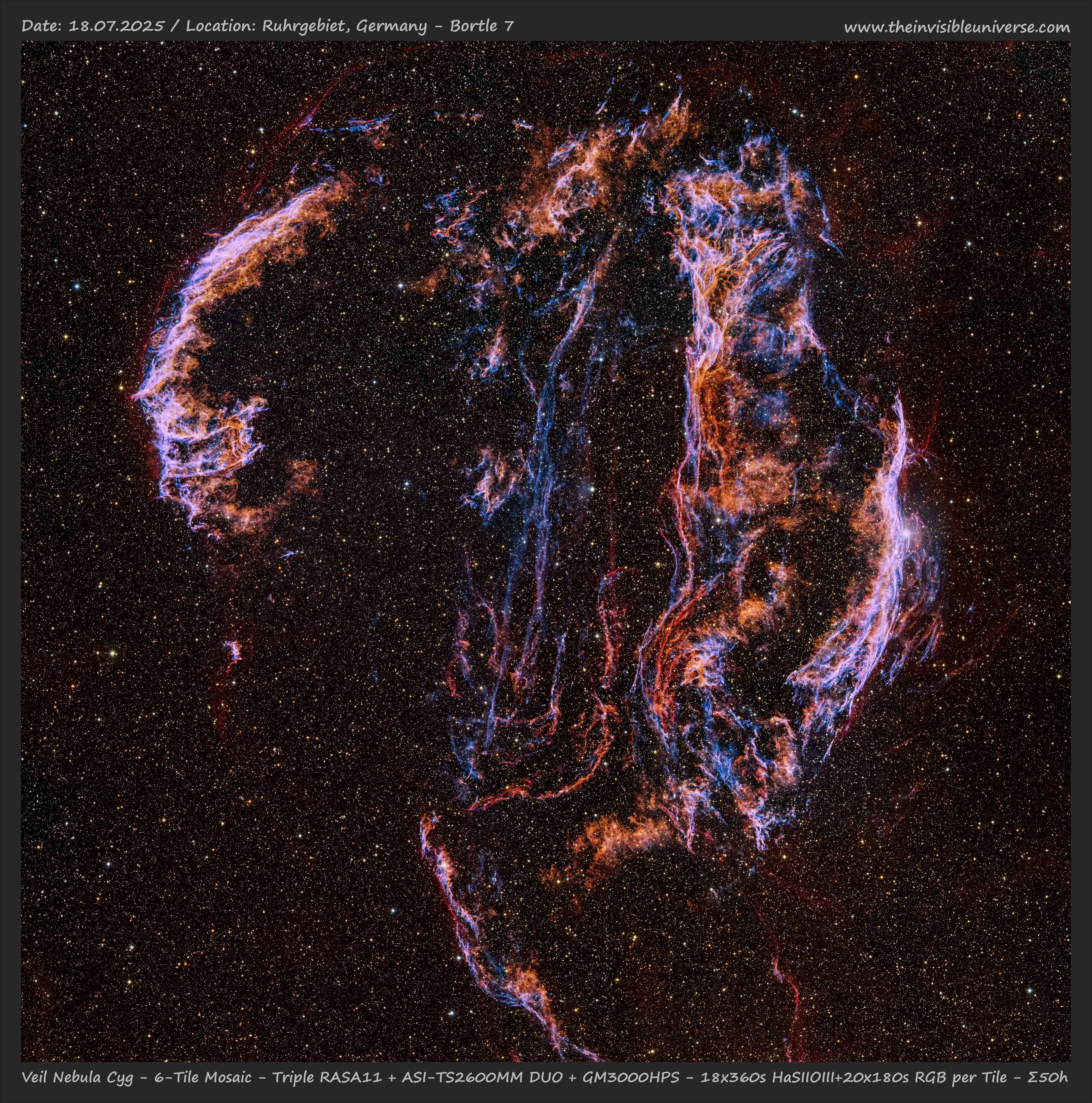 This is my huge 6-tile mosaic of the famous Veil Nebula with a total of 120 megapixels. I spent a total of 50 hours capturing the 6 tiles in Ha, OIII and SII as well as RGB with my triple RASA11 astrograph. Of course, it would have been easier to use a shorter focal length optic and the ASI6200MM full-frame camera with 60 MPix to capture the nebula with less effort. But in this case I have the resolution of an optic with 620 mm focal length and 11 inch aperture. However, this can only be realised if the photo is viewed in full resolution. The image processing of such a large amount of data, 6 tiles with 6 channels each, was a pain. I used Pixinsight with the integrated mosaic procedures to align the individual tiles and stitch them together.