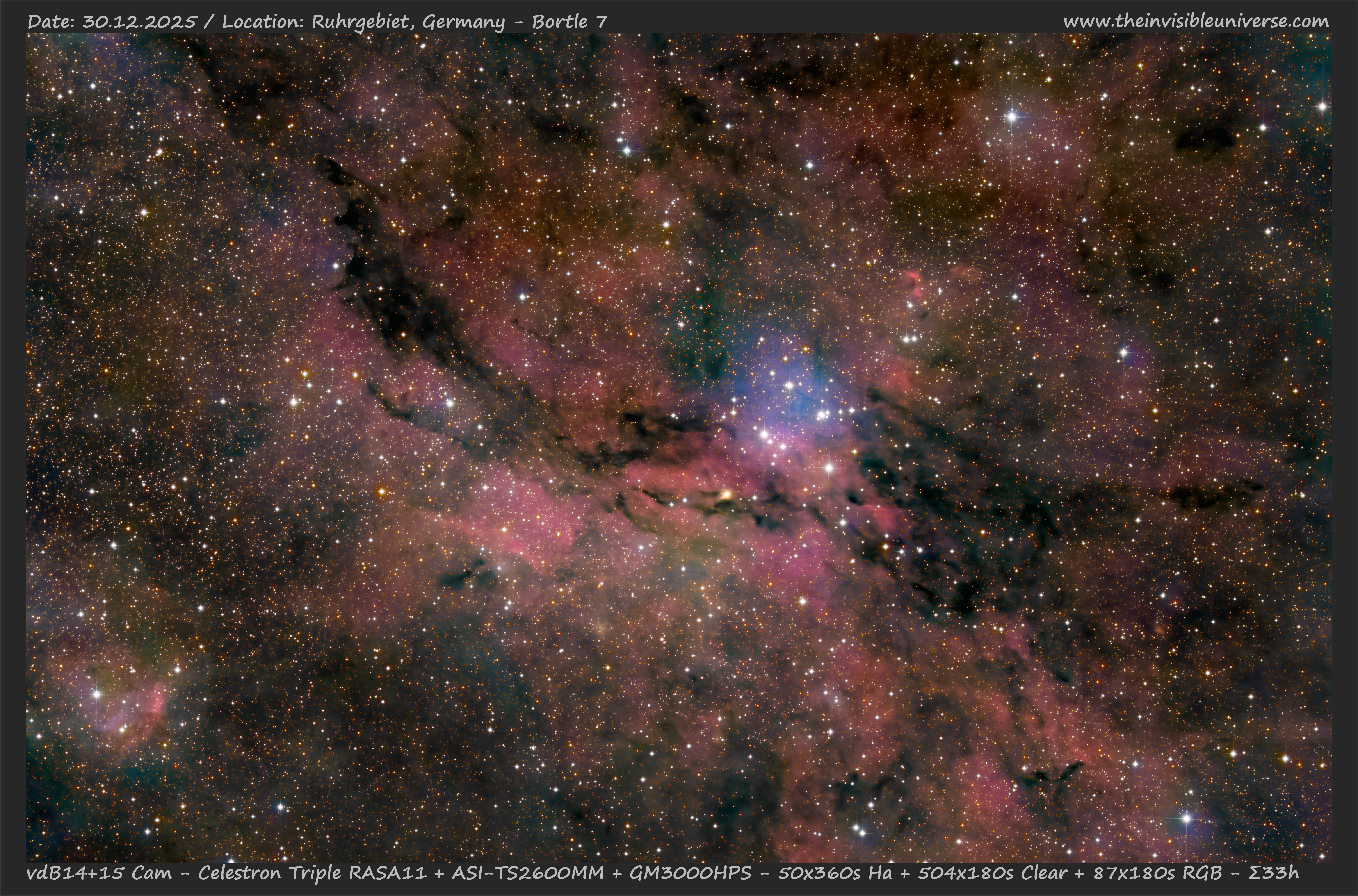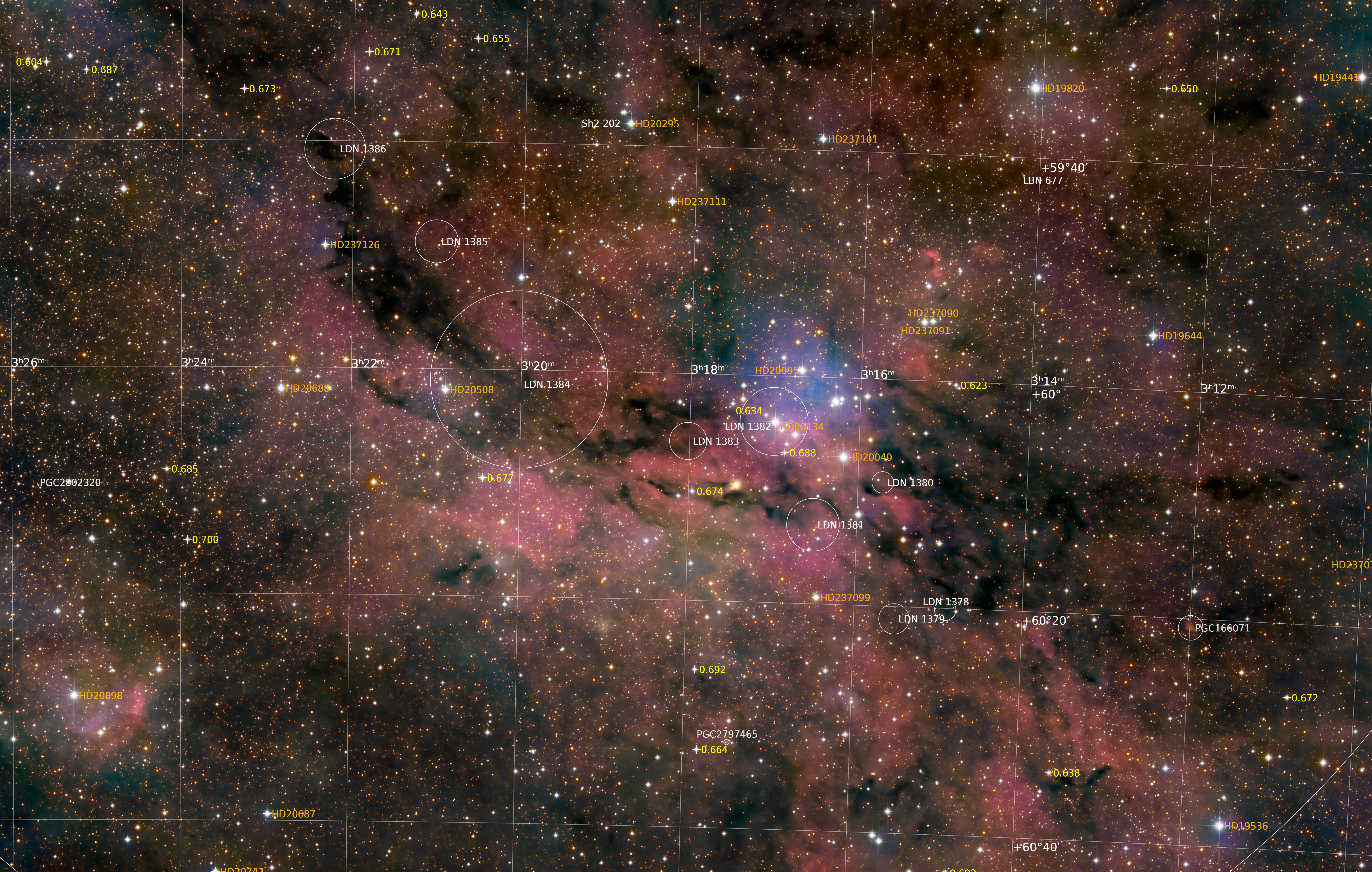 Van den Berg vdB14 + 15 in the constellation Camelopardalis. In the center is the dark nebula LDN 1382 and an open cluster called Pazmino's Cluster. The HII region around Pazmino's Cluster, Sh2-202, is part of a complex star-forming region that also includes the reflection nebulae vdB 14 and vdB 15, as well as various dark clouds such as LDN 1378 - 1386.