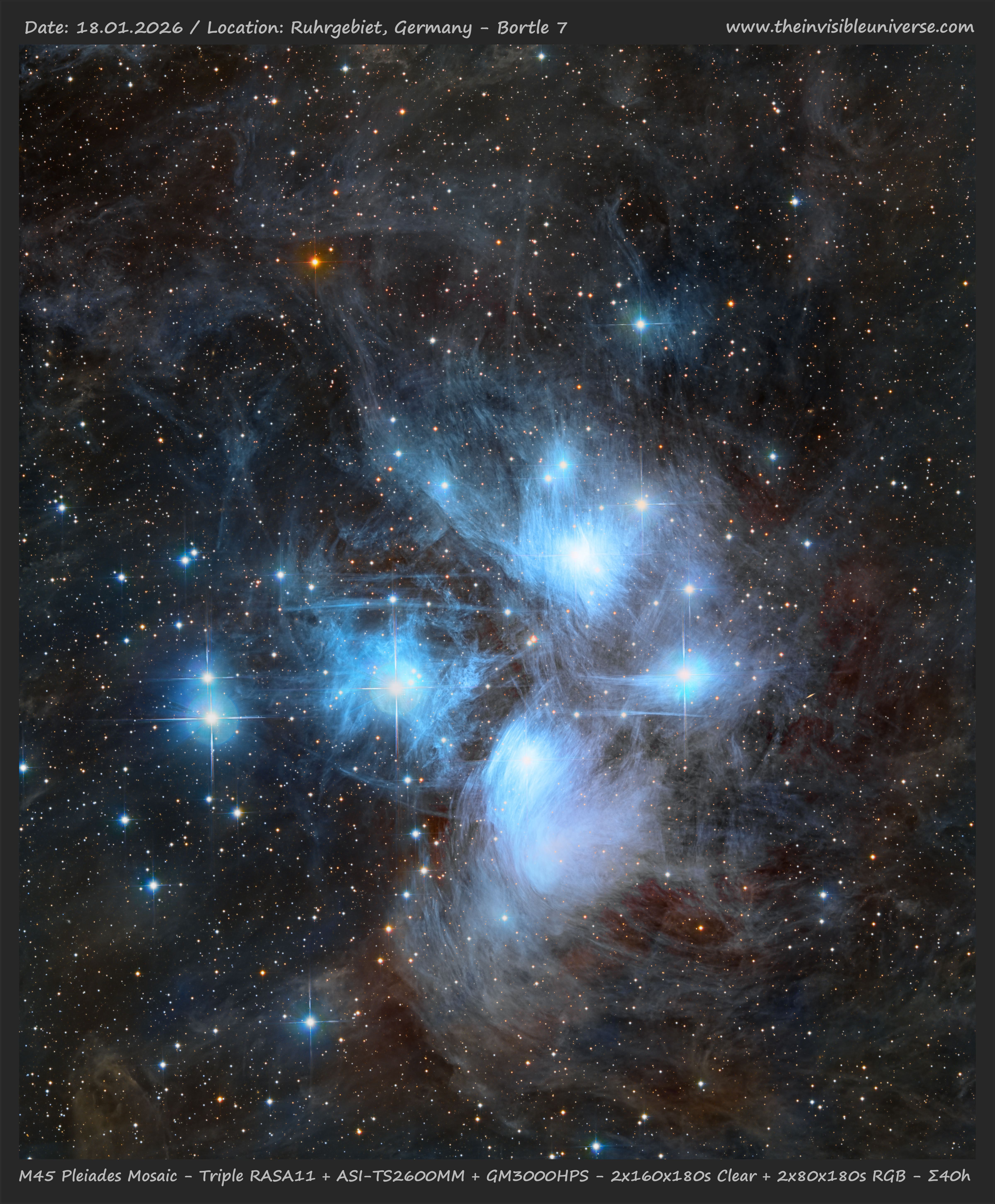 This is a 2-tile mosaic of the Pleiades or Messier 45 in Taurus with the Triple RASA11. Since the APS-C chip of the ASI2600MM cannot cover the entire field of the Pleiades star cluster at 620 mm with the RASA11, I had to create a mosaic. Some time ago, I photographed M45 with the Celestron C11 using a Hyperstar and a full-frame camera with a larger field of view, but I also wanted to try my triple RASA11 to gain a deeper insight into this fascinating area of the sky. It is interesting to observe the blue glowing dust with its streamers, which lies in front of a rather reddish molecular cloud with less structure. There is even a faint galaxy, PGC13696, in the vicinity of the star Electra the background behind all the dust. If you look closely, the background is actually full of very faint galaxies!