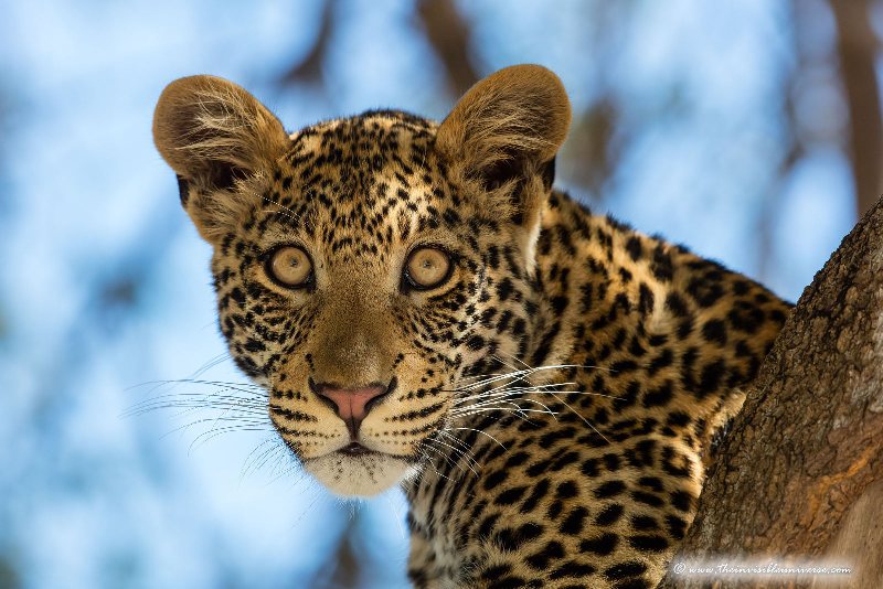 A young leopard in Chobe National Park is watching me. The animal's intense eyes stare mysteriously at the observer. The animal is sitting in a tree and I am less than 15 metres away in the off-road vehicle. How fortunate that there is a car door between him and me. The proximity to the animal and the resolution of the Canon 5DsR with its 50 MP on the EF 500 f4 II allows every single hair of the leopard to be recognised in the original image!