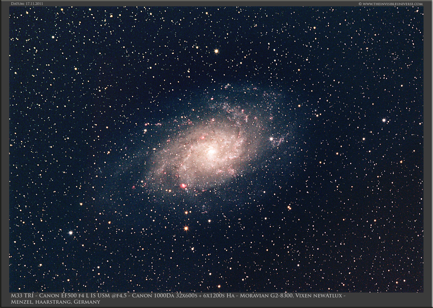 Das EF500 wird damit zur ultimativen Astrowaffe für sehr gute Bildergebnisse bei verhältnismäßig kurzen Belichtungszeiten und kaum Gewicht. Damit kann man auch eine sehr leichte Montierung, wie z.B. eine Vixen Superpolaris als Nachführplattform wählen. Diese würde einen 4,5" APO mit 500 mm Brennweite und sicherlich über 5 KG Gewicht nicht halten können.