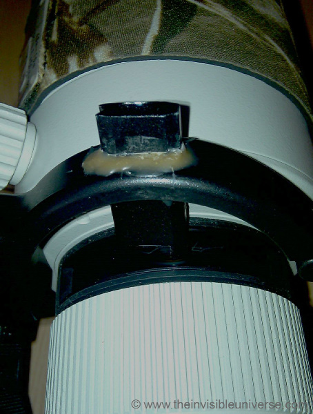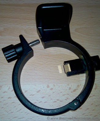Die Halterung für den Prismenfinger aus dem TSOAG9 habe ich mittels einer Plastik-Objektivschelle, die vom Durchmesser optimal um den Teil des Objektives passt und nur wenige Euro kostet realisiert. Ein gedrehter Ring aus Alu mit Scharnier wäre natürlich schöner, aber Mangels Drehbank habe ich diesen Weg beschritten.