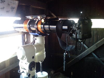 Bei diesem Refraktor handelt es sich um einen vom A&M gefertigten Carbontubus mit 3,5“ Starlight-Okularauszug. Die gesamte mechanik ist auf Stabilität getrimmt, was der Astrophotograph zu schätzen weiss, da sich hier wirklich nichts verbiegen kann. Dementsprechend schwer ist der Tubus: 9 kg plus weitere 2 kg für Rohrschellen und Montageplatte. Damit ist jedes Fotoistativ und auch viele kleinere astronomische Montierungen überfordert. Um wirklich kein Risiko einzugehen den wertvollen Refraktor zu beschädigen kam deshalb nur die Montage auf der dafür vorgesehenen astronomischen Montierung samt Dreibein in Frage: eine Vixen New Atlux plus Baader Hartholzstativ, eine Kombination die astrophototechnisch als ausgewogen bezeichnet werden kann. Gesamtgewicht des Unterbaus inklusive des notwendigen 7 kg schweren Gegengewichtes: ca. 40 kg.......