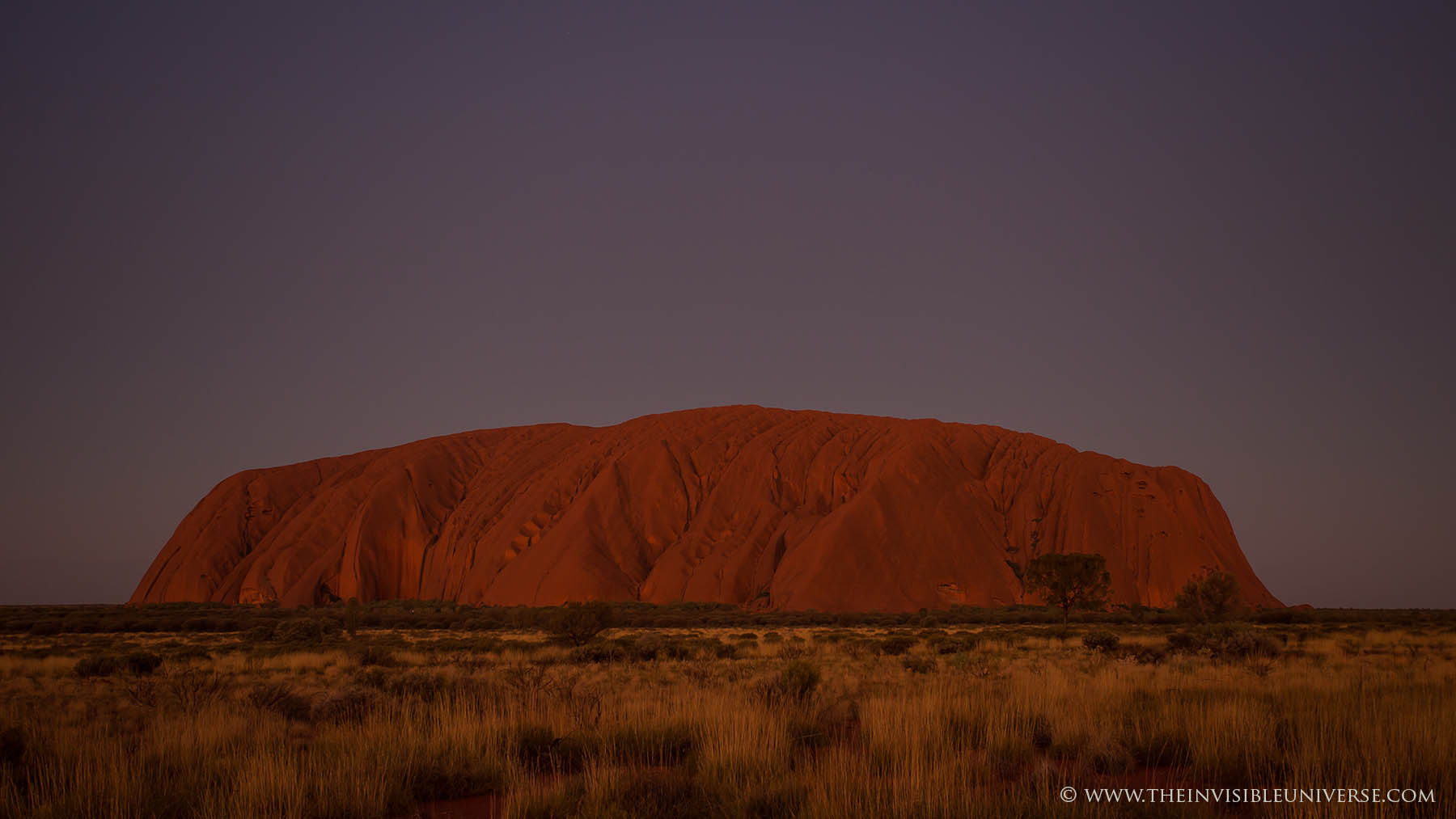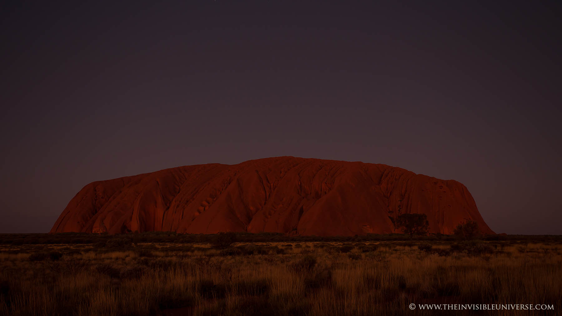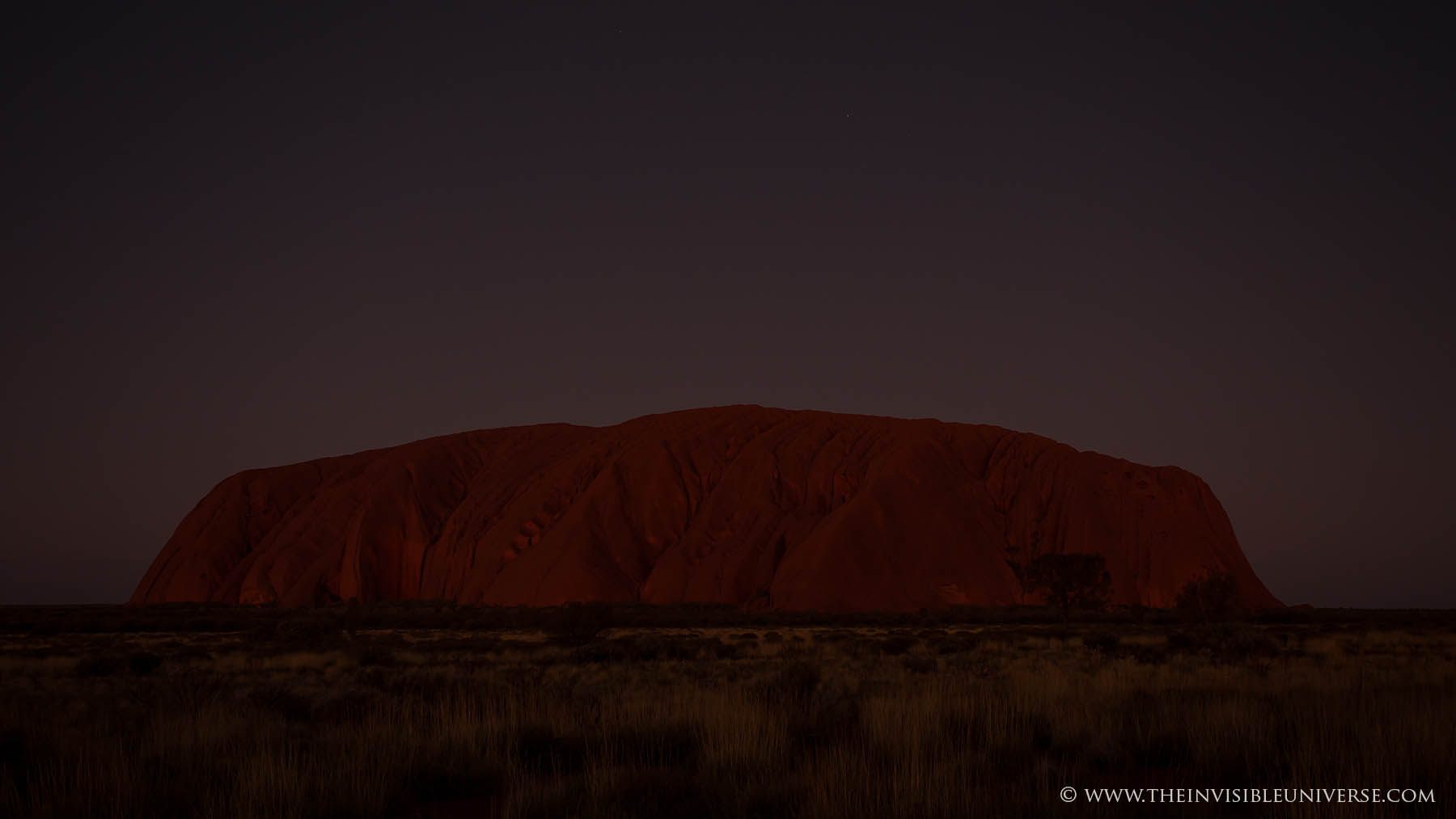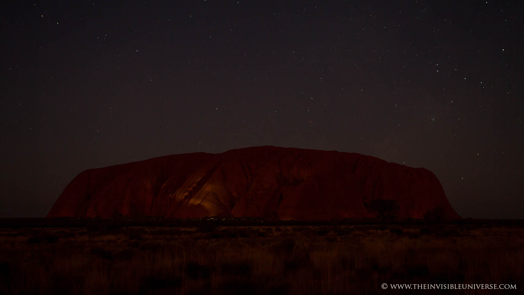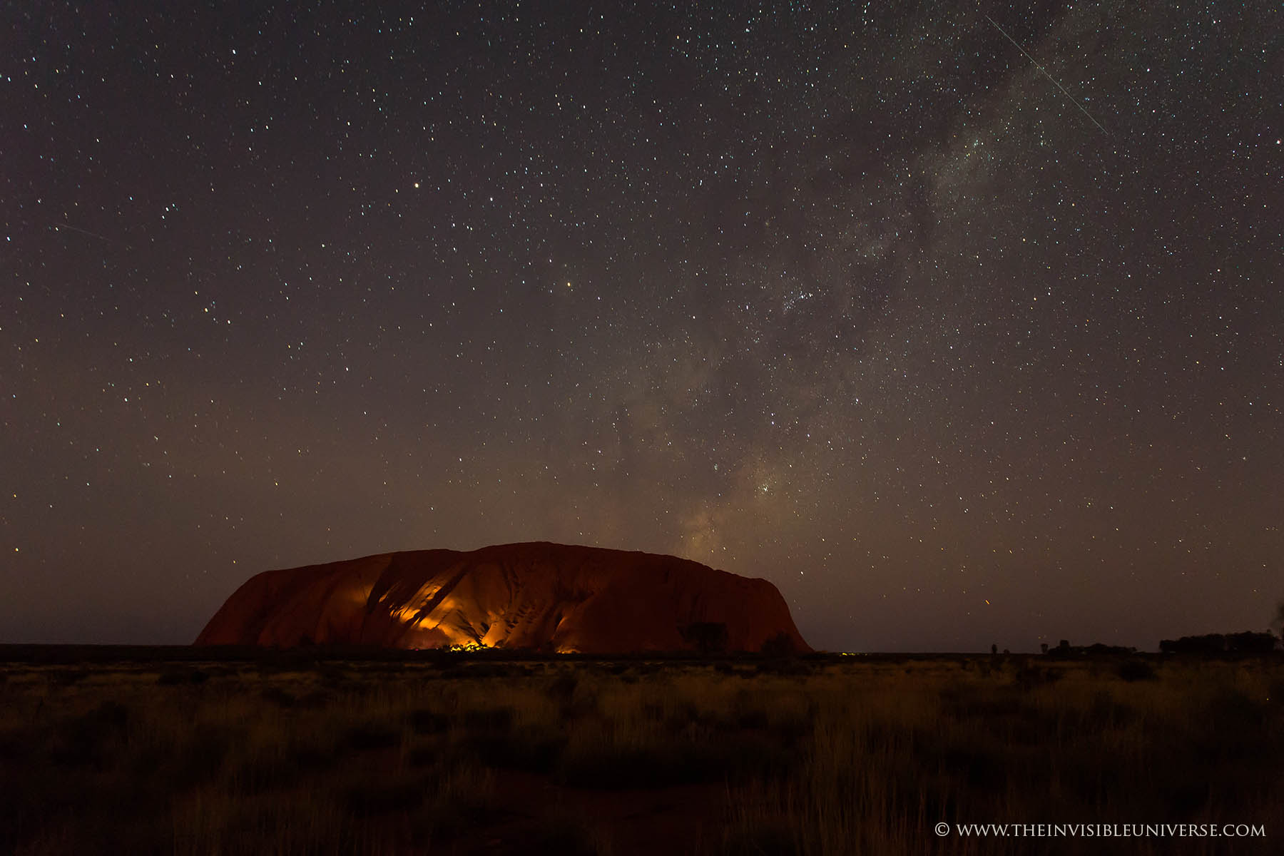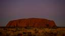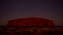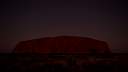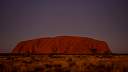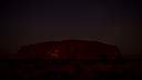 Im Bild rechts: das Zentrum der Milchstraße mit den Sternbildern Schütze und Skorpion geht über dem Ayers Rock auf. Die Dämmerung ist noch nicht beendet und die Umgebung ist noch zu sehen.