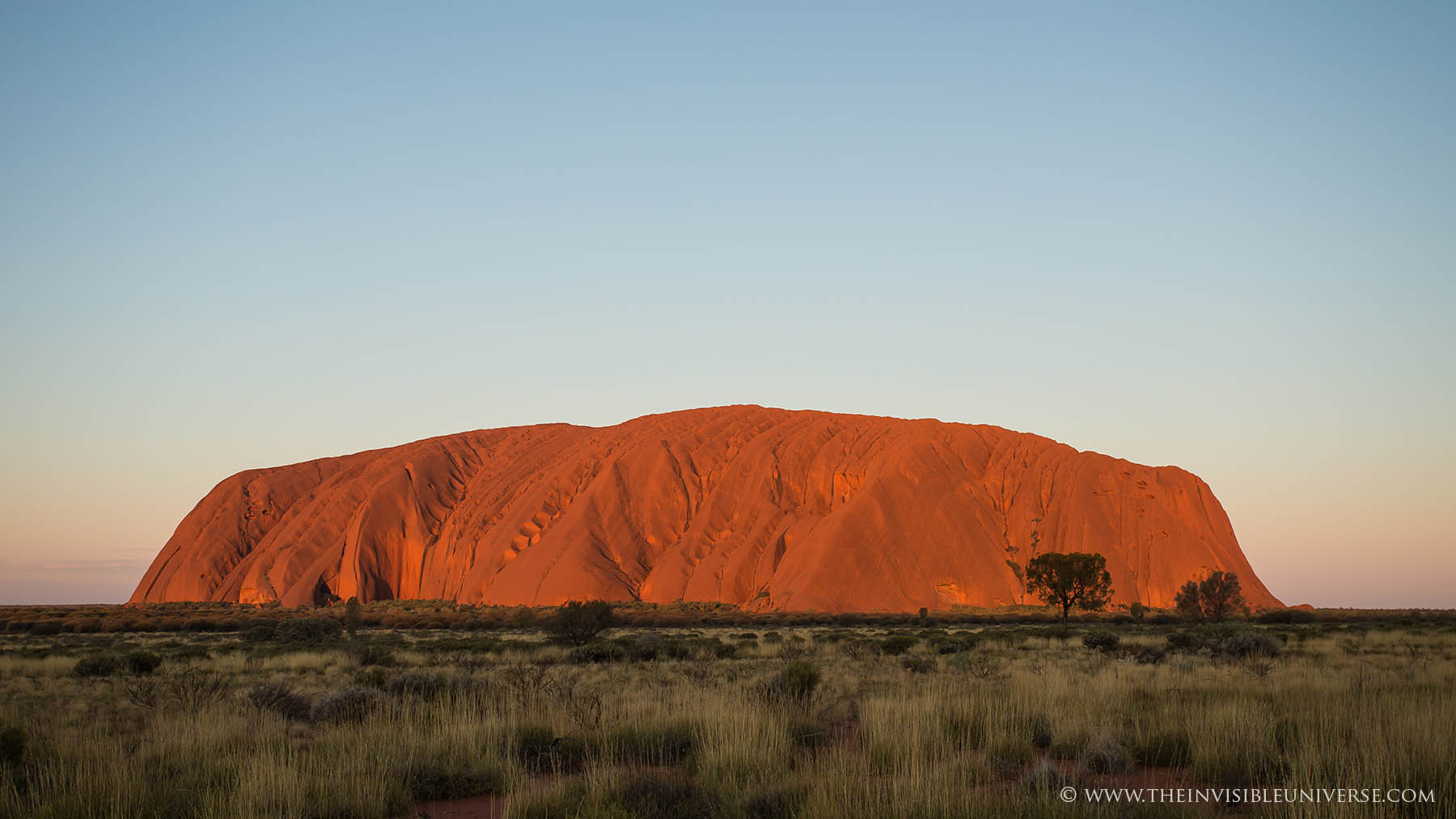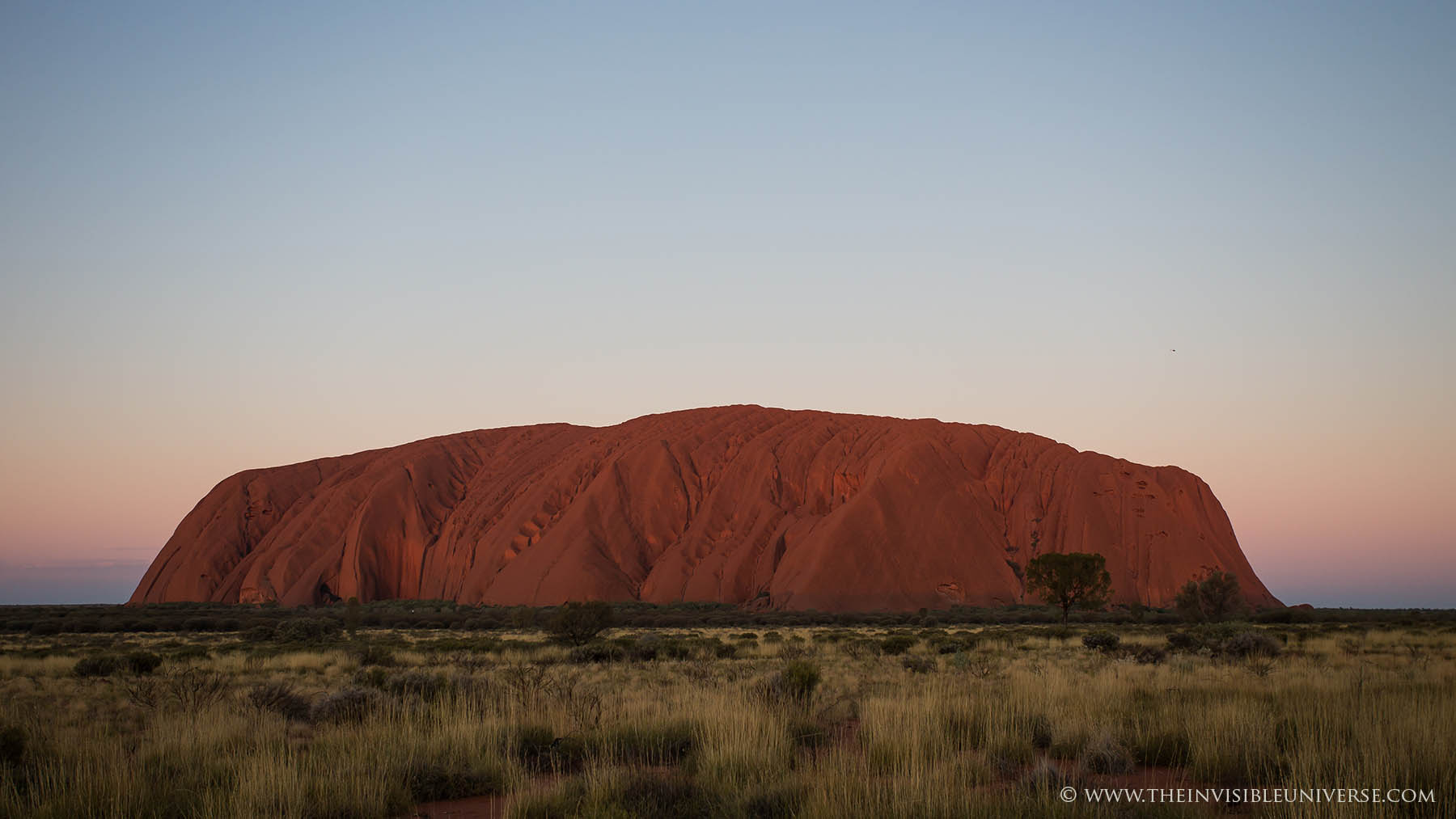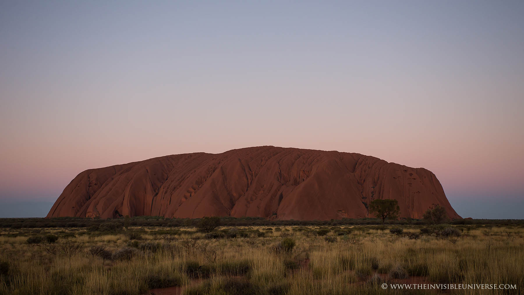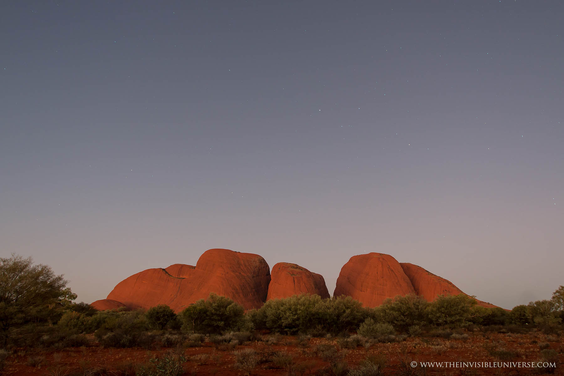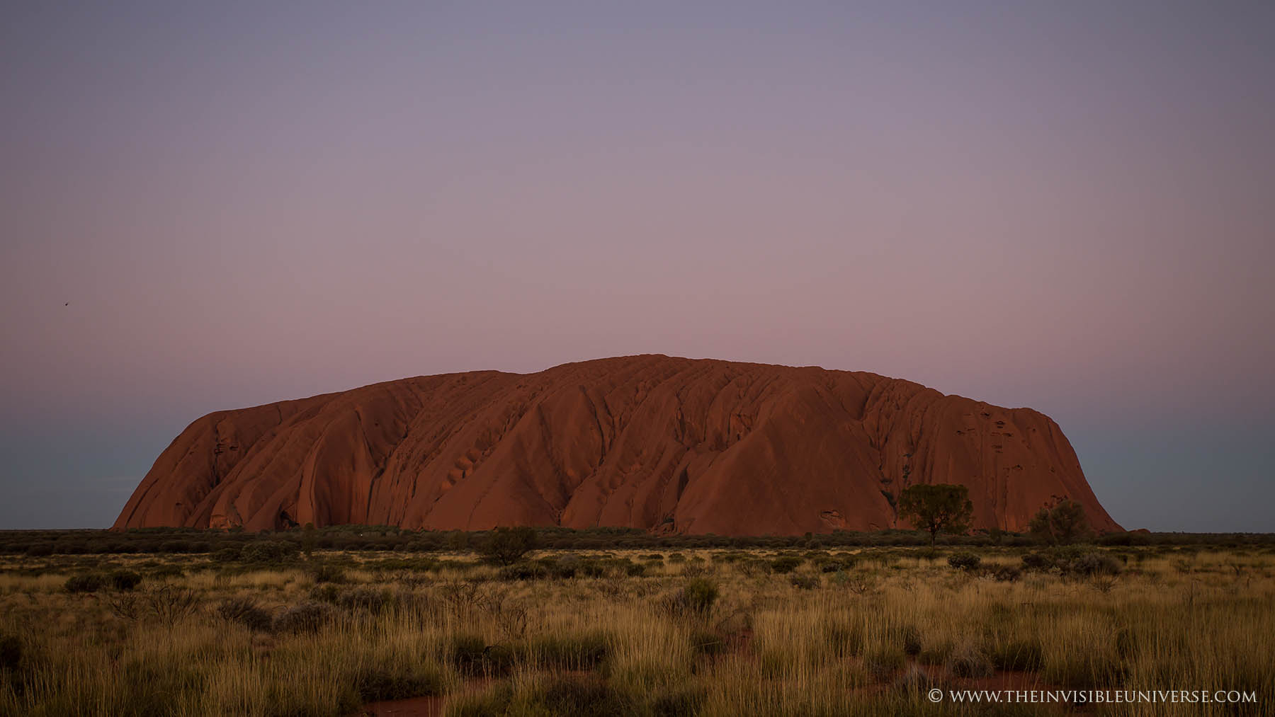 Im Bild rechts: das Zentrum der Milchstraße mit den Sternbildern Schütze und Skorpion geht über dem Ayers Rock auf. Die Dämmerung ist noch nicht beendet und die Umgebung ist noch zu sehen.
