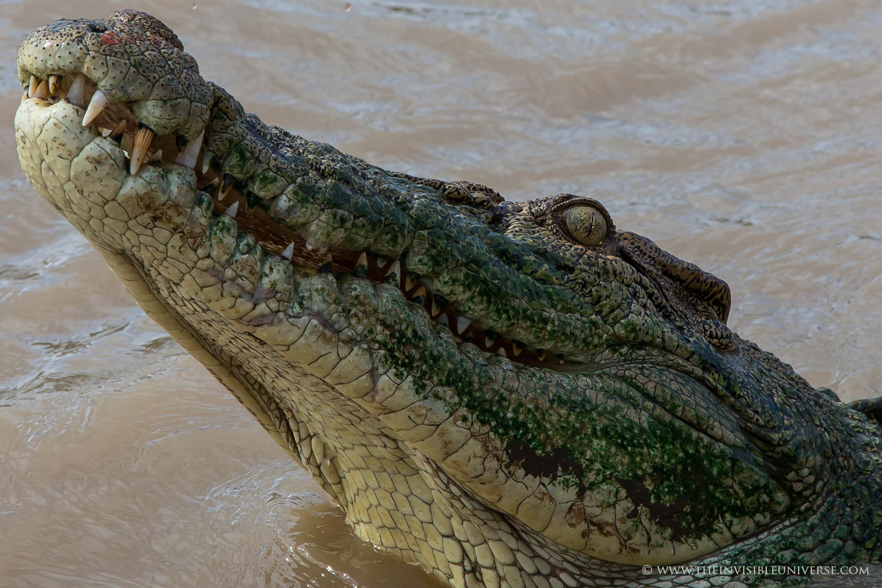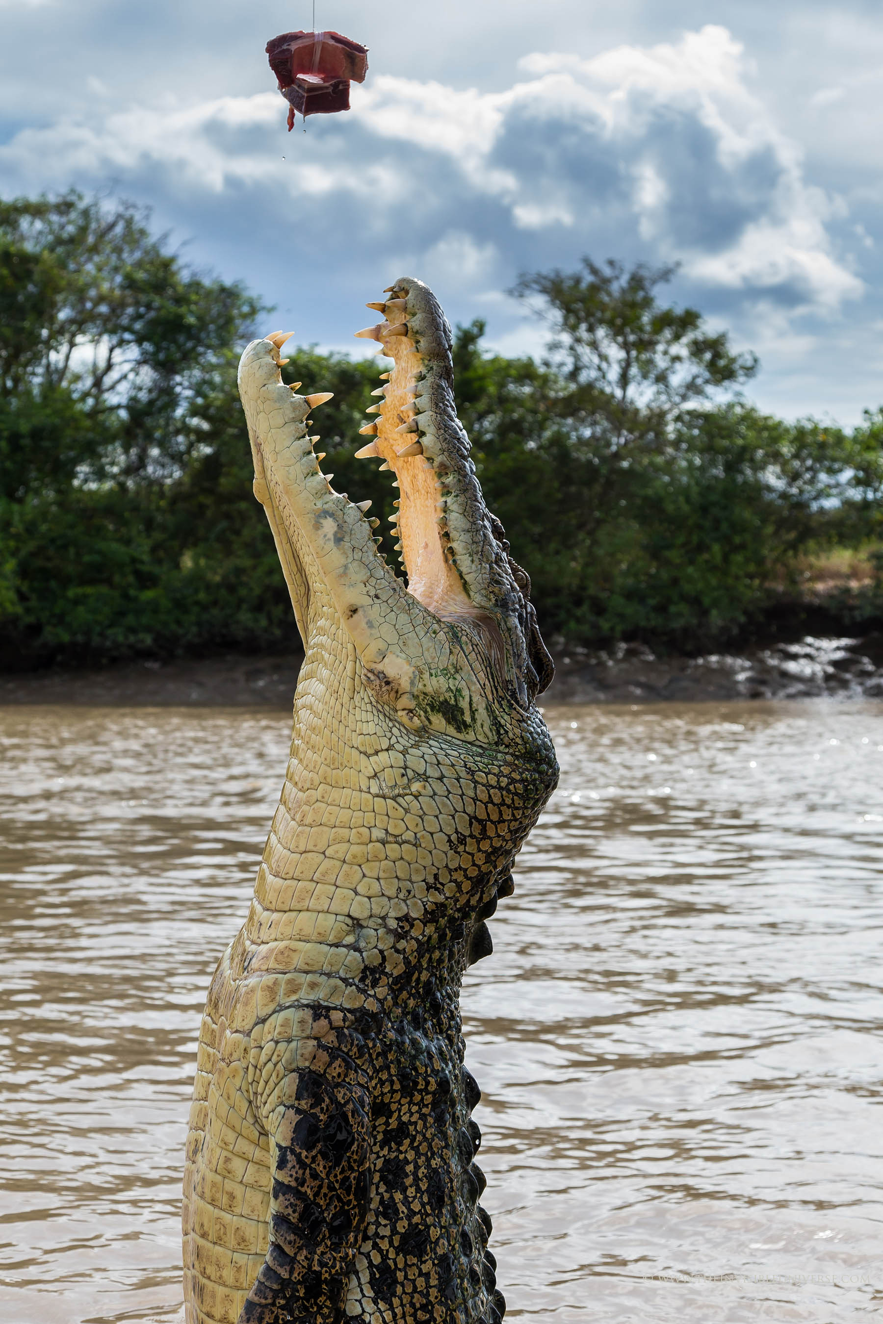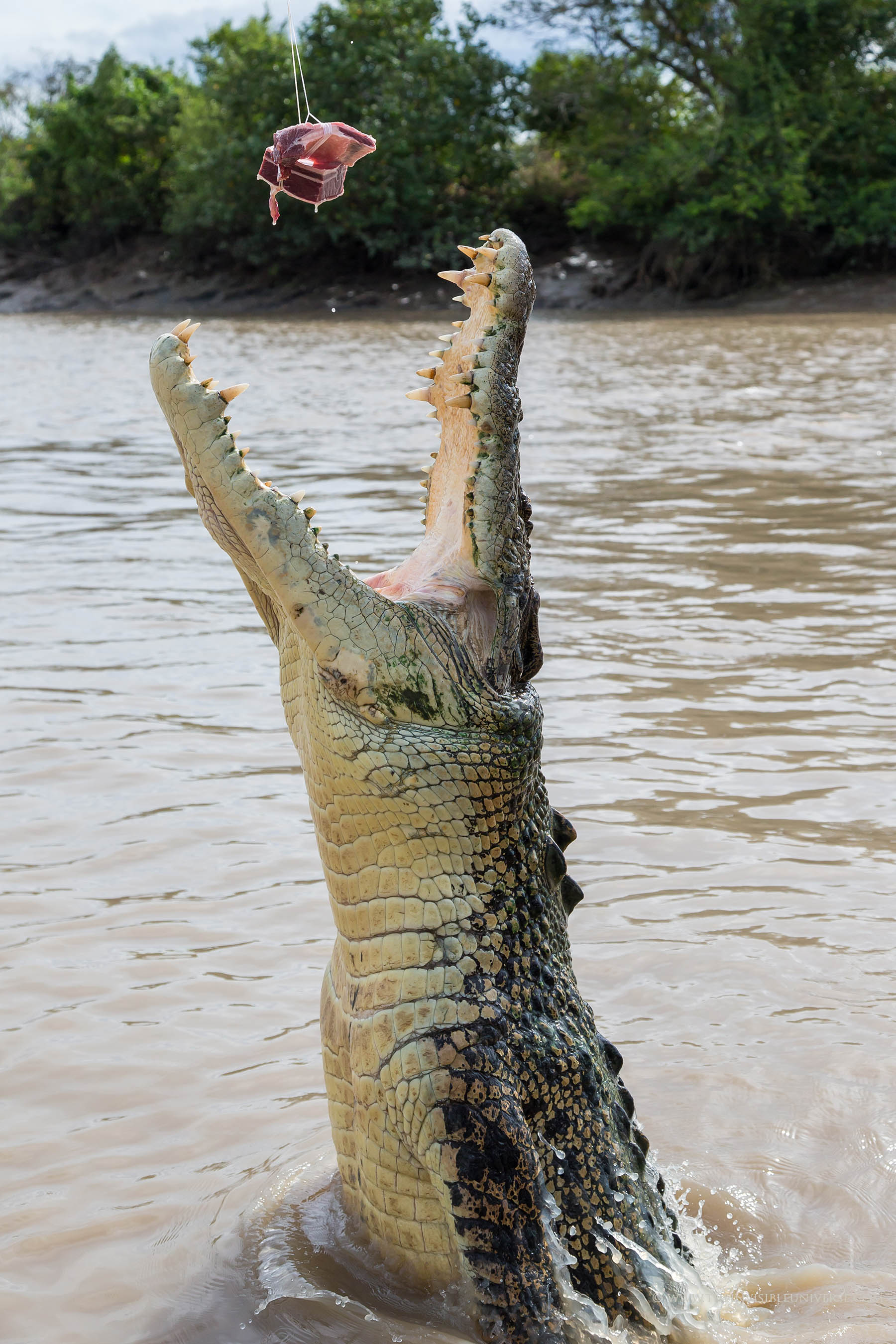 Jumping Crocodile Tours am Adelaide River: Hautnah erlebt man wie riesige bis zu 6 Meter große wild lebende Salzwasserkrokodile bis zu ihrer halben Länge aus dem Wasser springen um nach Beute zu schnappen. Einzigartig auf der Welt!