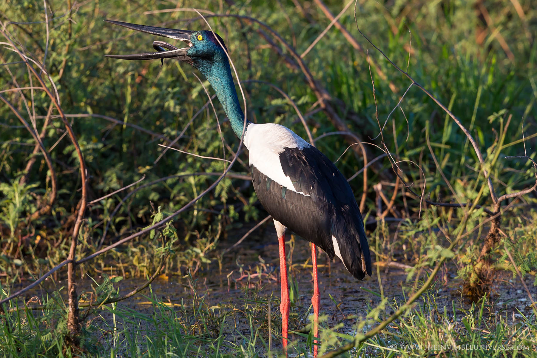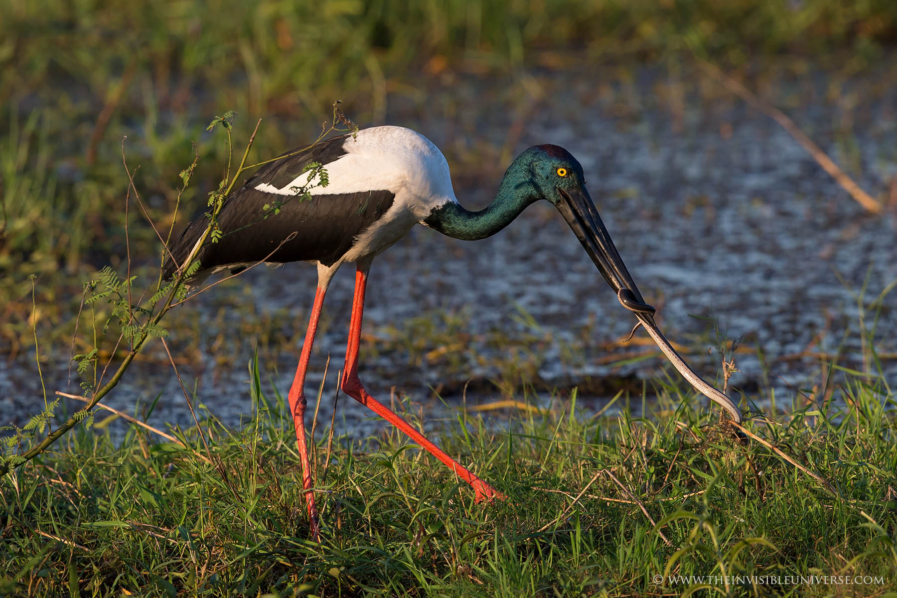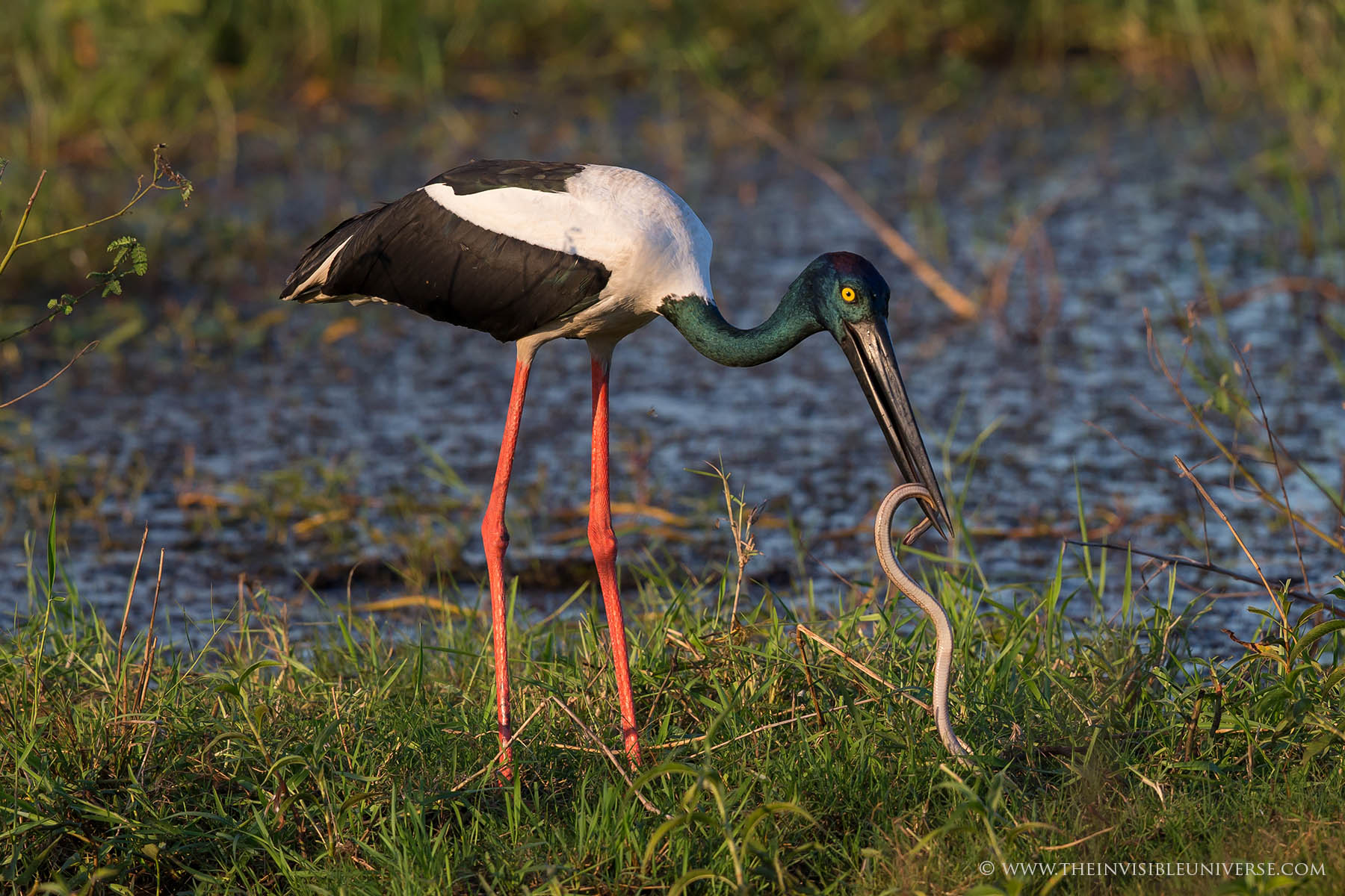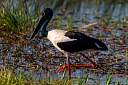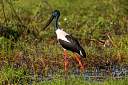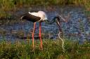 Ein Jabiru, oder auch Black Necked Stork, hat eine Schlange gefangen und versucht sie herunterzuschlingen. Gar kein einfaches Unterfangen, da die Schlange sich heftig wehrt. Gut 10 min. ist der Storch mit der Schlange beschäftigt, bis er sie schließlich am Kopf zu fassen bekommt und innerhalb von Sekunden in einem Stück herunterschluckt.