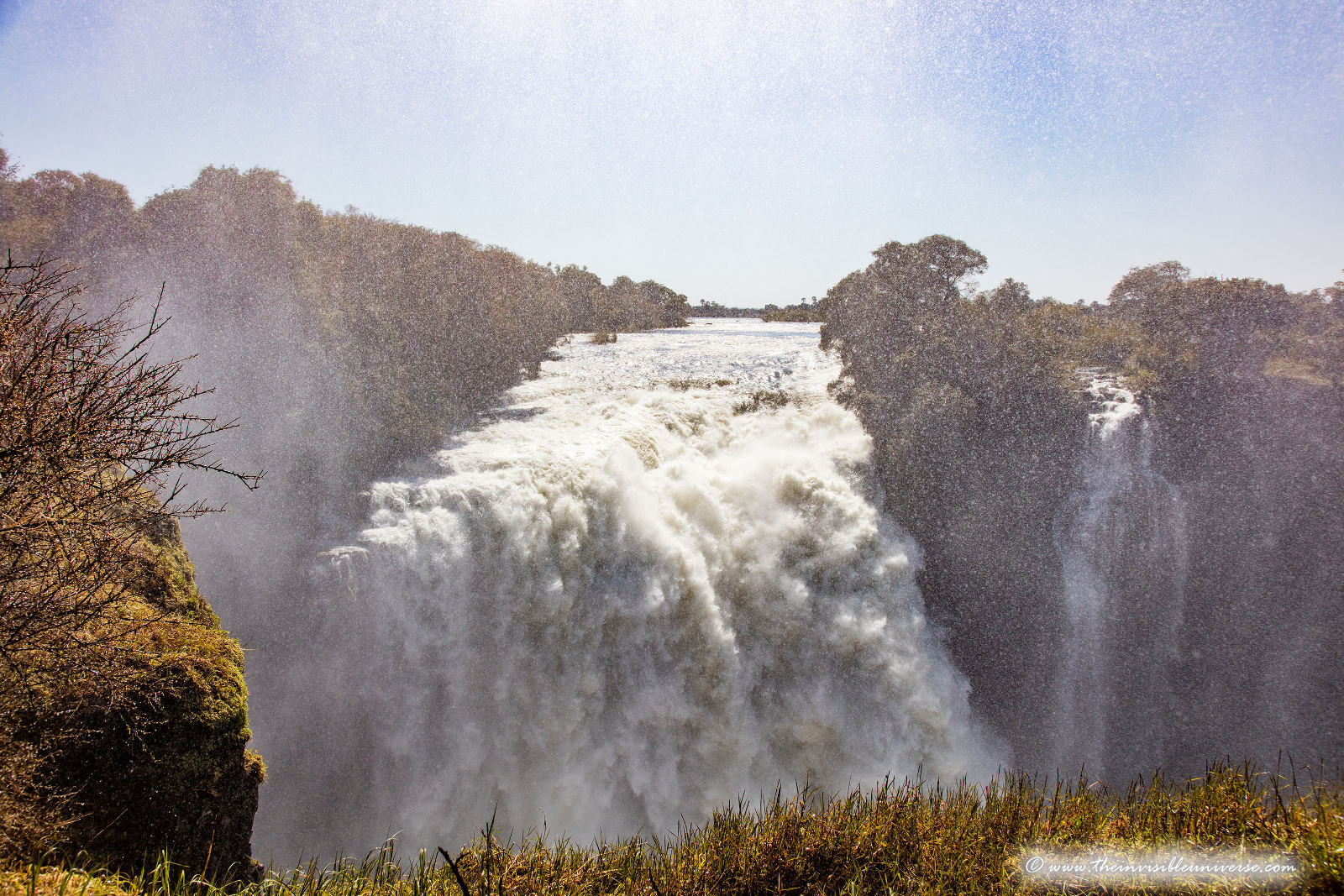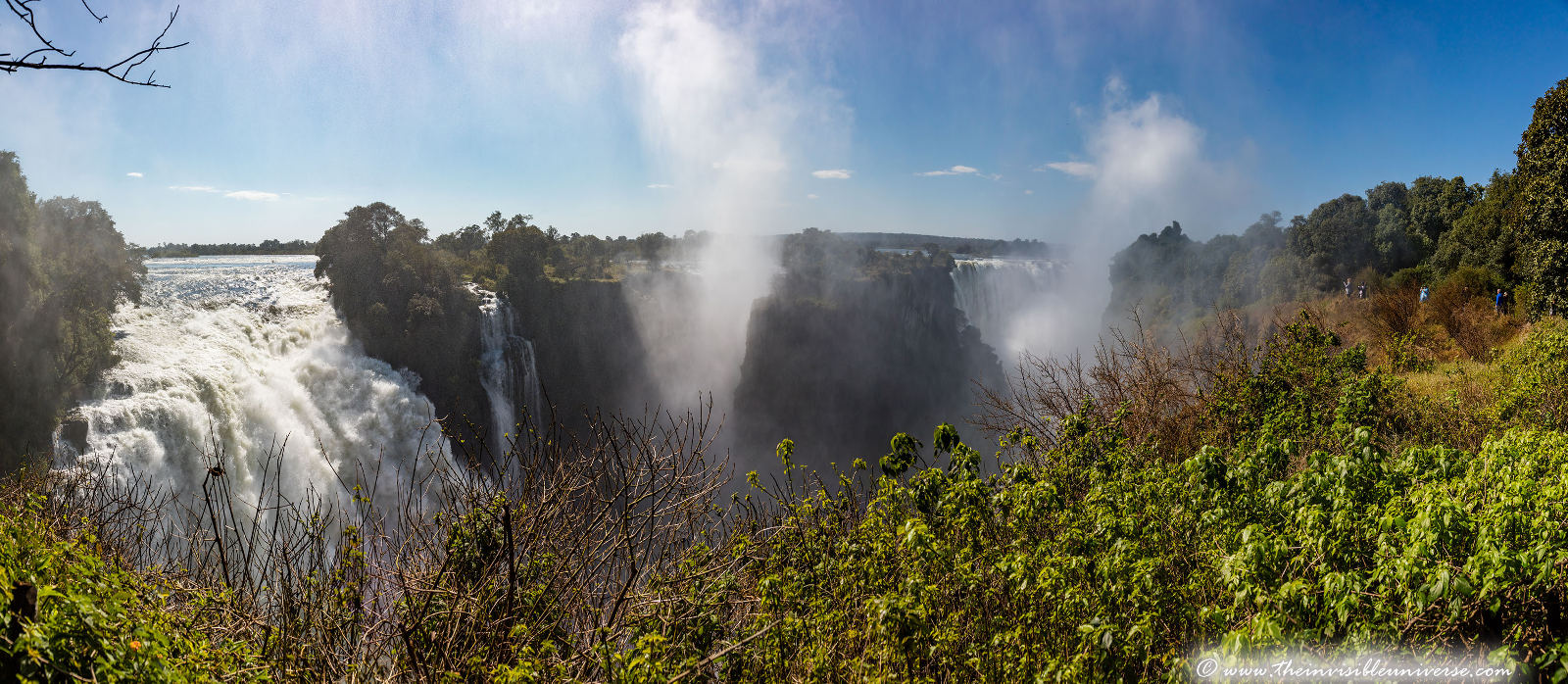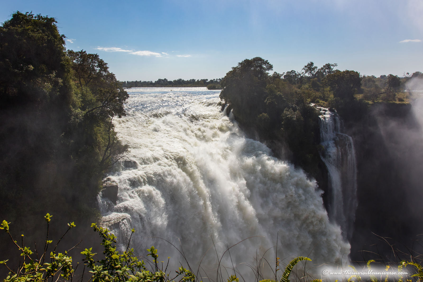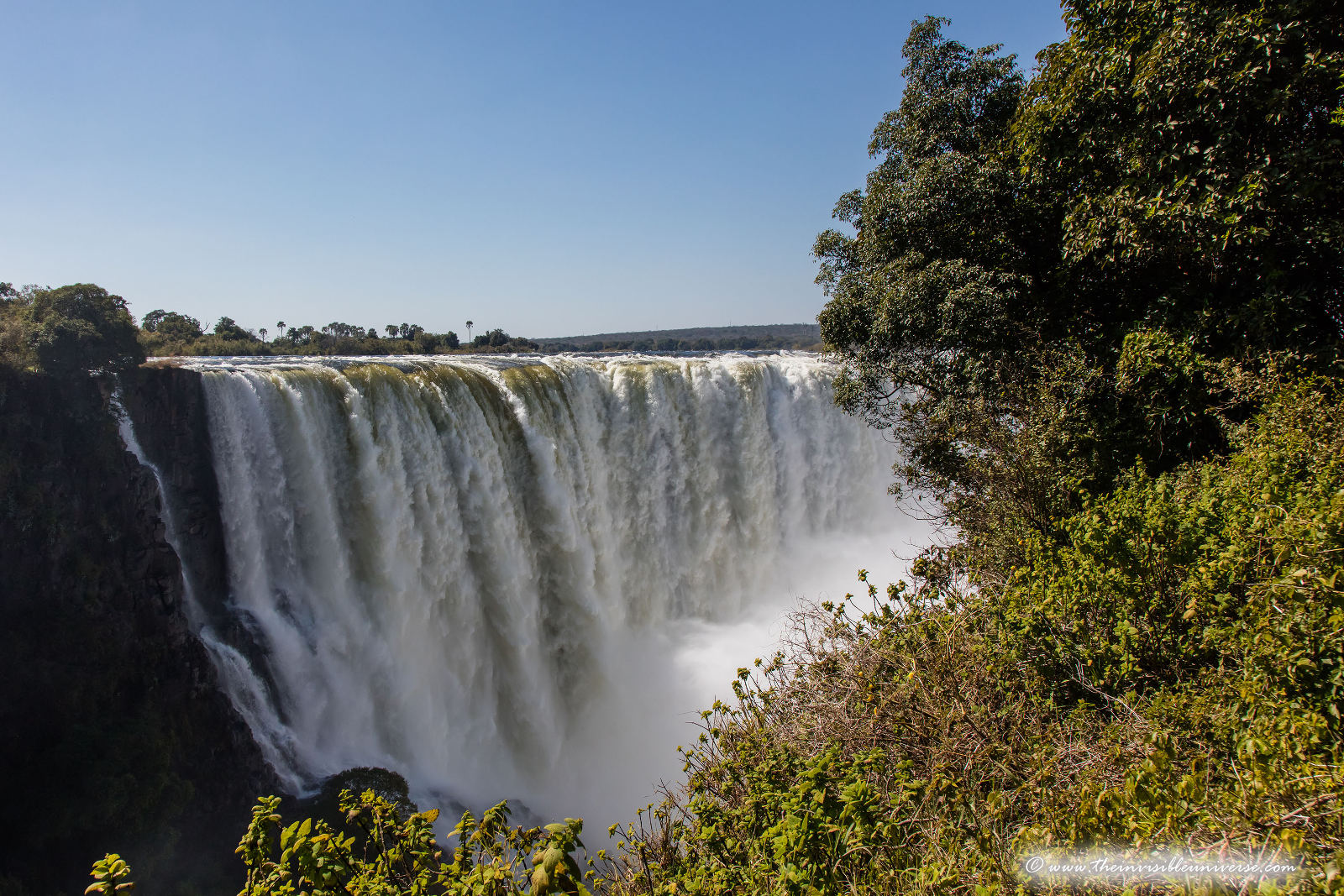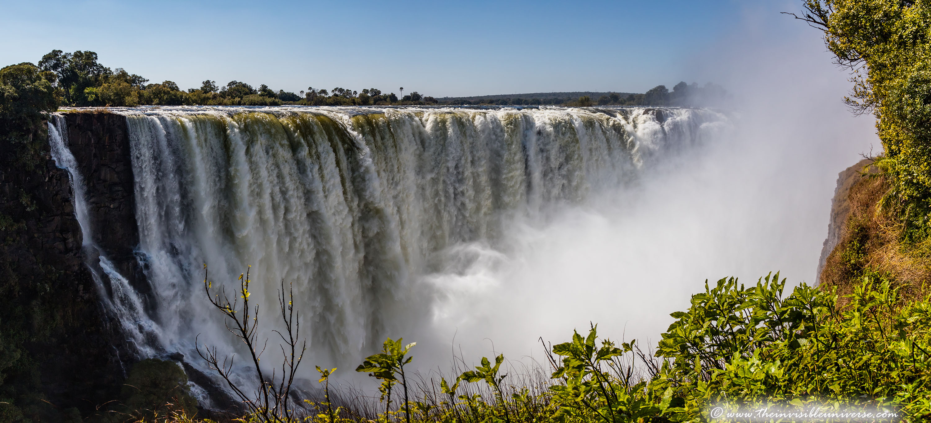Unten: die Main Falls der Victoria Fälle, photographiert vom Victoria Falls National Park in Zimbabwe.