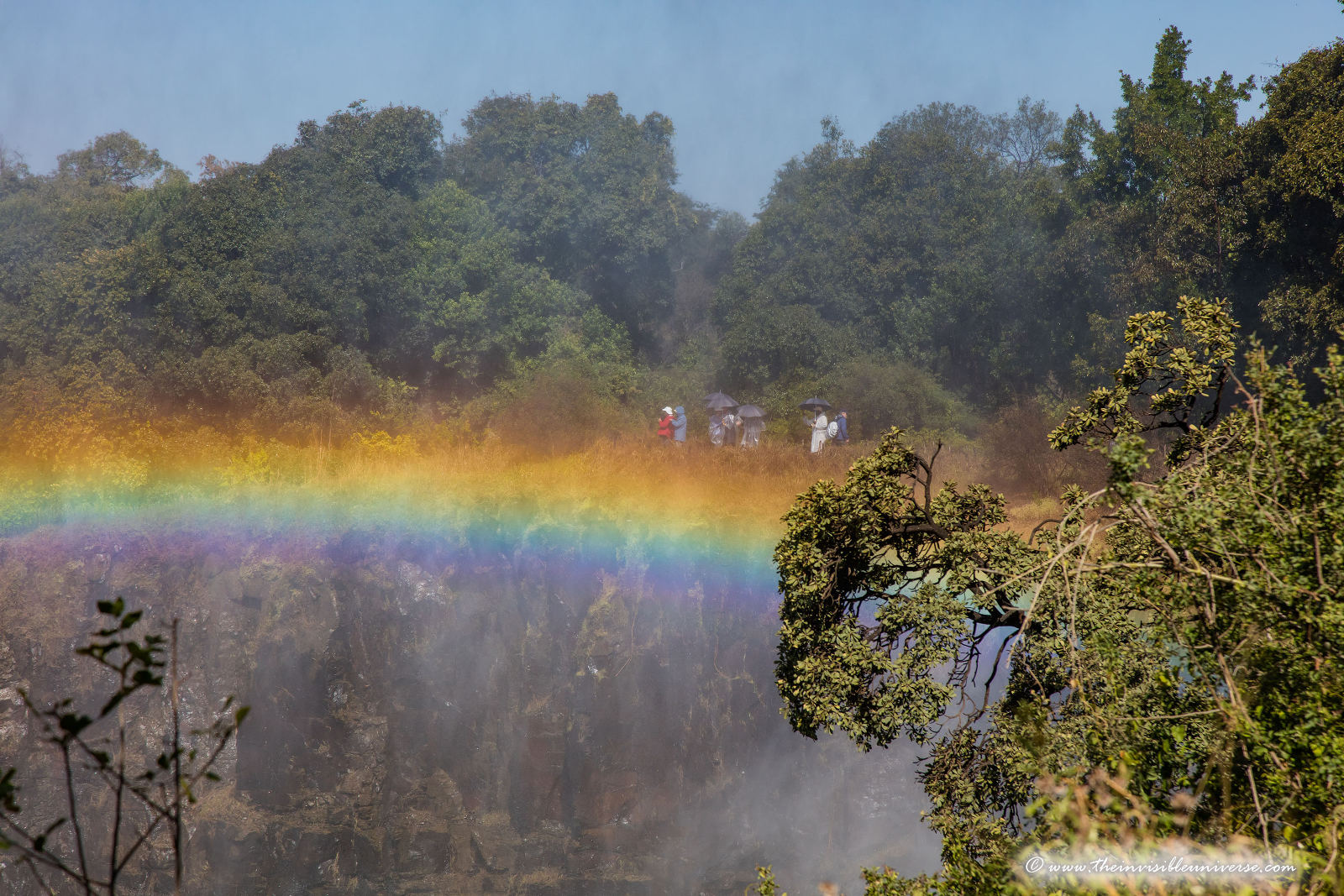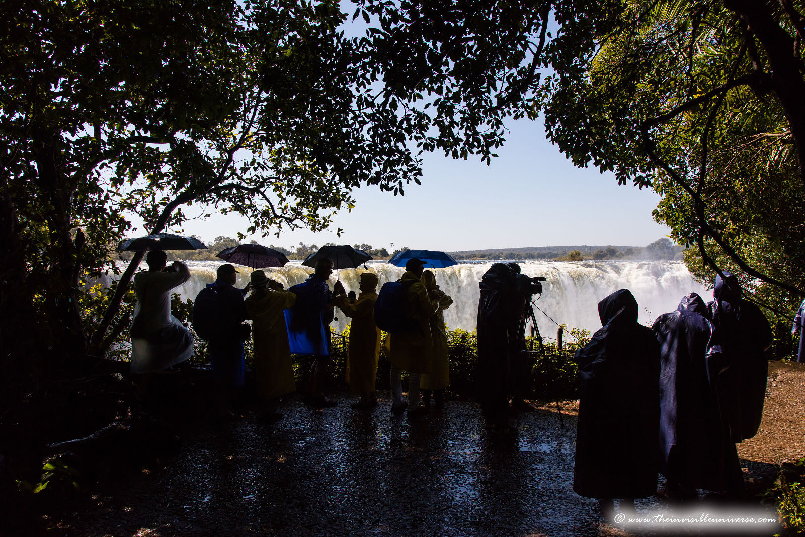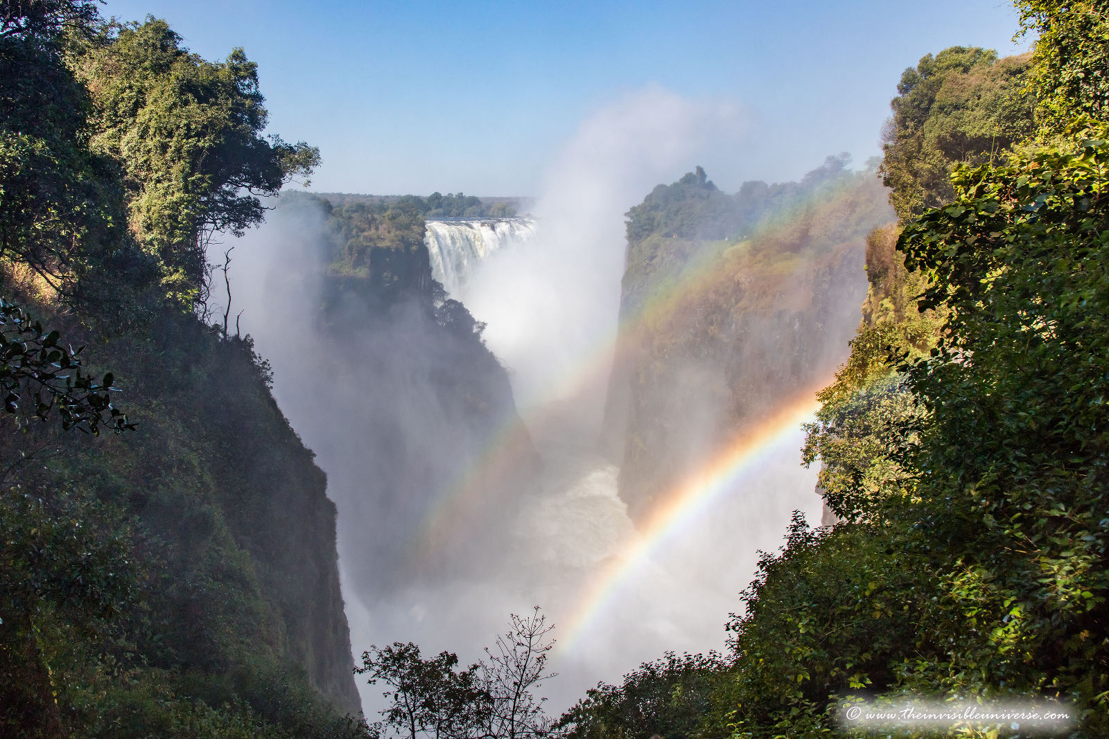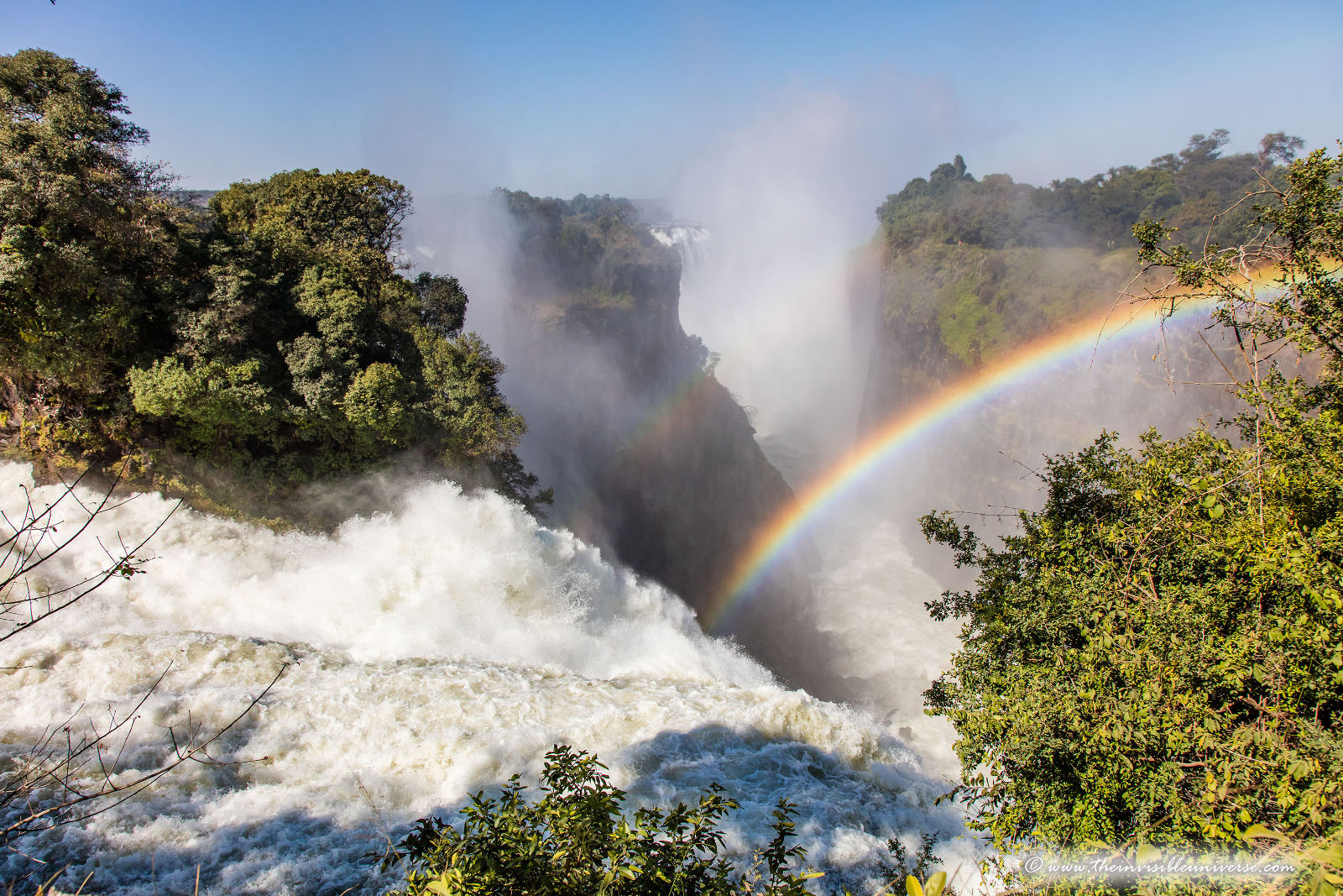 Unten: die Main Falls der Victoria Fälle, photographiert vom Victoria Falls National Park in Zimbabwe.
