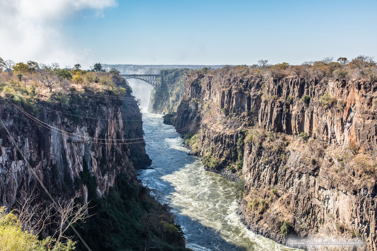 Die berühmten Victoria Fälle an der Grenze zwischen Simbabwe und Sambia, hier auf der Seite von Simbabwe. Solche tosenden Wassergewalten habe ich vorher nur an den Niagara Fällen in den USA gesehen. Hier an den Victoria Fällen, wo der Sambesi in die Tiefe stürzt und in einer engen Schlucht weiter zum Meer fließt, ist im Gegensatz zu den Niagara Falls rundherum noch Natur und Grün. Nach dem Frühjahrshochwasser führt der Sambesi enorme Wassermassen, und die hochgeschleuderte Gischt spritzt alles in der Nähe nass. Meine Kameras bekommen auch eine Dusche ab, aber die robuste Canon-Profitechnik hält.