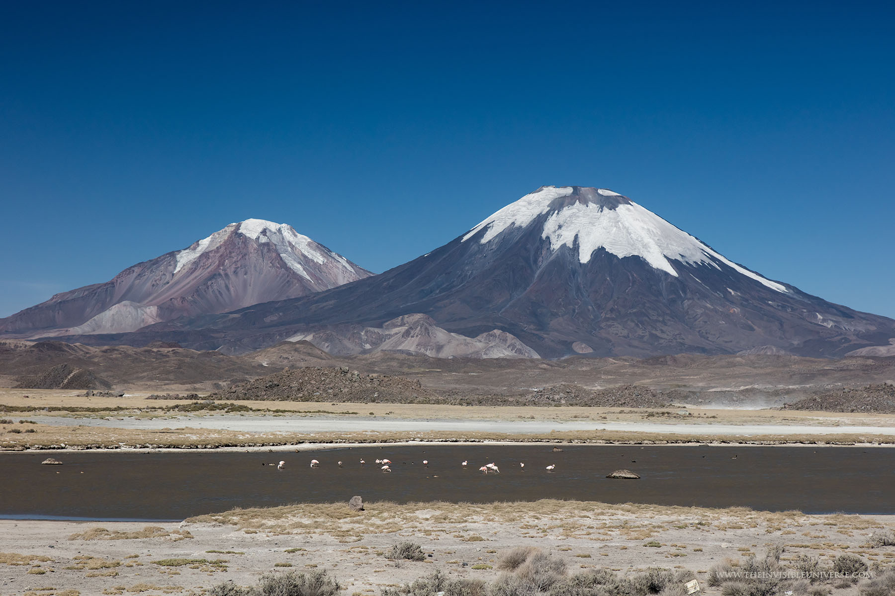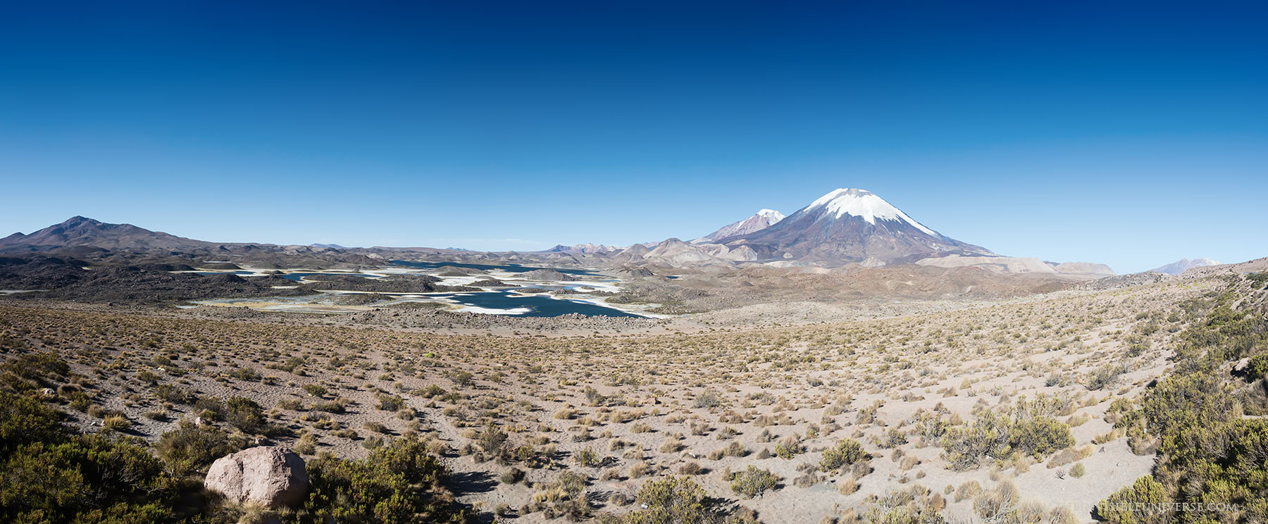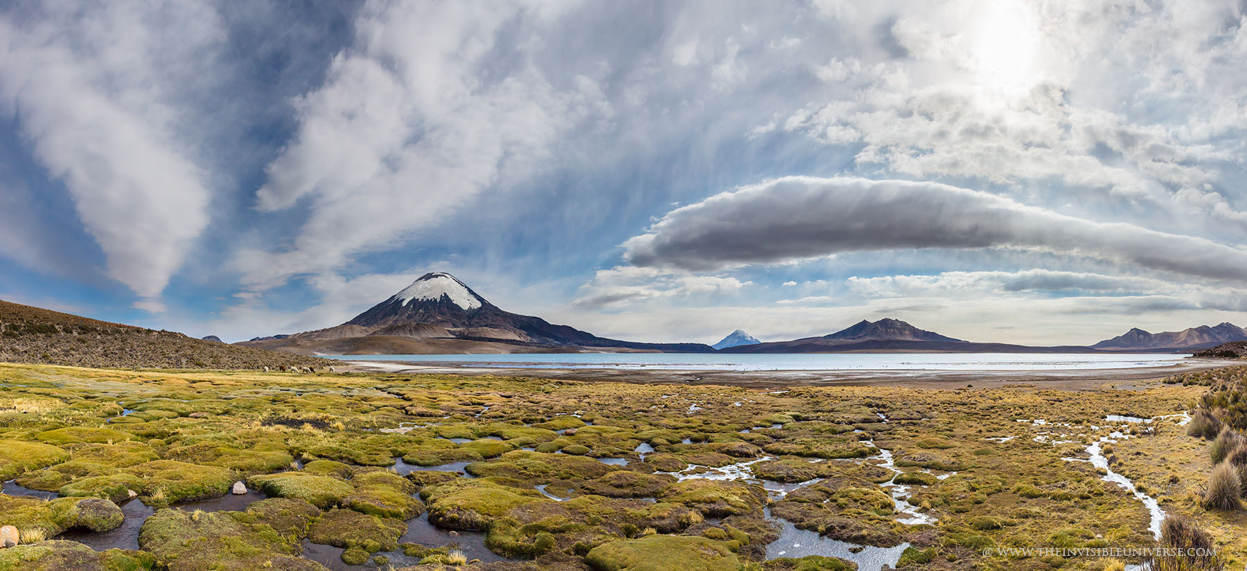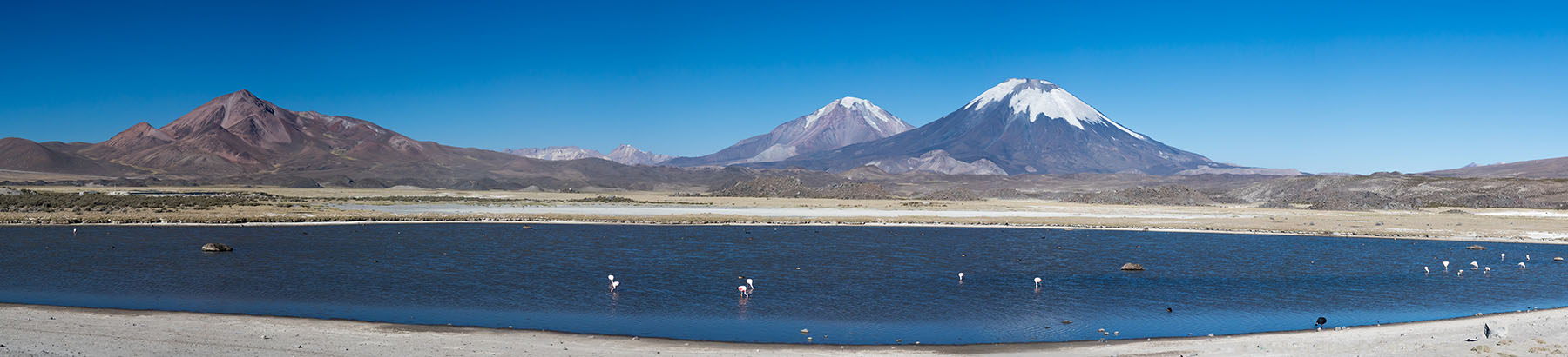 Im Lauca Nationalpark hat man wirklich herrliche Ausblicke auf die umliegenden Vulkane, speziell den Pomerape und den Parinacota, die zusammen auch Payachatas genannt werden und über 6000 Meter hoch sind. Der Lago Chungara ist einer der höchstgelegenen Seen und von dort hat man den besten Ausblick auf den Parinacota, der direkt im Grenzgebiet zu Bolivien liegt. Neben den vielen LKWs wird man dort aber selten Touristen treffen dafür umso mehr Lamas und Alpakas, sowie auch die wild lebenden Vicunas. Andenflamingos sind auch in dieser extremen Landschaft zu Hause. Sie weiden Algen in den salzhaltigen Lagunen ab. Der nahe Rio Lauca speist viele kleine Tümpel, die sog. Bofedales, mit Wasser und schafft damit ein eigenes Ökosystem.