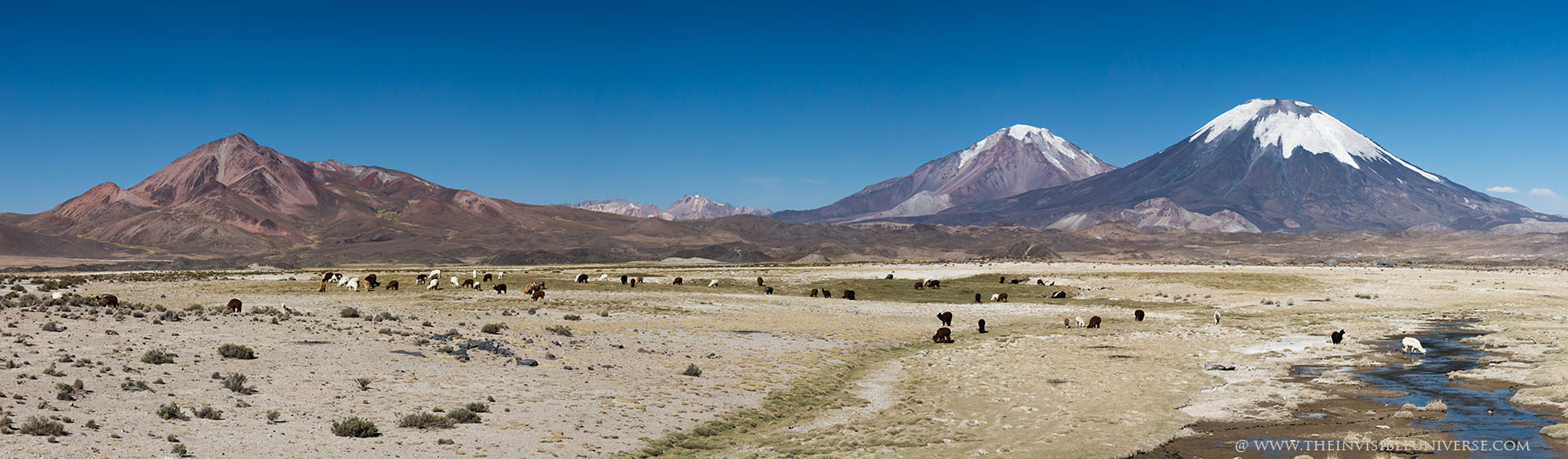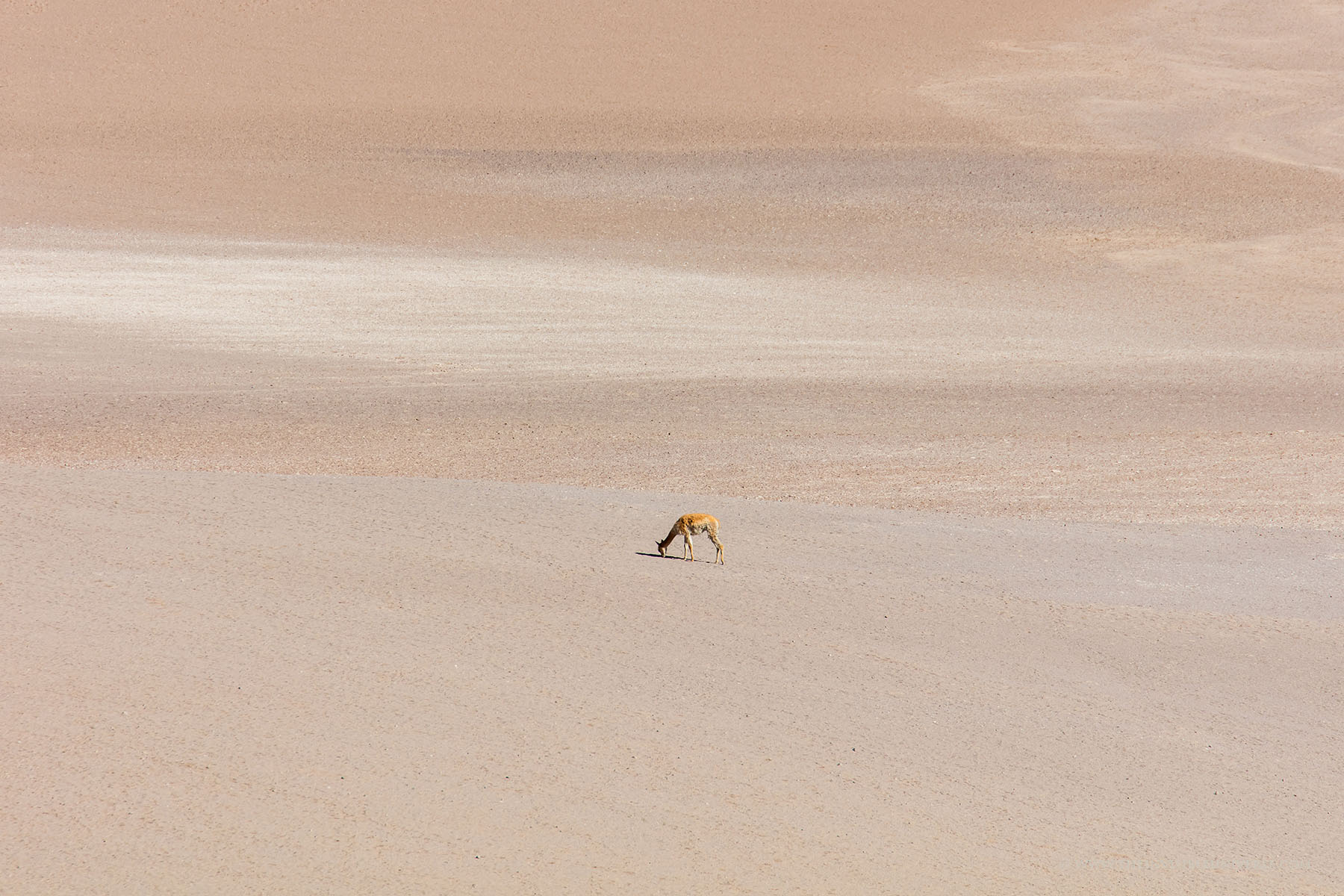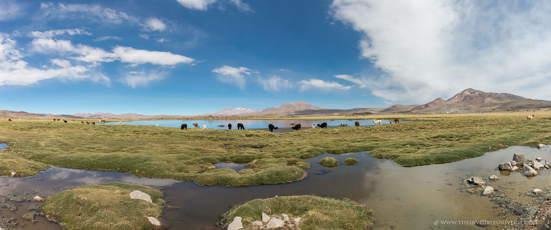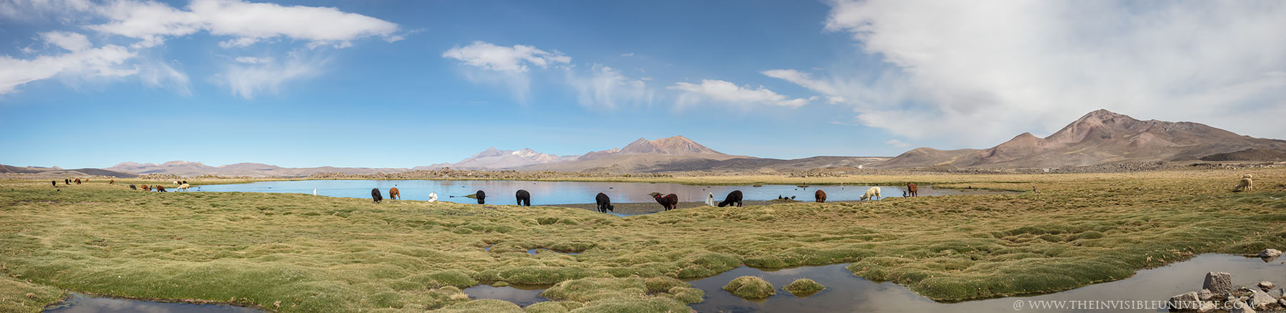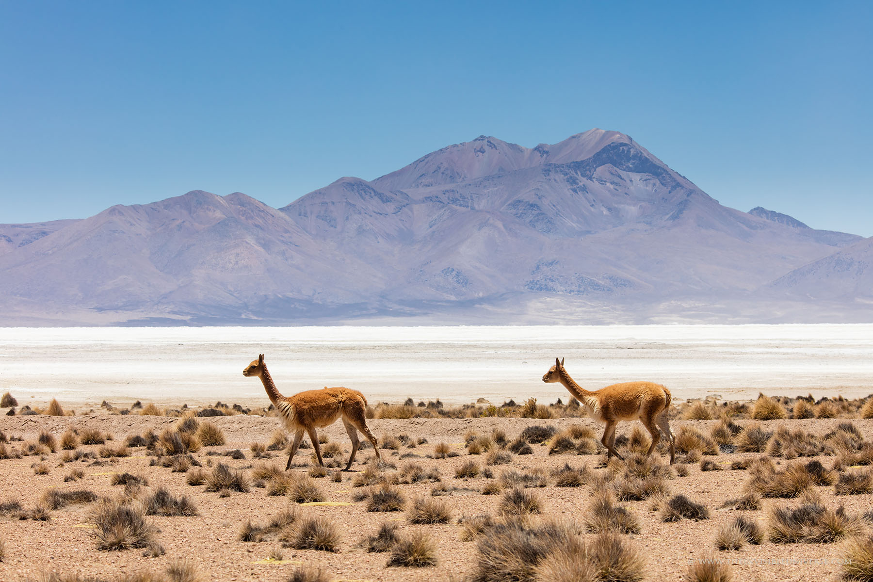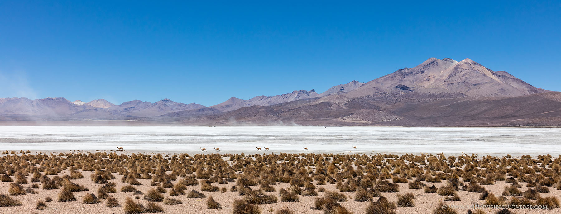 Oben: der Salar de Surire, eine große Salzpfanne im nördlichen Altiplano. Wild lebende Vicunas streifen über die gleißen helle Ebene auf dem Weg zur nächsten Wasserstelle.