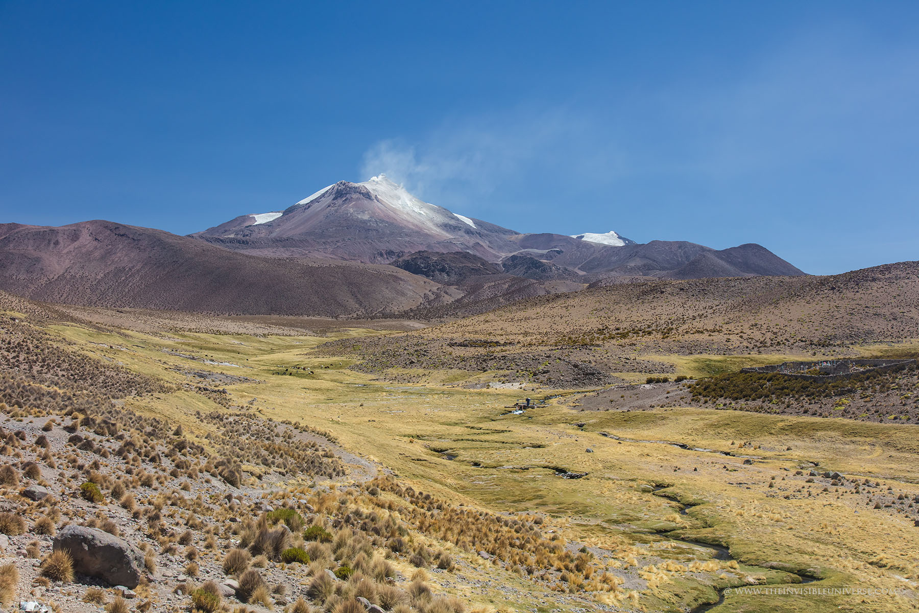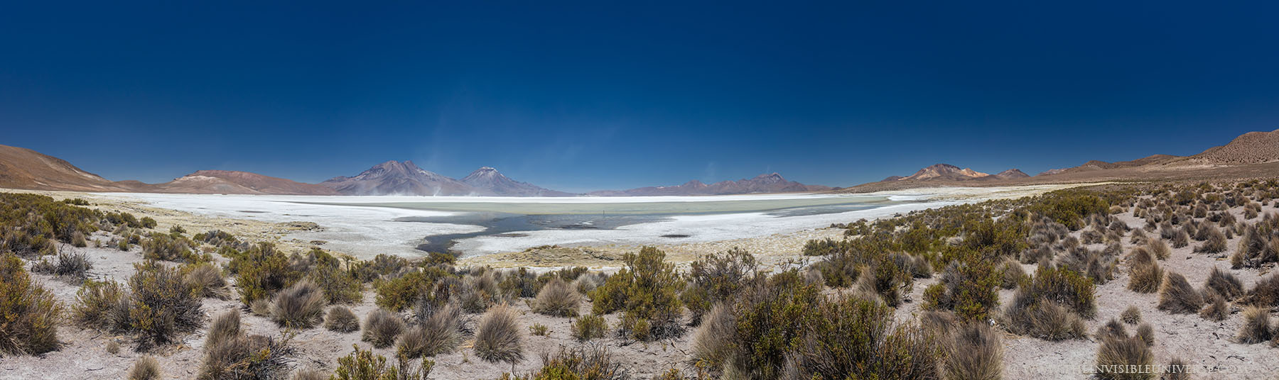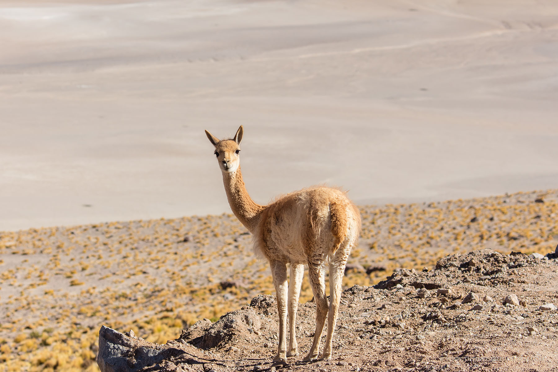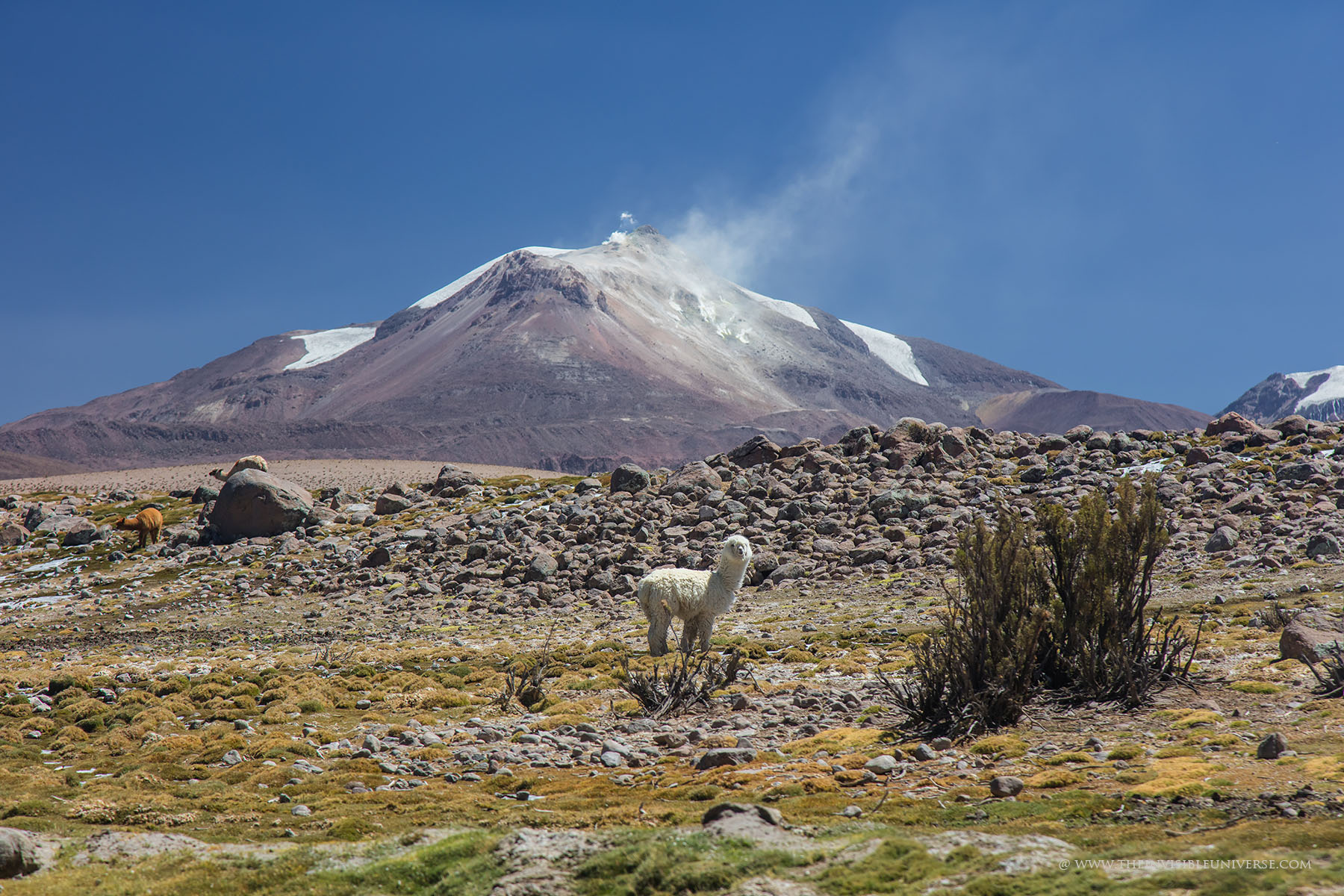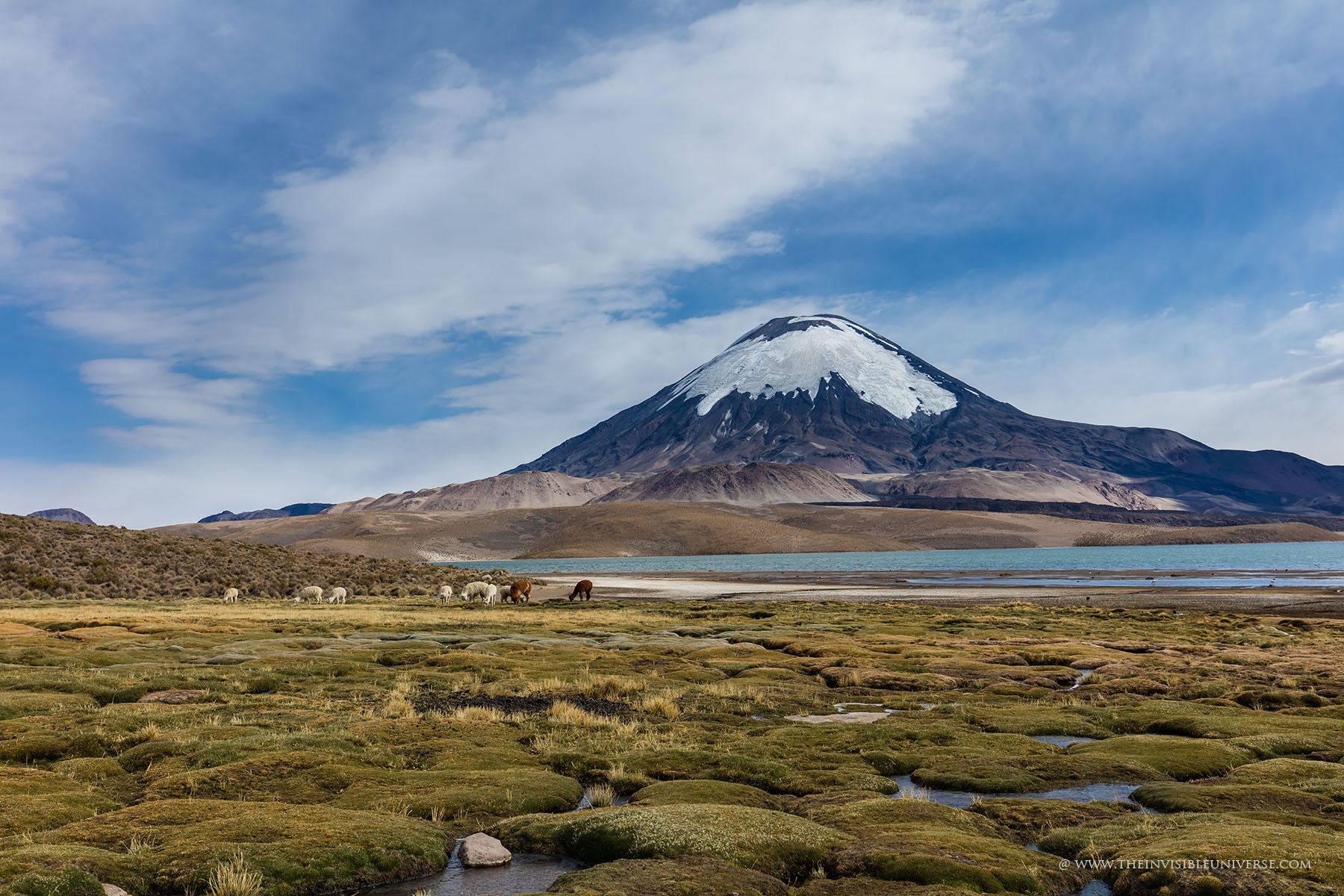 Oben: der Salar de Surire, eine große Salzpfanne im nördlichen Altiplano. Wild lebende Vicunas streifen über die gleißen helle Ebene auf dem Weg zur nächsten Wasserstelle.